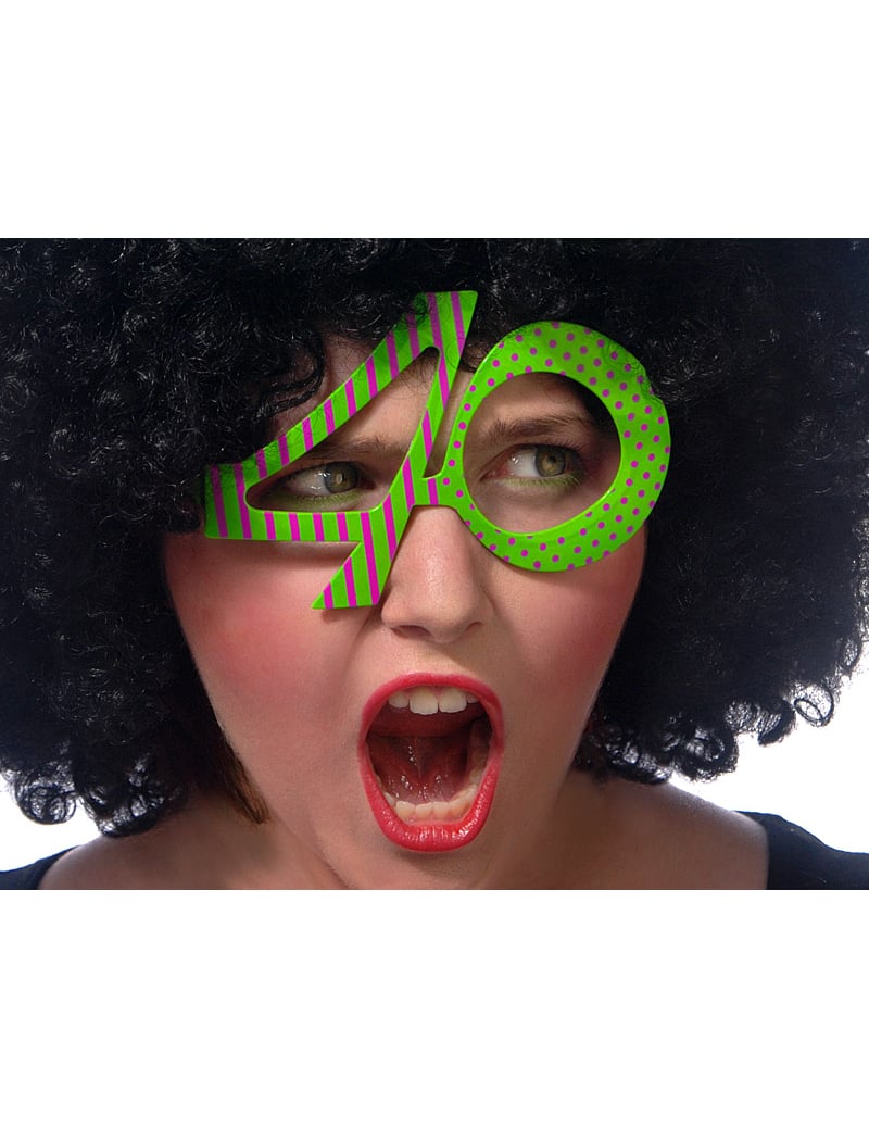 Този чифт очила е за възрастни. Той е в твърда пластмаса и представлява фигурата "40". Тези очила са зелени с искрящ и розов грах и са дълги около 14 см. Те ще бъдат идеалният аксесоар, за да премине 40 -годишнината с хумор.