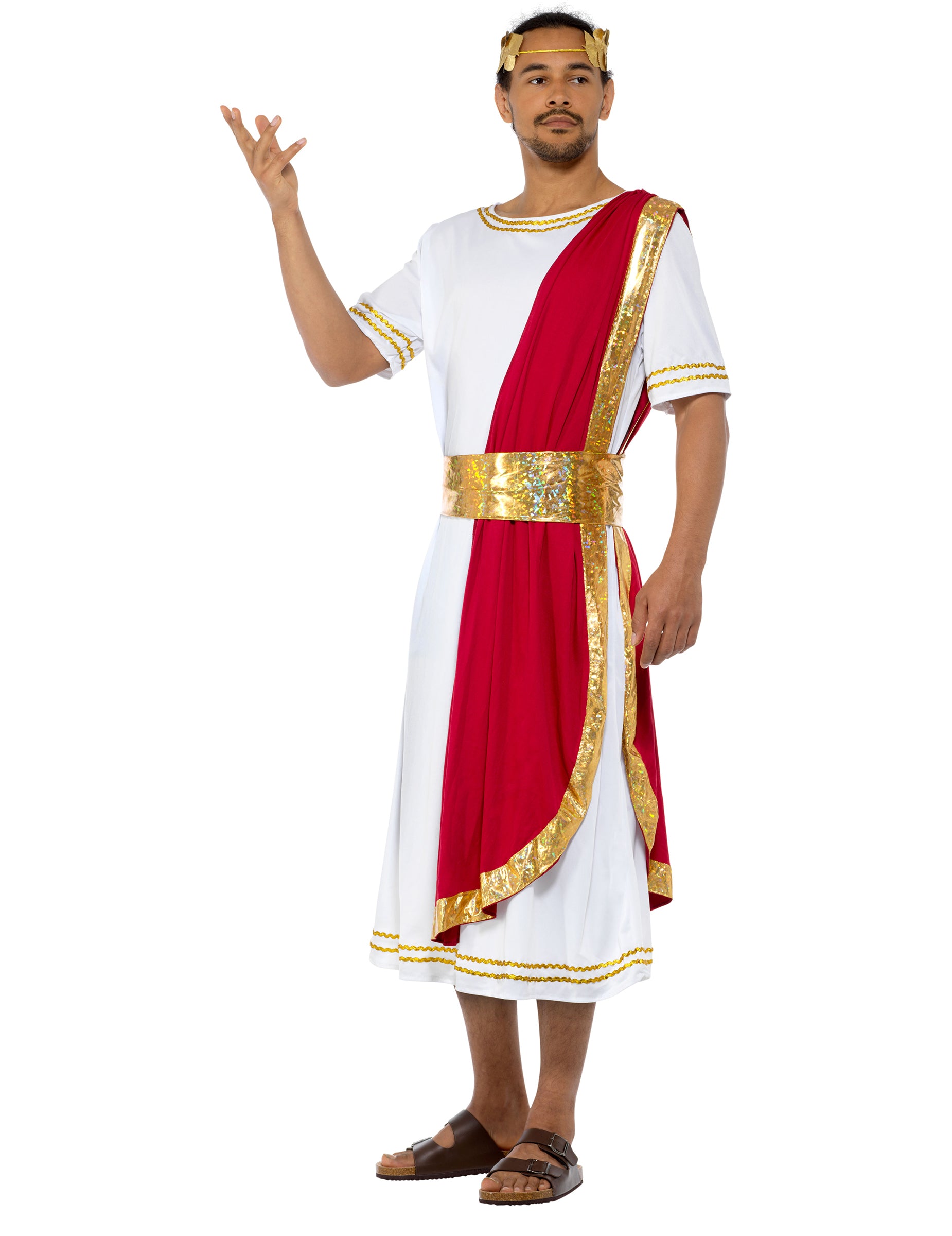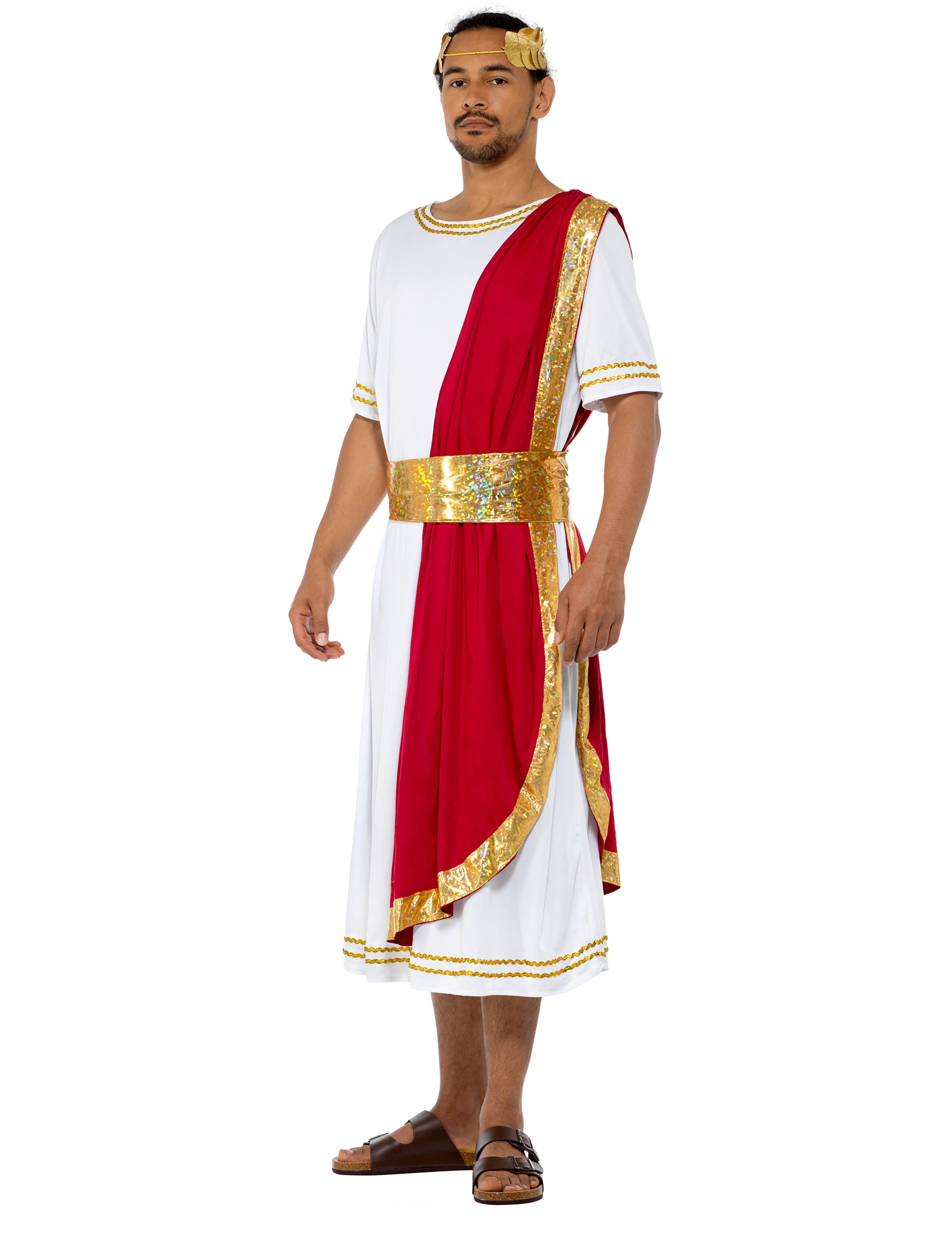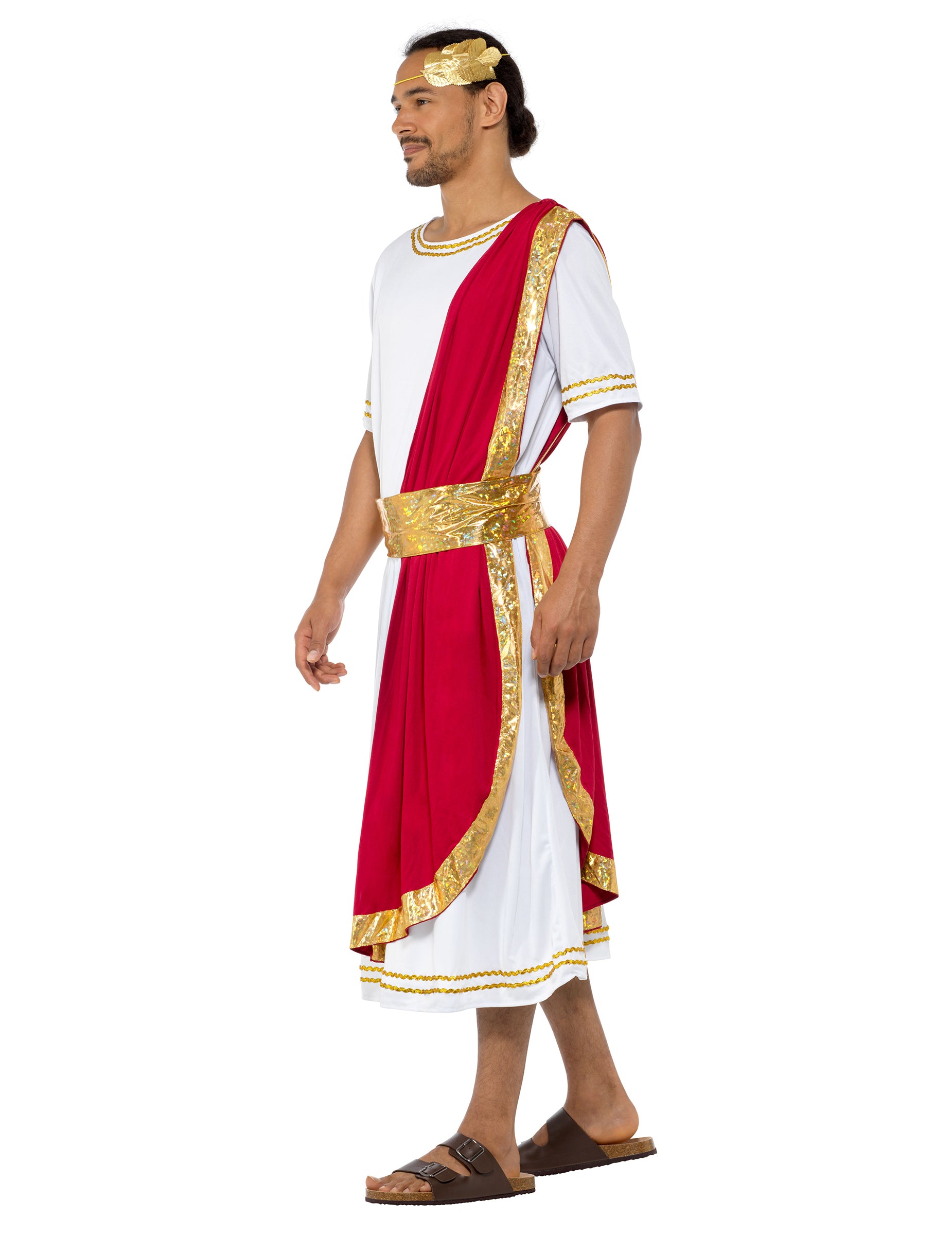 Този костюм на мъжете се състои от туника, колан и шапка. Използвайки традиционните древни токове, бялата рокля с къси ръкави е украсена със златна бродерия в яката, ръцете и дъното. Пристигайки на нивото на прасеца, той върви с бургундски червен тиган, наподобяващ идентичен с римската награда, която се носи като рамо и предлага много реалистично изобразяване! Добавете златната метална капачка, украсена със златни листа на главата, завържете златния колан около кръста и отидете на форума, за да се срещнете с вашите предмети! Бъдете стратег, красноречив и лъскав до вечерите си, прикрити по темата на Peplum и впечатлете приятелите си с този костюм на императора!