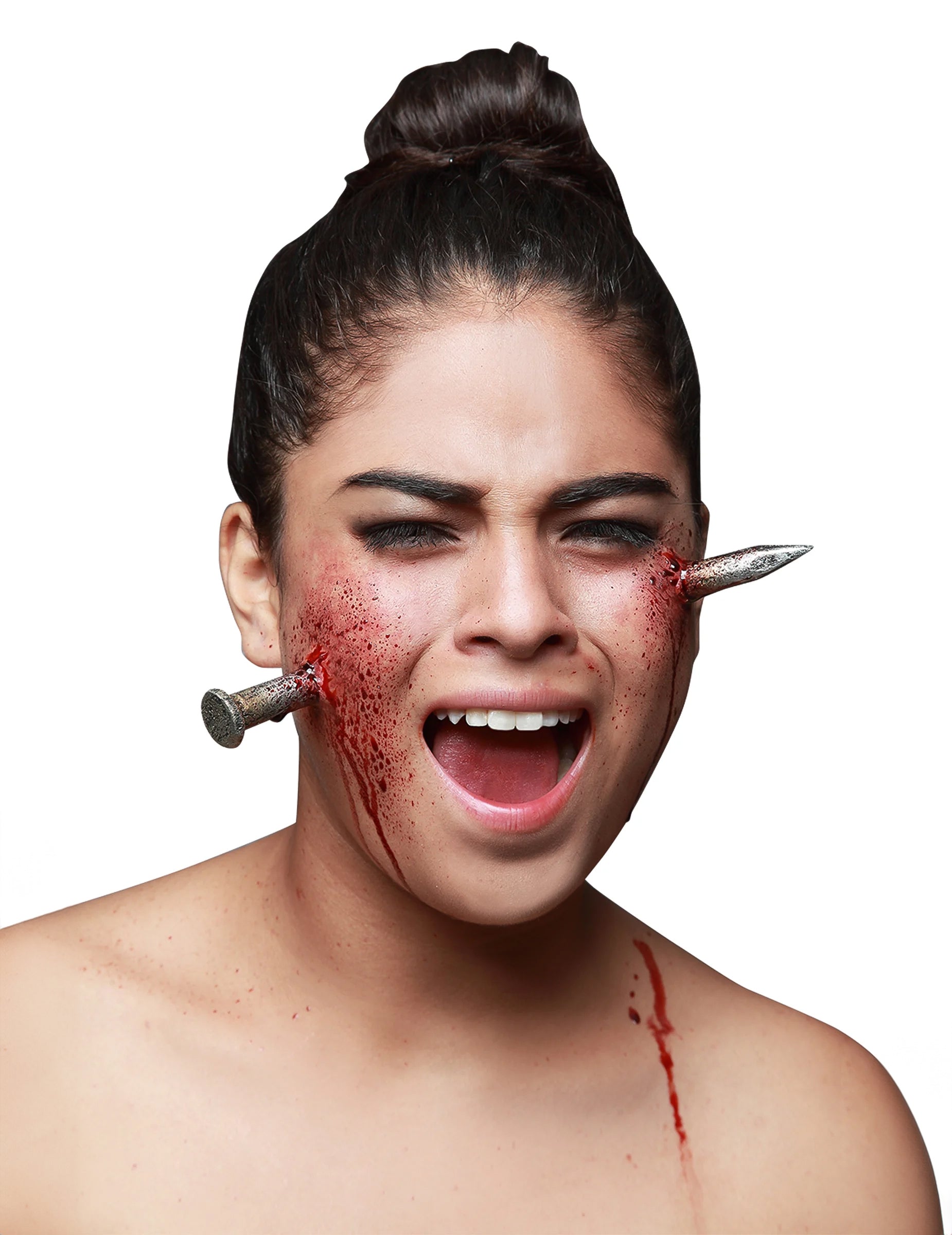 Тази рана се състои от две части от пирон всяка с размери 4 cm. Латексът и впечатляващите детайли дават най -реалистичен ефект: поставени върху всяка буза, двата елемента сякаш пробиват кожата и образуват гигантски пирон! За невероятен резултат нищо не може да бъде по -просто: нанесете лепило или грим дъвка (не е включена) върху частите и ги поставете върху кожата! За още по -естествен ефект съставете контурите с бежови и червени кремове! Покривайки да играем с инструменти, в крайна сметка се нараняваме ... уведомете приятелите си за вашата вечер на Хелоуин, като изложим тази ужасна рана!