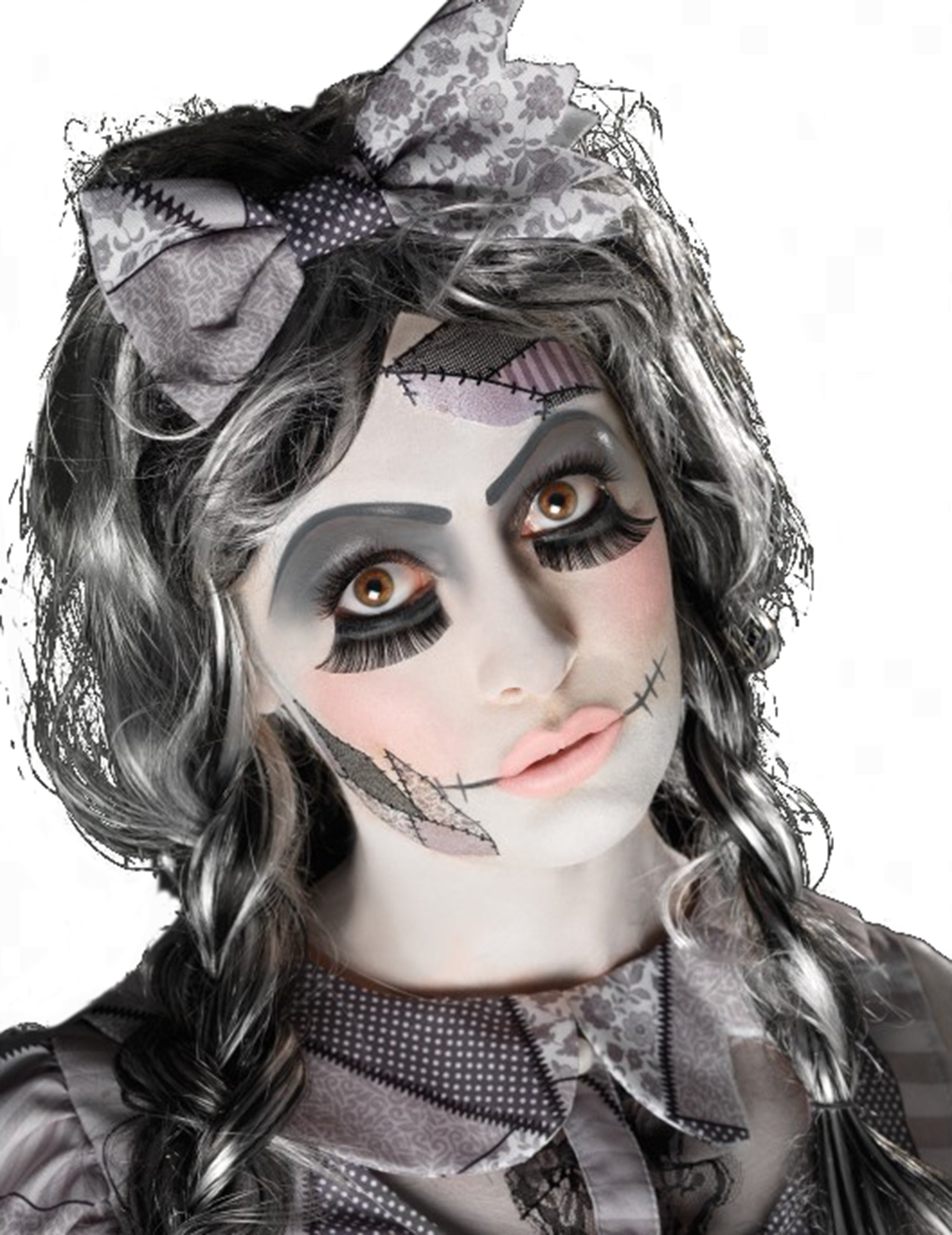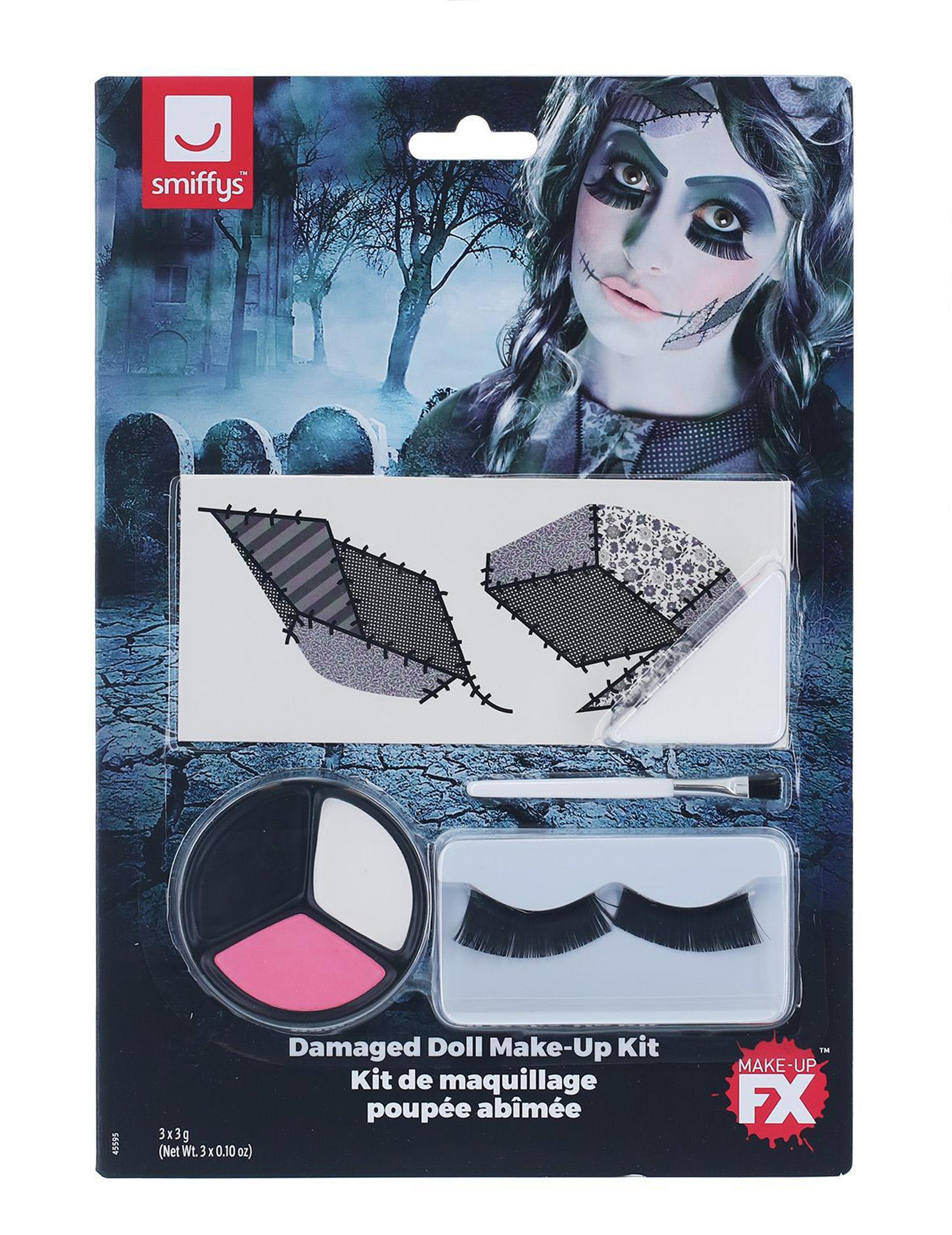 Този комплект за грим за Хелоуин се състои от палитра от 3 сенки, татуировки за кукли, фалшиви черни мигли, гъба и четка. Той ще създаде много реалистично лице за кукла за Хелоуин. Ще бъде идеално да завършите вашата кукла маскировка в Хелоуин вечер!