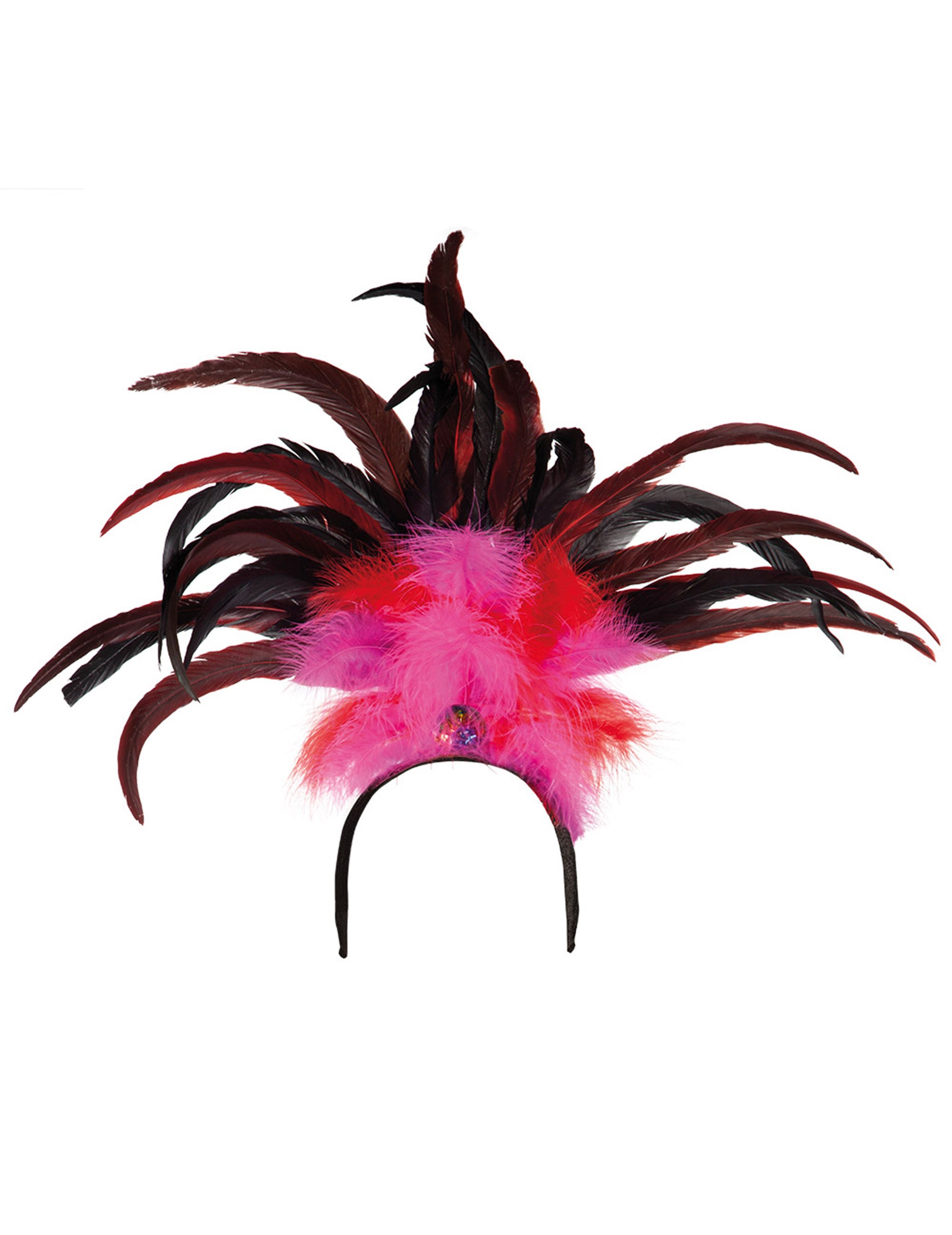Тази бразилска розова капачка се поддържа като лента за глава. Перата са от розови, червени и бургундски цветове с фалшив розов диамант отпред. Перата вървят с височина до 38 см. Тази лента за глава ще бъде идеална за завършване на вашето бразилско облекло.