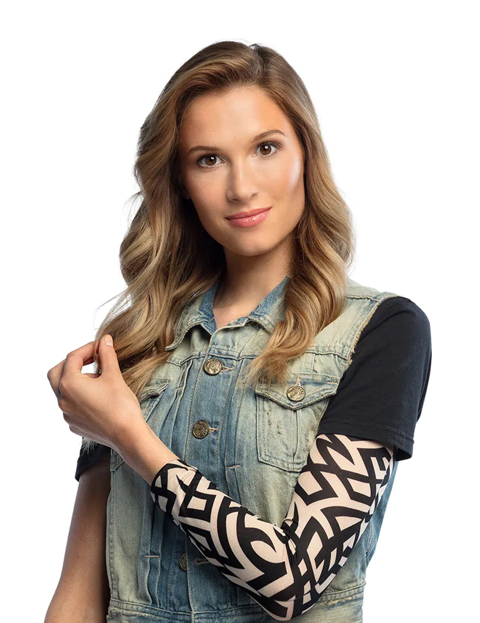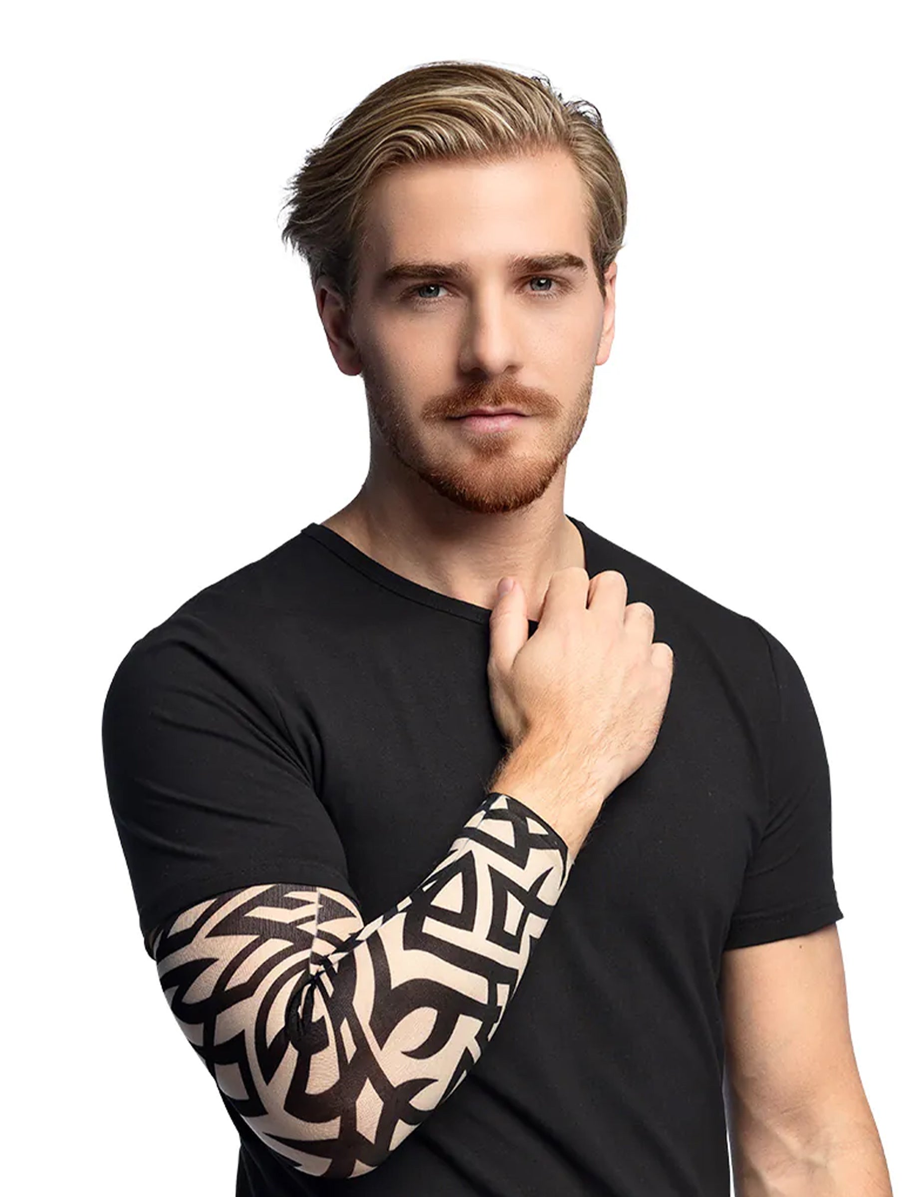 Тази найлонова дръжка е цвят на плът, с фалшиви черни племенни татуировки. Много еластичен, този ръкав лесно ще се адаптира към вашата морфология и ще даде илюзията, че имате татуираната ръка. Това ще бъде идеално за завършване на мотоциклетист за карнавала.