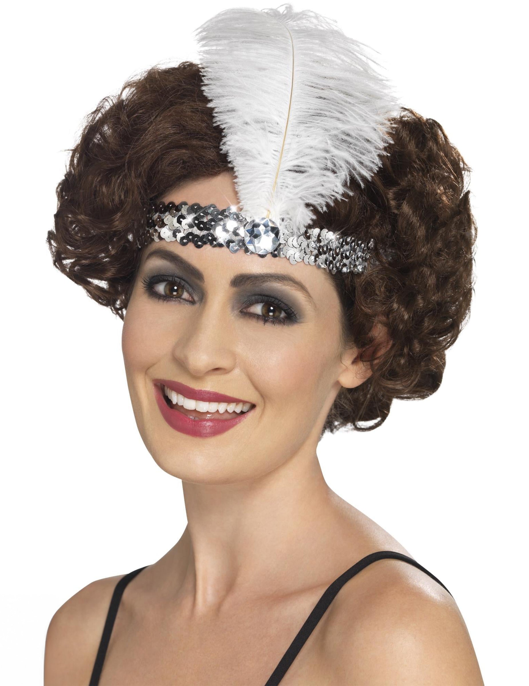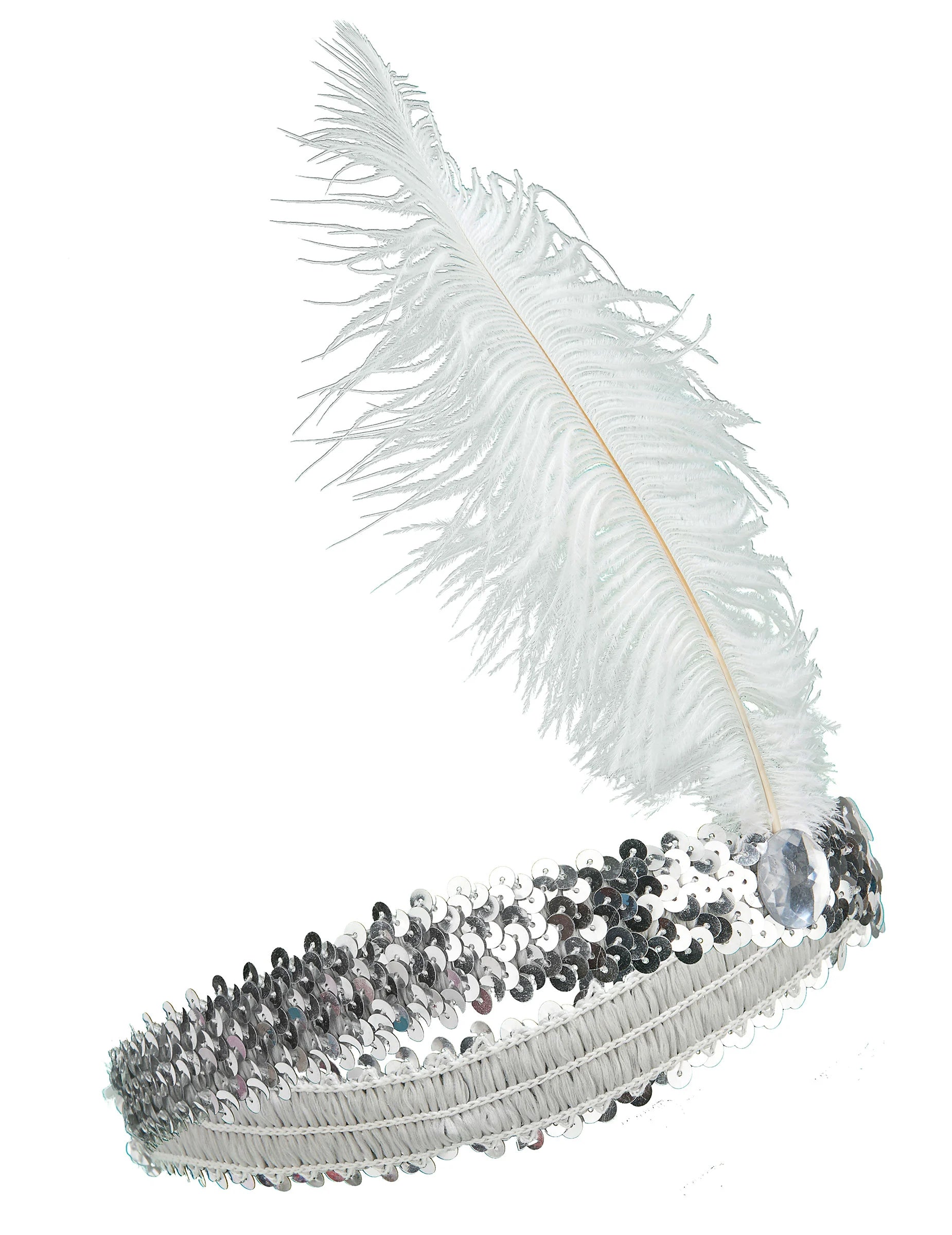 Тази сребърна лента за глава на Чарлстън е блестяща с перо и сив скъпоценен камък. Покрит е с пайети. Еластичната му тъкан ще адаптира всички глави. Този аксесоар ще бъде идеалното бижу за завършване на вашето облекло по време на вечер на темата на 20/30 -те!