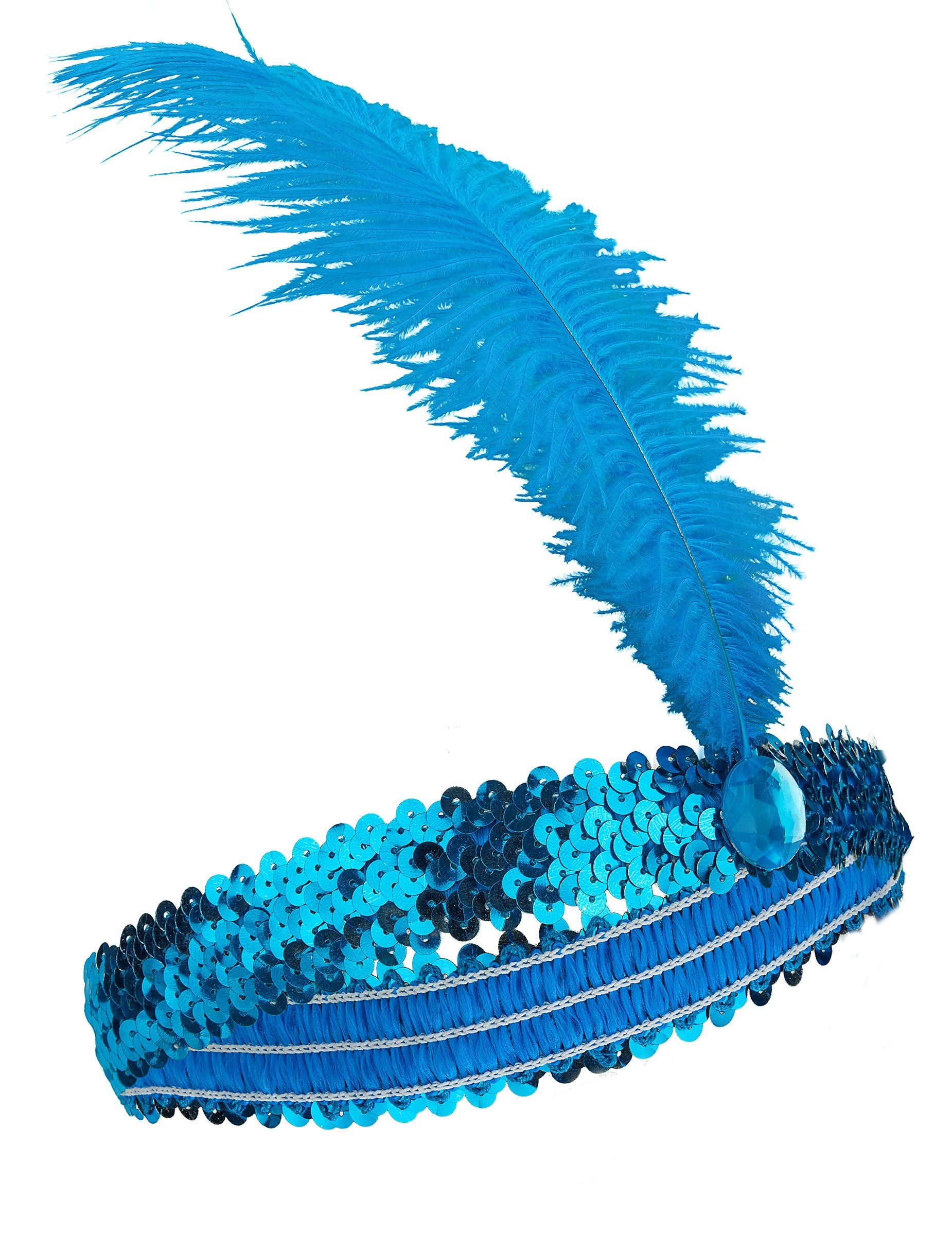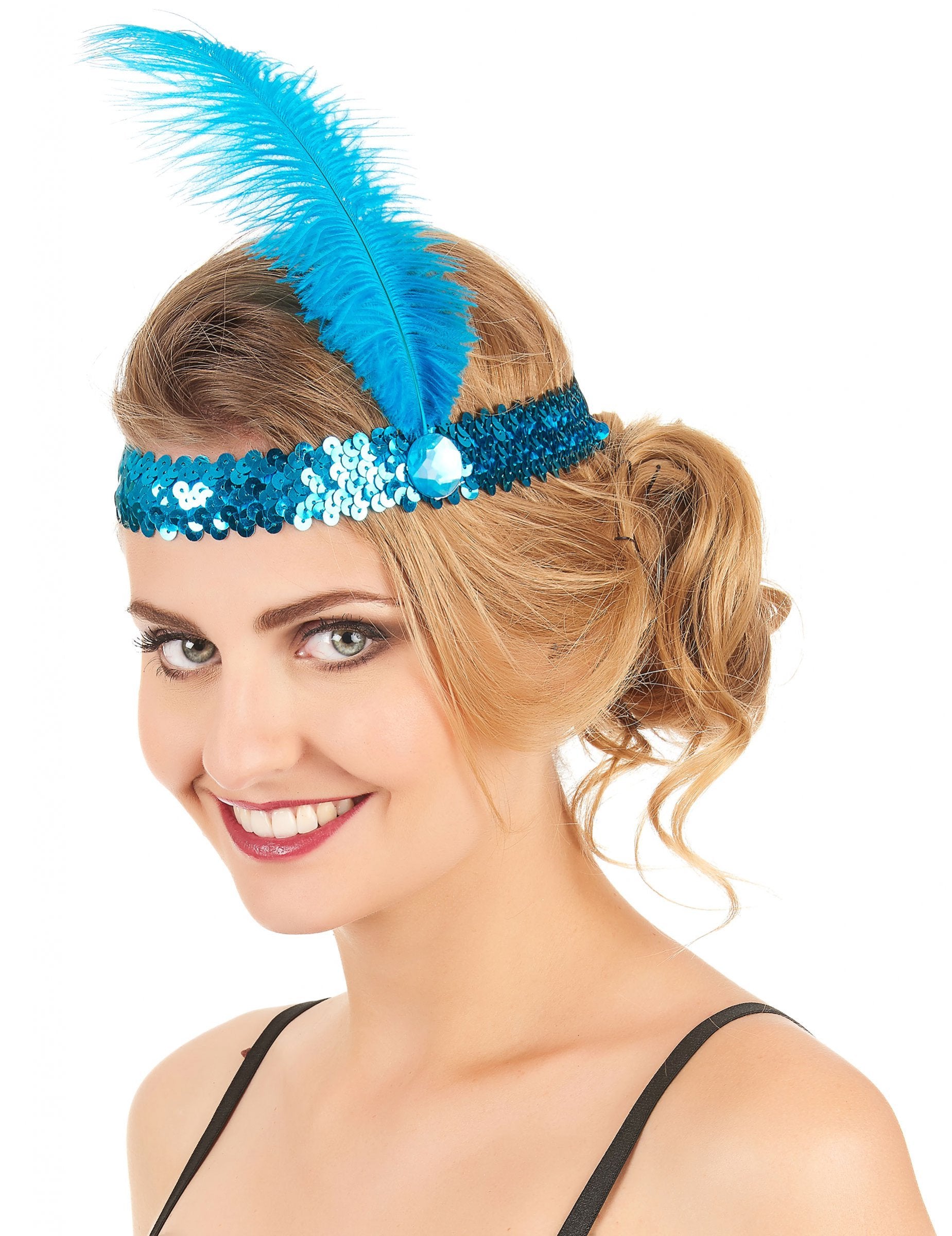 Тази еластична лента за глава на Чарлстън е за жени и сини. Покрито с пайети, има и перо с скъпоценен камък. По време на вечер на темата на 20/30 -те, тази лента за глава ще бъде идеалното бижу на главата!