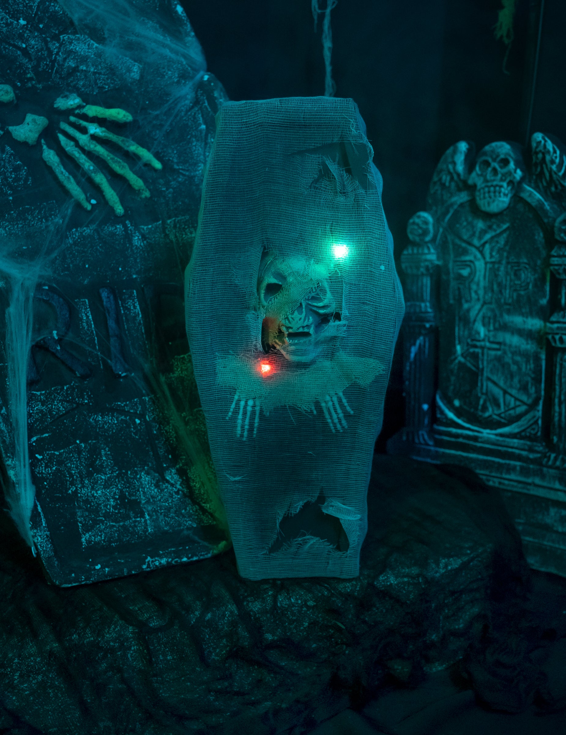 Този осветен скелетен ковчег е висок 41 cm дълъг и 19 cm Голям. Сив на цвят, с скелет в центъра на ковчега със светещи LED очи. Бутон за включване/изключване се намира на гърба. Изисква 2 батерии тип AA (не са включени). Тази декорация ще бъде идеална за украса на вашата парти стая в нощта на Хелоуин.