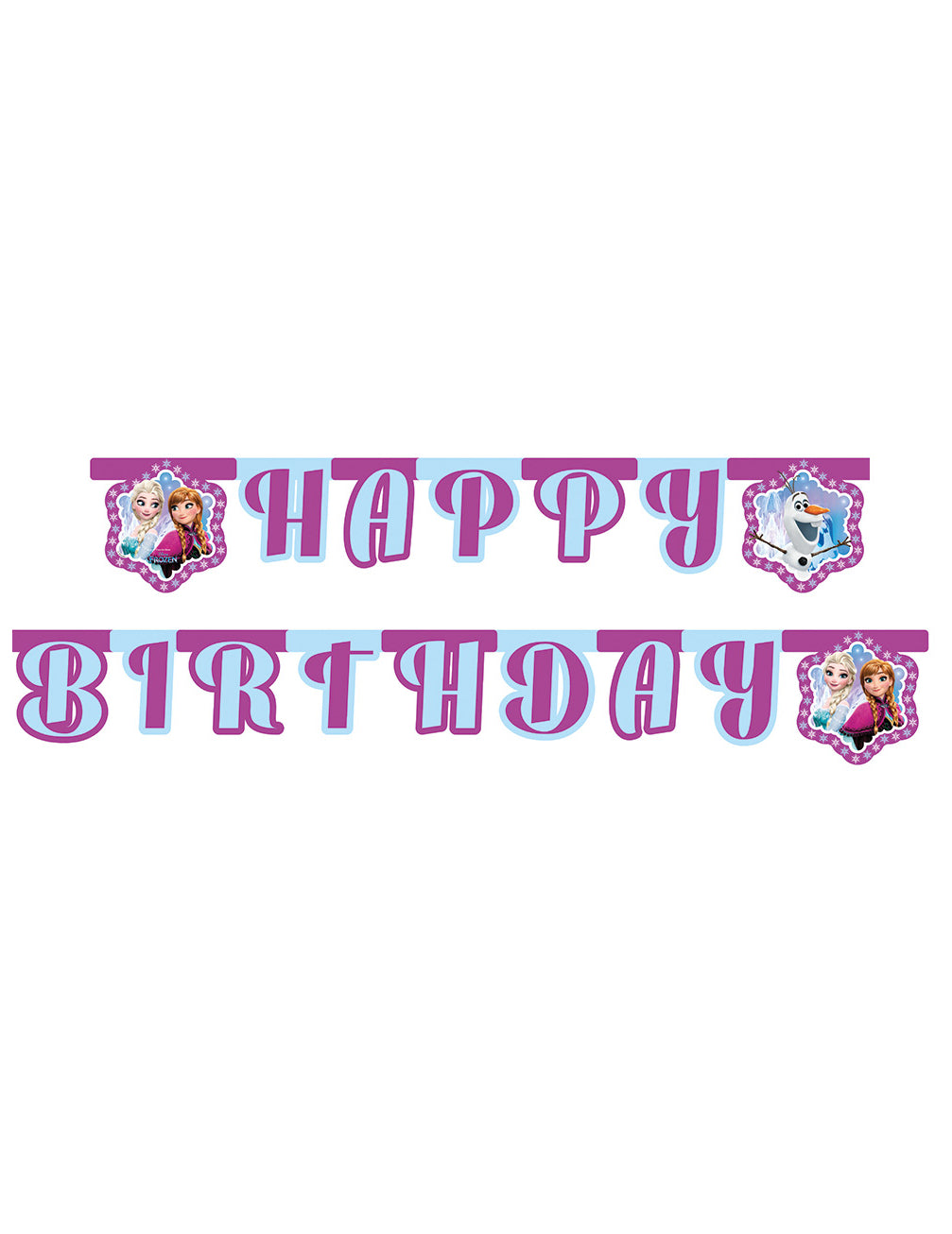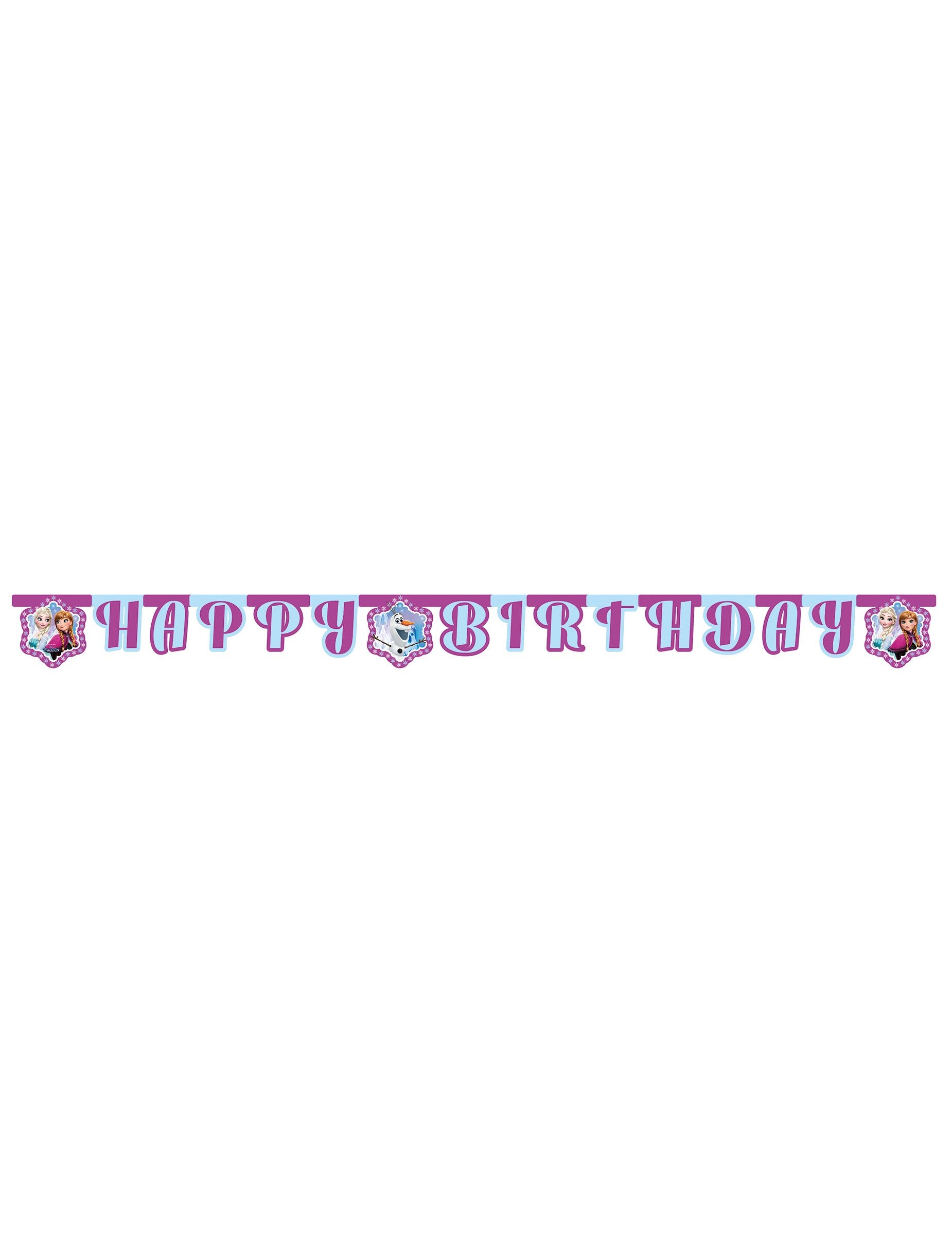 Тази картонена гирлянда 2.10 м е под официален лиценз The Snow Queen. Те са съставени от съчленени букви, които формират думите „Честит рожден ден“ в лилаво и небесно синьо. 3 картонени миниатюри от около 17 см, във формата на снежинки заобикалят съобщението. Те са отпечатани с портрети на сестри, замръзнали, Анна и Елза и забавен малък Олаф. Бялата струна се предоставя на всеки край, за да ви позволи лесно да окачите гирляндата. Тази гирлянда ще завърши вашата декорация за рожден ден за незабравимо парти! Вашият малък фен на Снежната кралица ще сподели този момент с приятелите си!