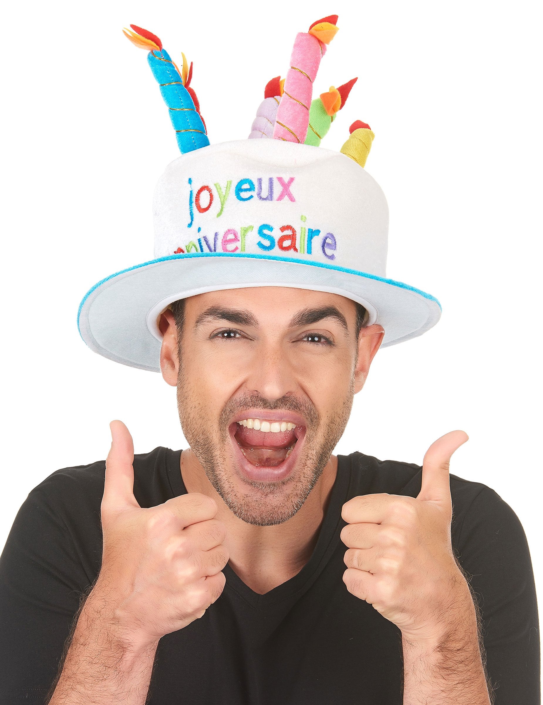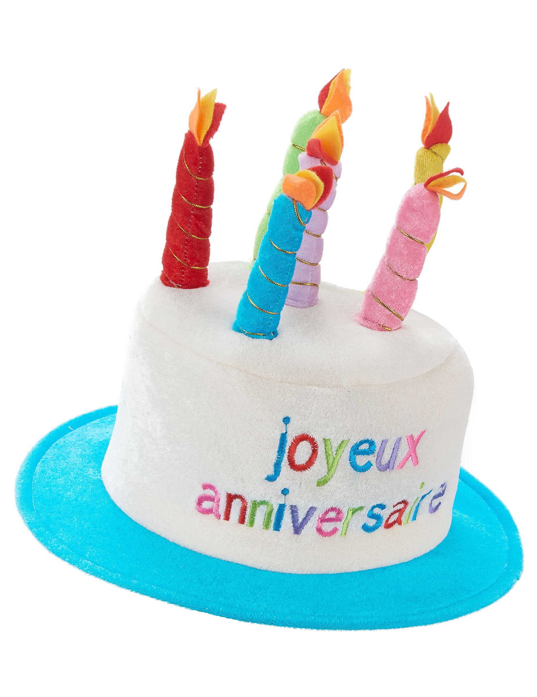 Тази превъзходна шапка от пяна, покрита с мека материя, е за възрастни. Краищата на шапката са сини, капачката е бяла. Изречението „Честит рожден ден“ е бродирано с многоцветни писма, а свещите от пяна преодоляват шапките. Повечето обиколки на главата са подходящи за приблизително 60 cm. За да отпразнувате рождения си ден или този на другите, тази шапка няма да не зададе тон за празничния ден!