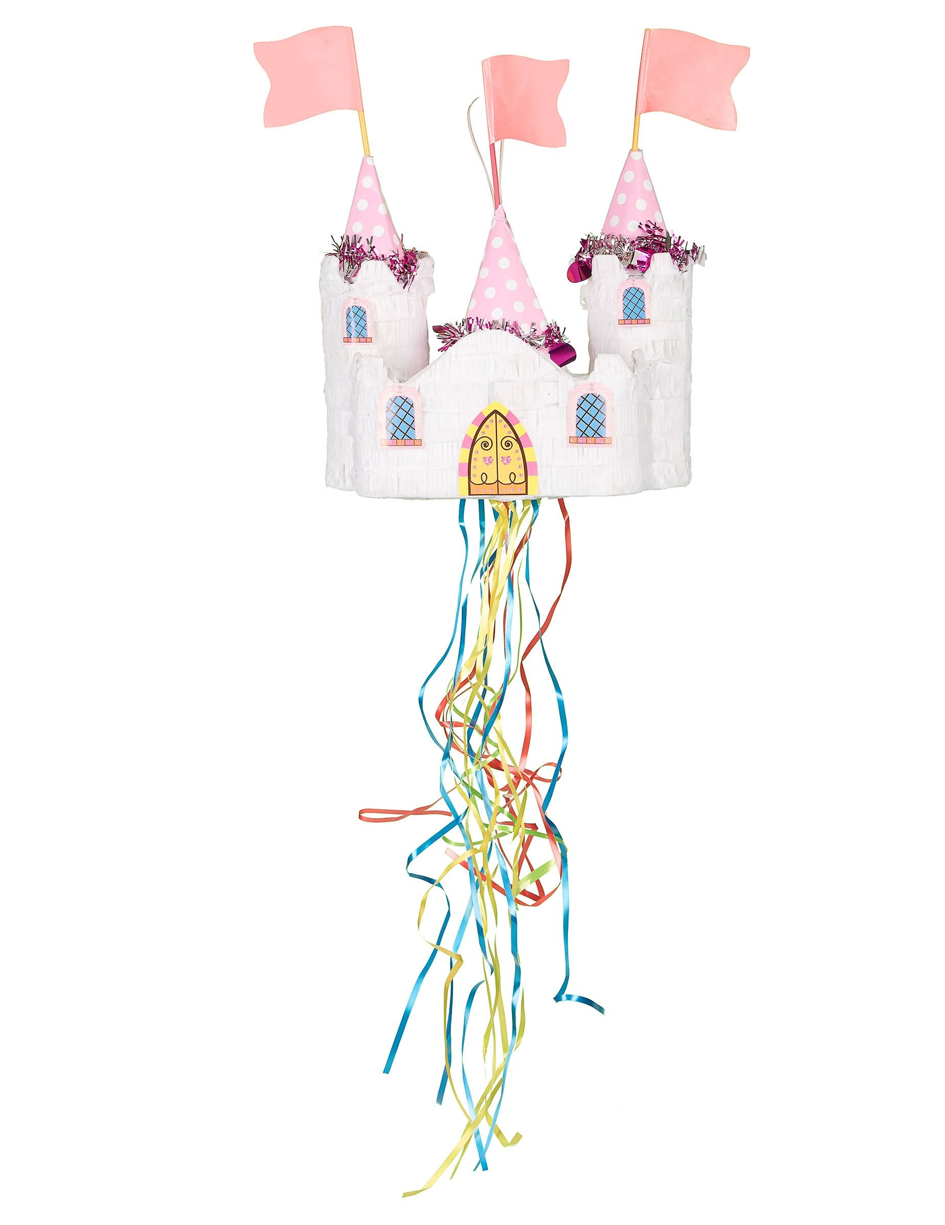 Тази малка картонена пиня представлява замък принцеса. Той е бял и розов на цвят и е с размери приблизително 30 х 30 cm. Тази пиня има пластмасов контур, за да я закачи лесно, както и малка дупка, за да го запълни с изненади, малки играчки и лакомства. Тази пинята също има около двадесет цветни панделки отдолу, само една от които ще отвори капана. След като вашата пината се напълни с подаръци и спряна, целта на играта е да снимате по един от струните, за да намерите този, който ще отвори пината и да пусне съдържанието му. Тази Pinata Château de Princess ще бъде идеална за създаване на превъзходна анимация за рождения ден на вашата малка принцеса!