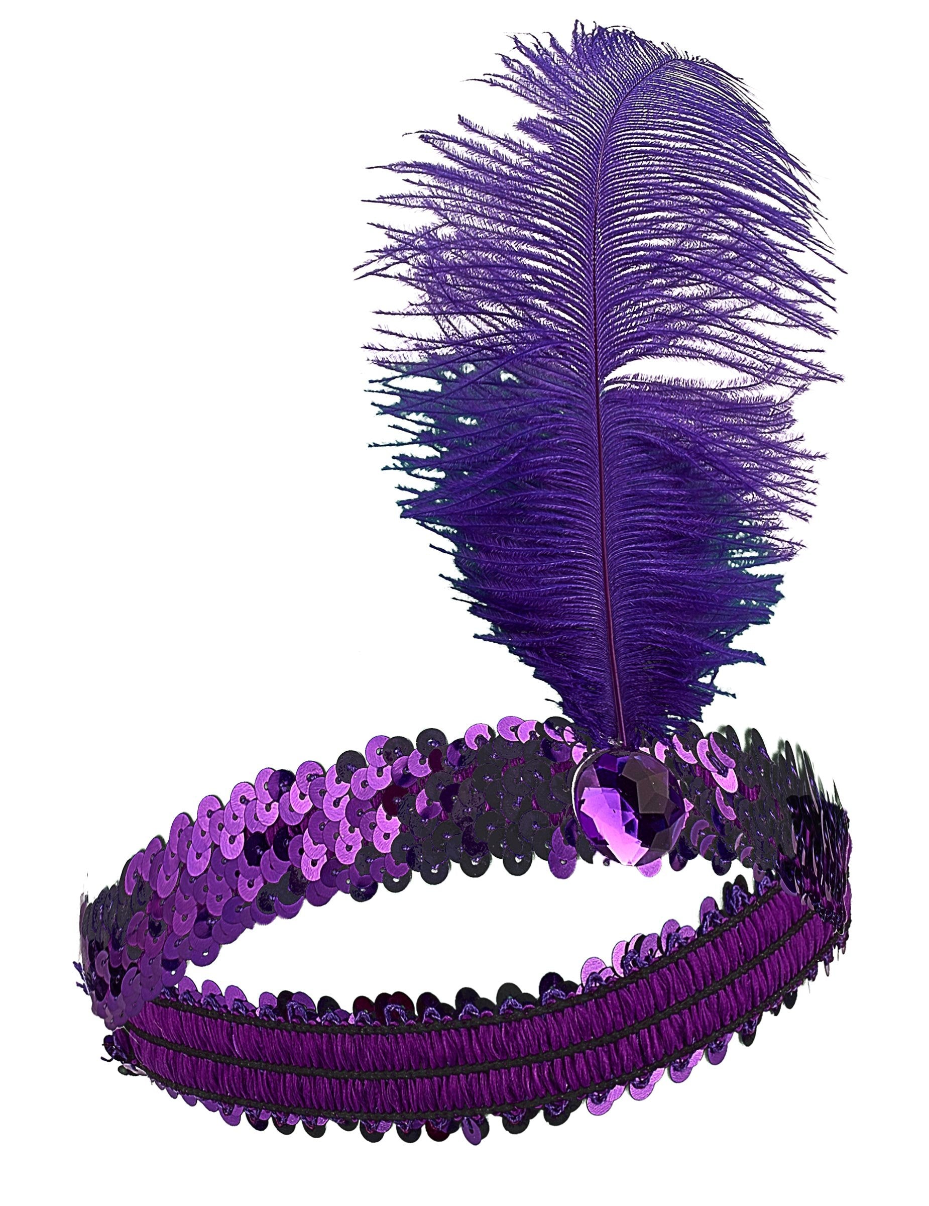 Този банер на Чарлстън за жените е еластичен. Покрит е с лилави пайети. Дълго лилаво перо с фалшив скъпоценен камък също е прикрепен към лентата за глава. Този аксесоар ще бъде идеален за завършване на костюм от 20 -те години по време на ретро вечер.