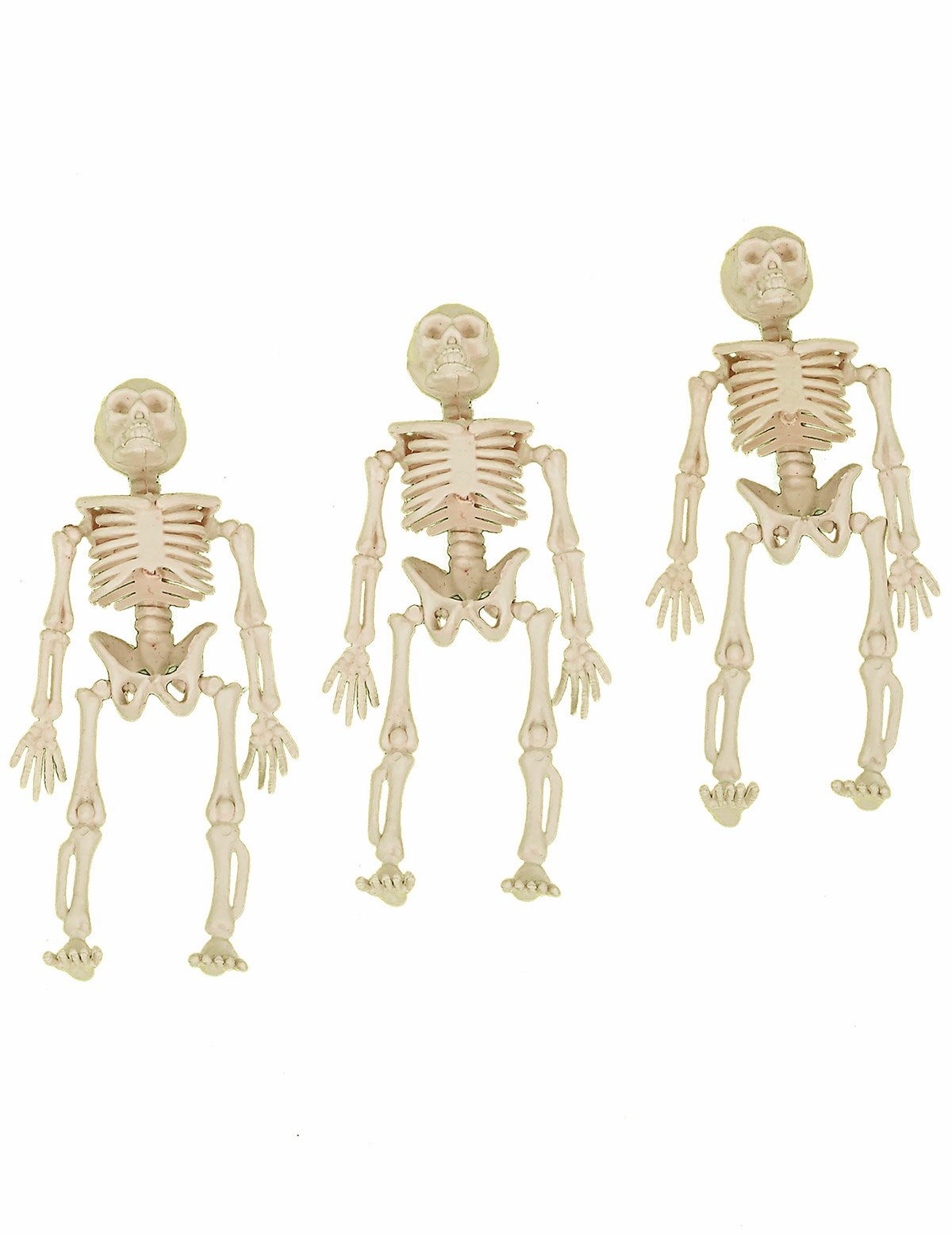 Тази партида се състои от 3 малки декорации за окачване. В пластмасата те представляват малки скелети с дължина 12 см. Те нямат система за закрепване, така че можете да ги закачите със системата по ваш избор: шнур, риболовен тел ... Тези малки скелети ще бъдат идеални за завършване на декорацията на вашата стая в Хелоуин вечер.