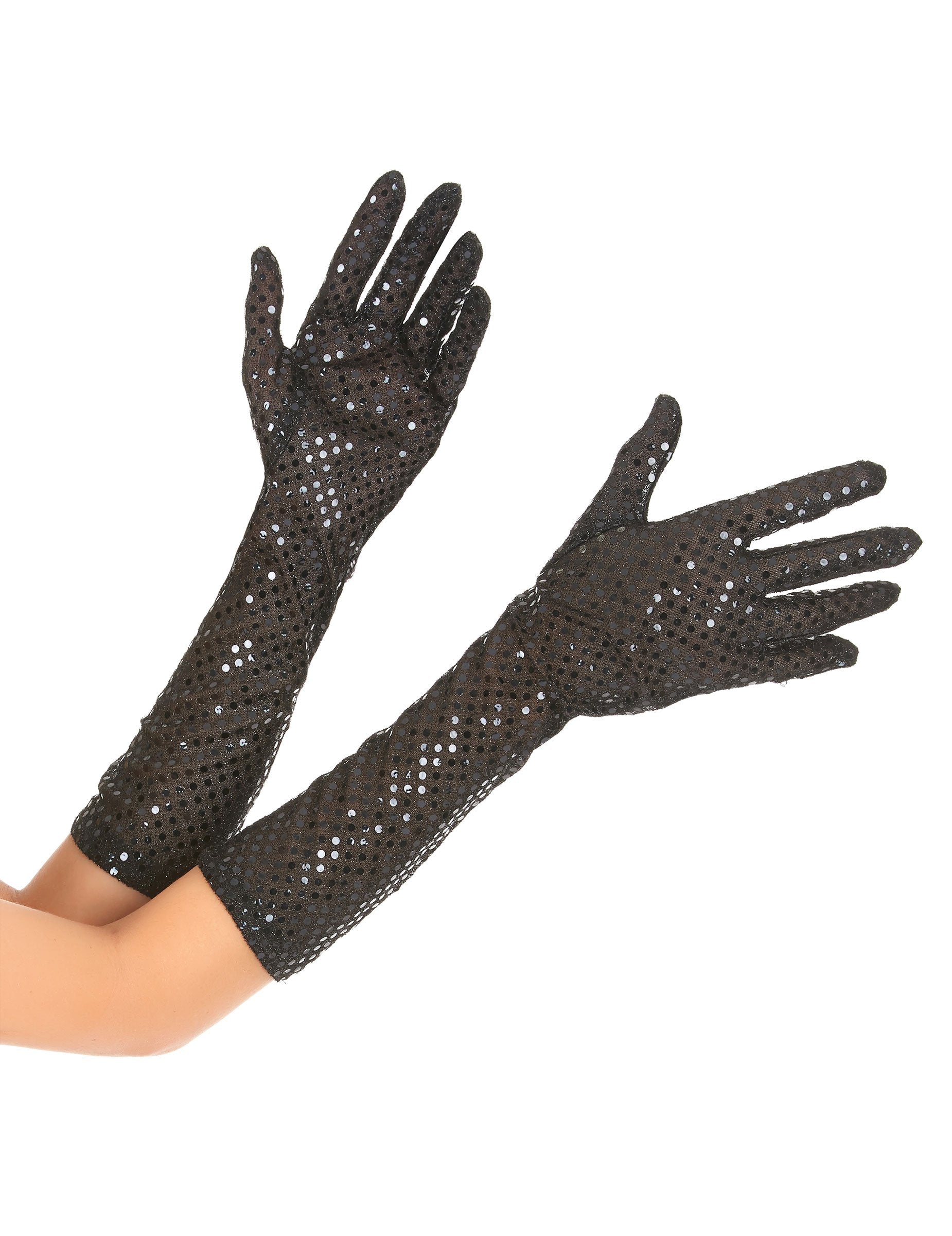 Тези средни ръкавици са черни и покрити с пайети. Те ще подхождат на възрастни и ще измерват дължина около 30 см. За да аксесоари за вашия костюм на Чарлстън или Кабаре, например, тези много шикозни ръкавици ще бъдат перфектни.