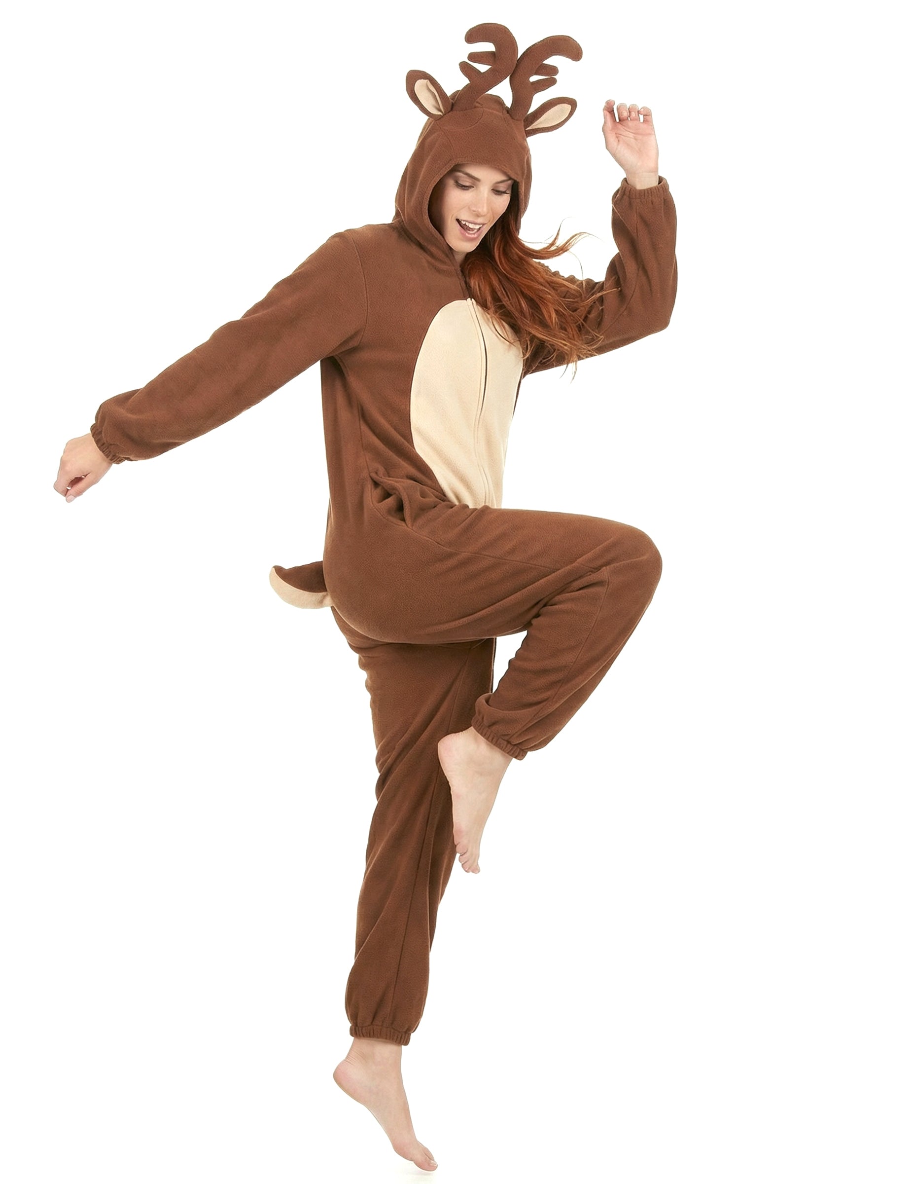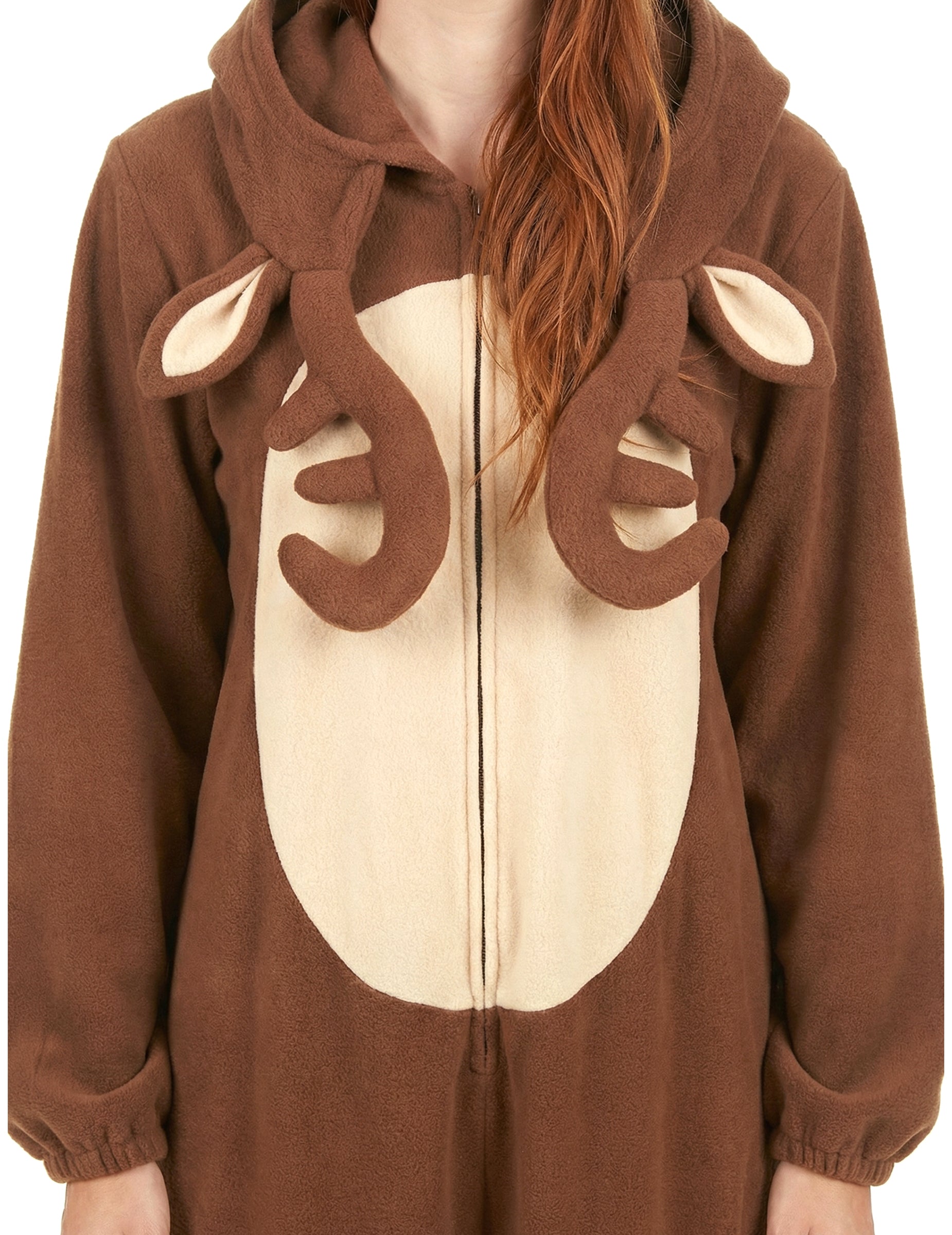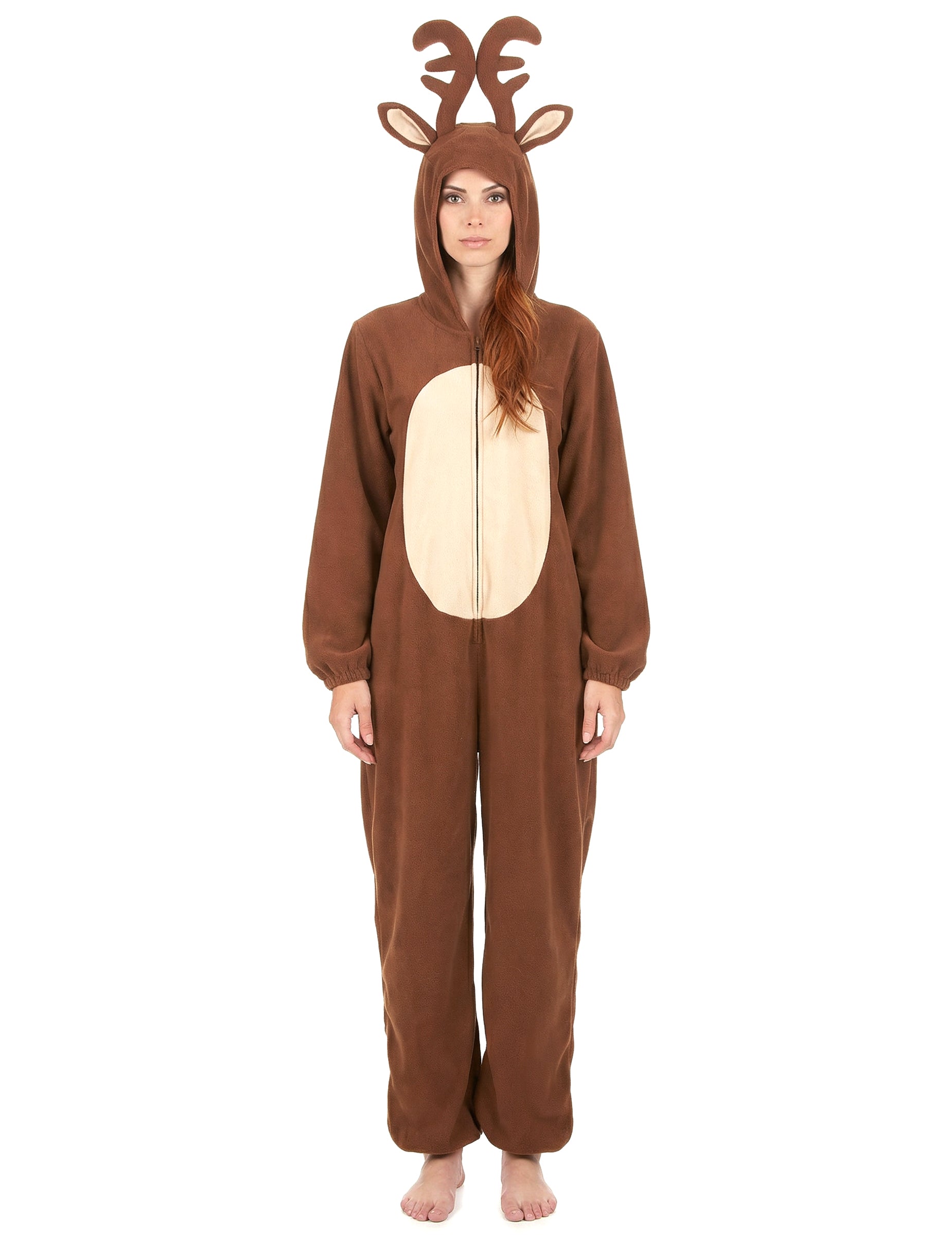 Тази комбинация от елени за жени е в кафяво руно главно и бежово в корема. Тя се затваря с леко затваряне, а краищата на ръкавите, както и краката са еластични. Интегрираната качулка е декорирана с доста чифт уши и дърва на рамката. Малка бежова опашка е пришита в задната част на маскировката. За да се притиснете на дивана си до пожара или да се прикриете за костюм вечер, тази комбинация няма да липсва оригиналност!