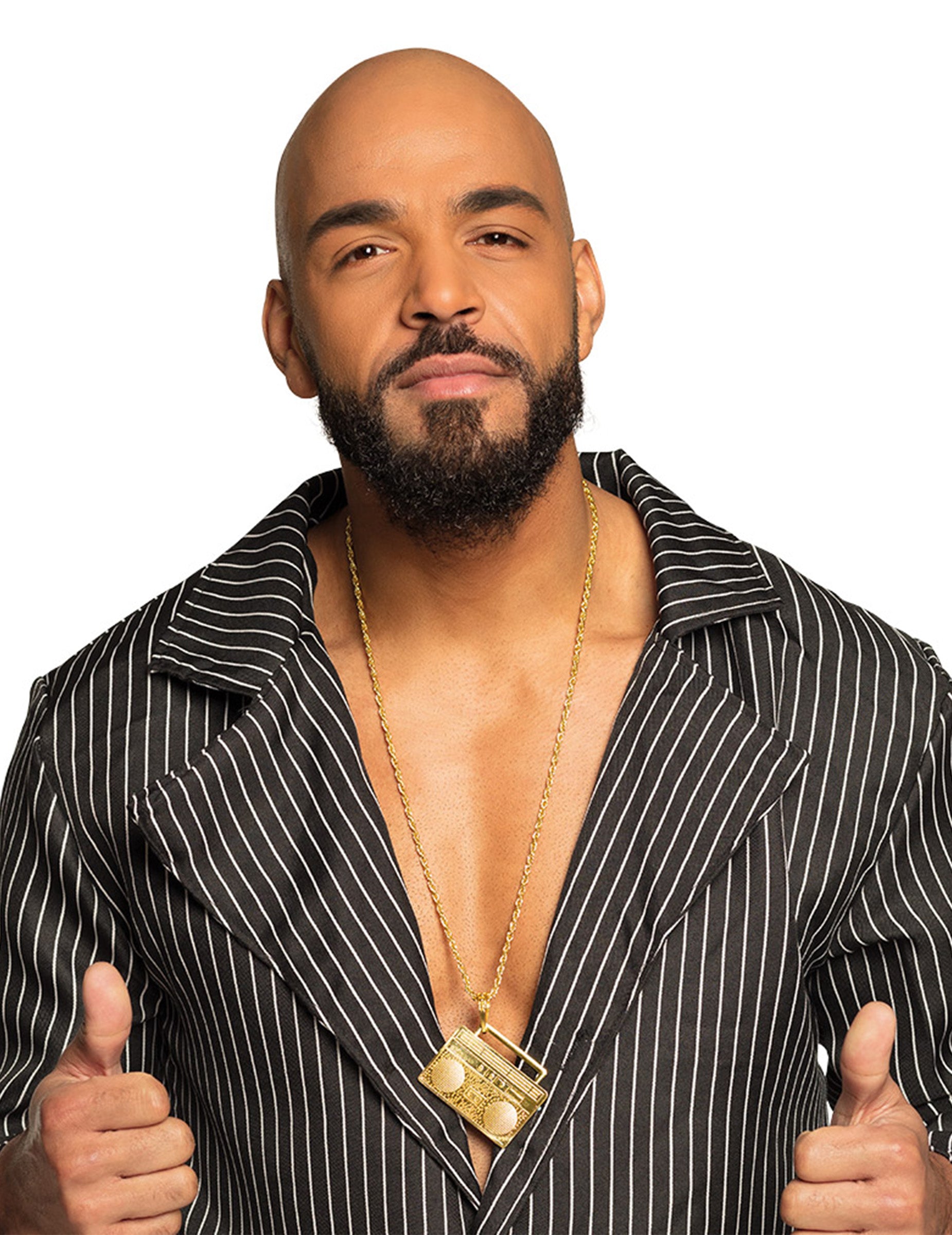 В златист метал това колие е за възрастни. Състои се от верига с размери около 77 см дължина и висулка с ширина 6 см, представляваща радиостанция. Това колие ще бъде идеално за аксесоари за вашето облекло по време на вечер, прикрита под темата на 80 -те.