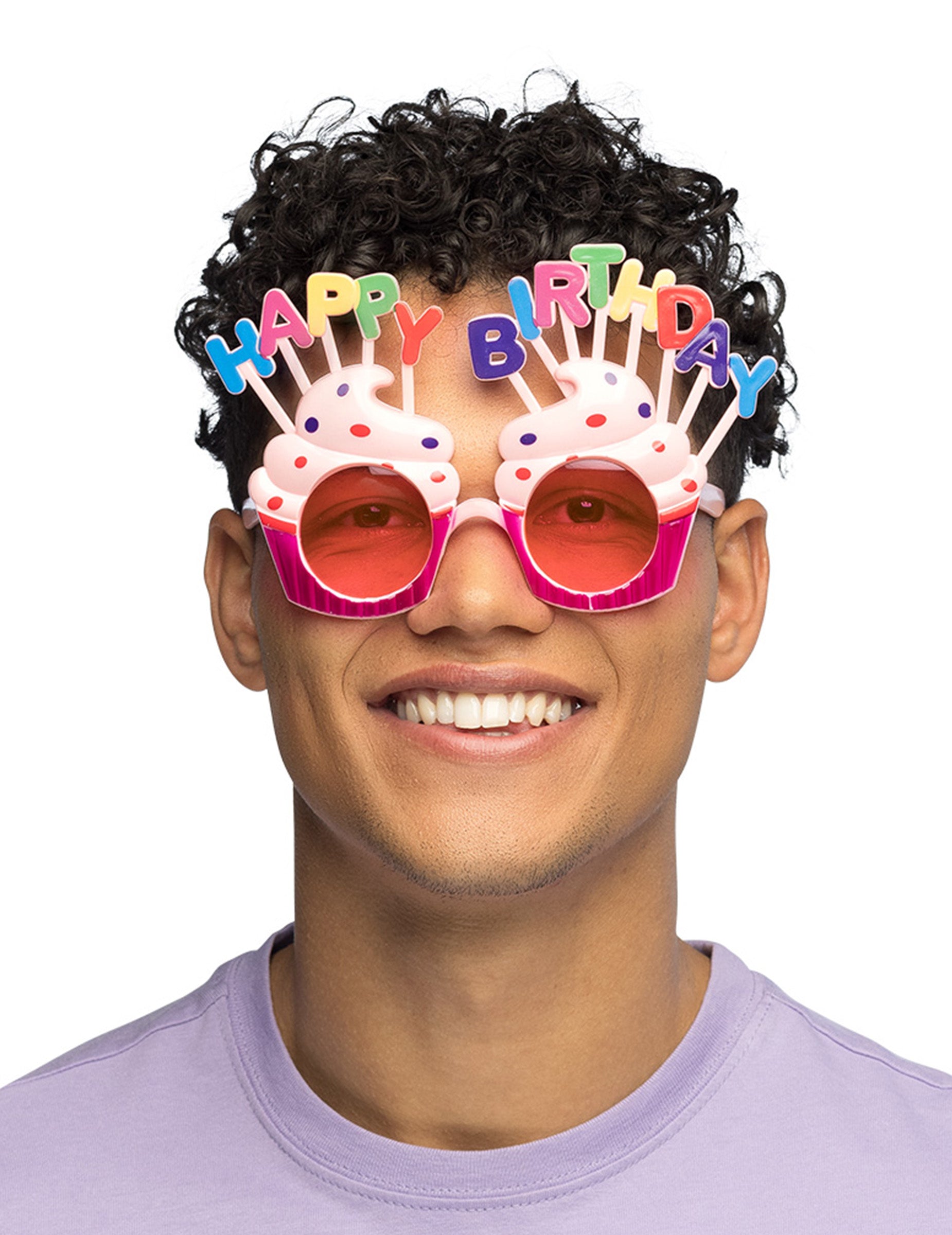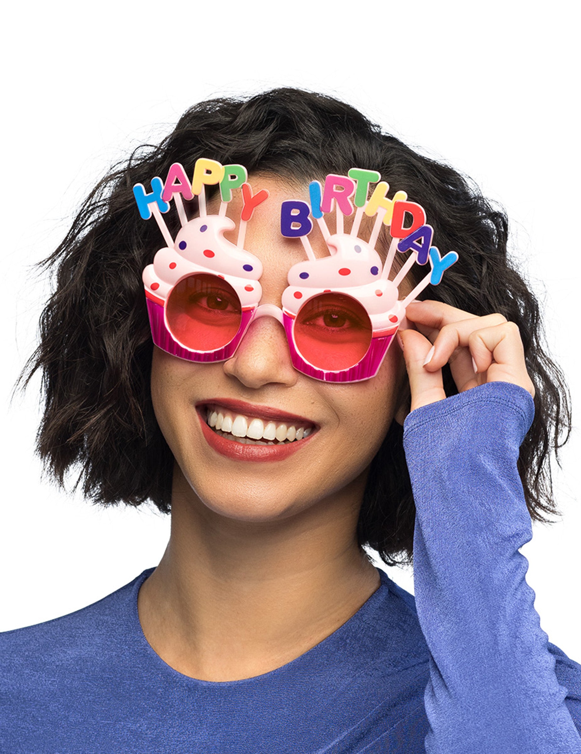 Тези очила за честит рожден ден за възрастни са в твърда пластмаса. Те са във формата на кекс, чиято основа е покрита с розови пайети. Клоните и кремът на тарталети са светло розови. Кексчетата са преодолени от фалшиви цветни пластмасови свещи, които формират съобщението „Честит рожден ден“. Те са с ширина приблизително 15 см. Тези очила ще бъдат идеални за празнуване на рожден ден с приятели!