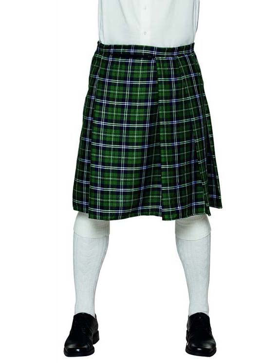 Този зелен шотландски килт е за мъже (високи, бели чорапи и обувки, които не са включени). Този шотландски киит е проверен със зелено и бяло. Има лента от черна драскотина при размера. Полата е с дължина приблизително 57 см. Този килт е идеален за завършване на костюм на екадесе по време на прикрити вечери или за карнавал.