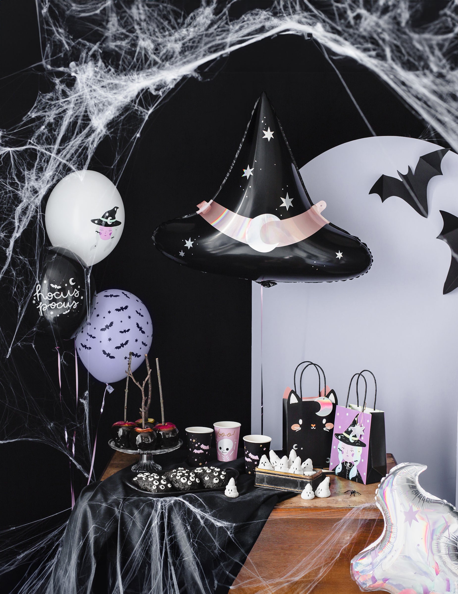Тези 3 черни картонени прилепи за окачване (47 cm, 37 cm и 31 cm) Предлагайте оригинален и поразителен визуален ефект за вашите декорации за Хелоуин. Всеки елемент разполага с внимателно изрязан силует, предизвикващ нощни същества в полет. Висяха на различни височини, те носят облекчение и движение в пространството. Лесен за инсталиране комплект за обличане на тавана с елегантност и мистерия.