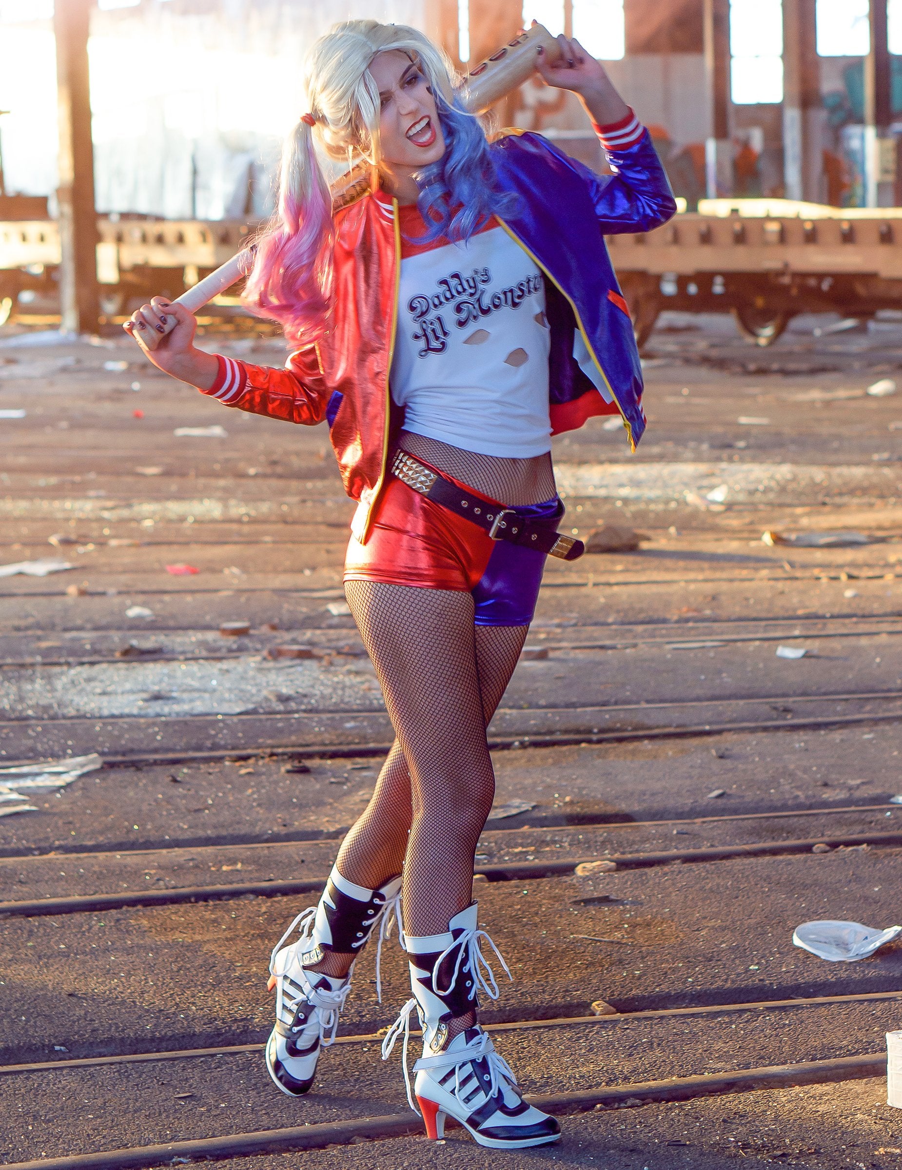 Тази маскировка на Harley Quinn под официален лиценз за самоубийствени отряди включва яке с интегрирана тениска. Бялата и сивата тениска е директно пришита в якето. Отпред присъства черен печат „Lil Monster“ на татко. Яката е червена с малки черни линии. Дългото яке е две -оцветено: едната страна е сатенено синьо, другата е сатенено червена. По протежение на отвора на якето се движи лента от кафява тъкан с малки черни линии, за да симулира цип. Голям жълт печат „Свойство на Жокер“ присъства отзад. Яката, краят на ръкавите и долната част на якето са изработени от червена еластична материя, за да създадат ефекта на якето. Това яке с интегрирана тениска ще бъде идеално за въплъщение на известния Харли Куин с Хелоуин или Карнавал!