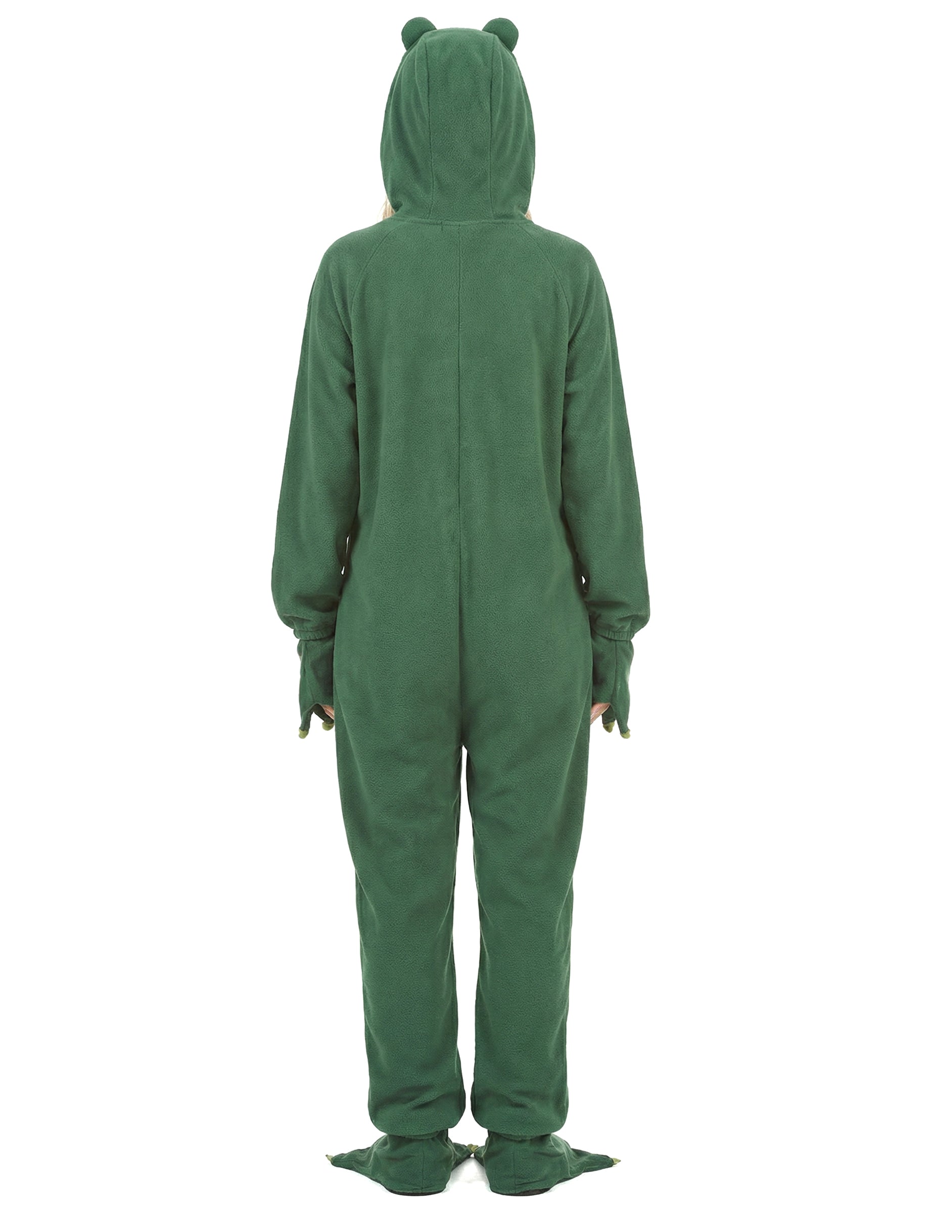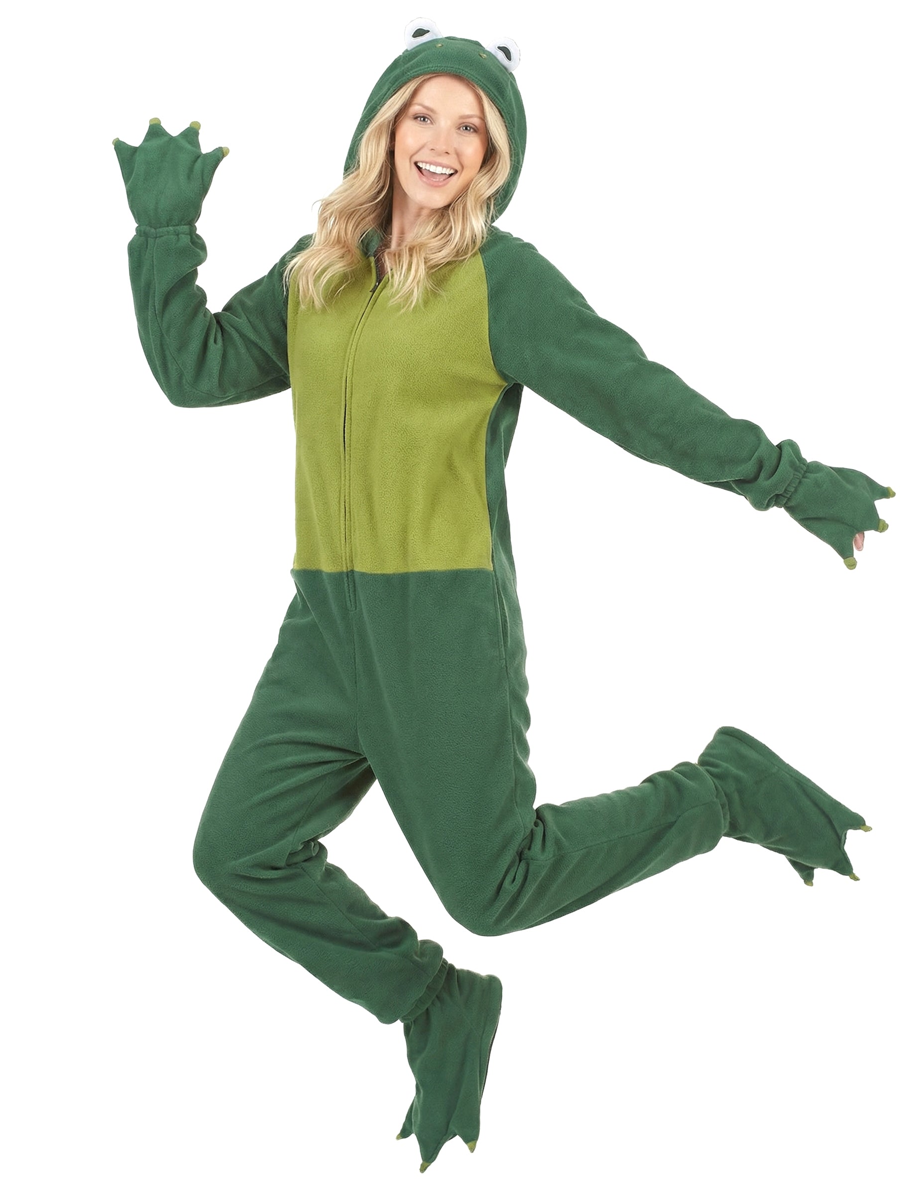 Тази комбинация от жаба за жени е в тъмнозелено руно със светло зелено коремче. Тя се затваря отпред чрез затваряне на осветление. Включената голяма качулка показва две бели очи и две малки ноздри. Тази маскировка включва и покритие с две ръце и две свръхчаузи, представляващи краката на мрежата, характерни за Батрациен. Този костюм на жабата ще бъде идеален за скачане навсякъде и създаване на смешността на вашите приятели по време на костюм вечер!