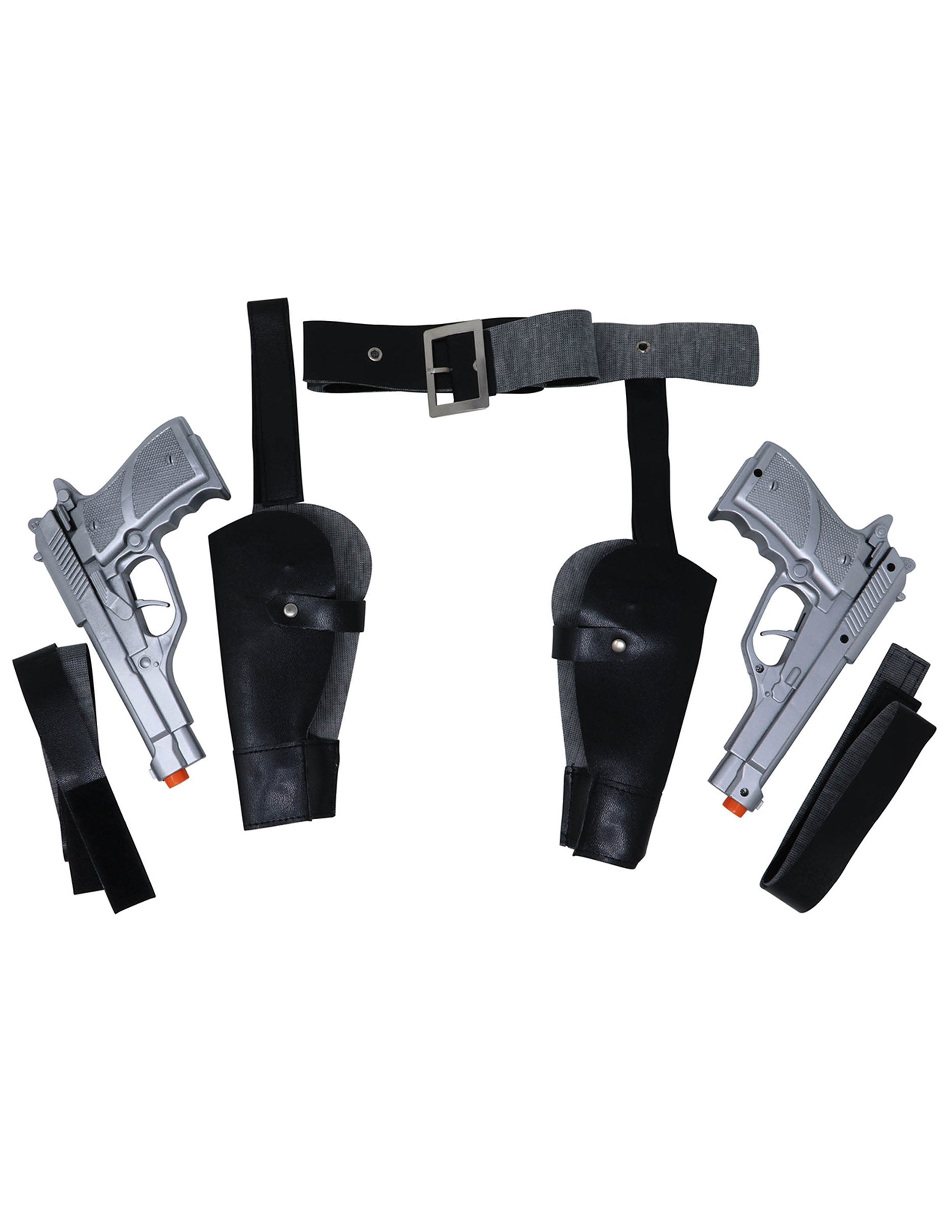 Тази партида се състои от регулируем колан, два пистолета в техните сменяеми случаи и две каишки, които можете да прикрепите към бедрата за по -вярно от живота ефект. Той ще бъде идеален за усъвършенстване на прикриването на хватката ви!