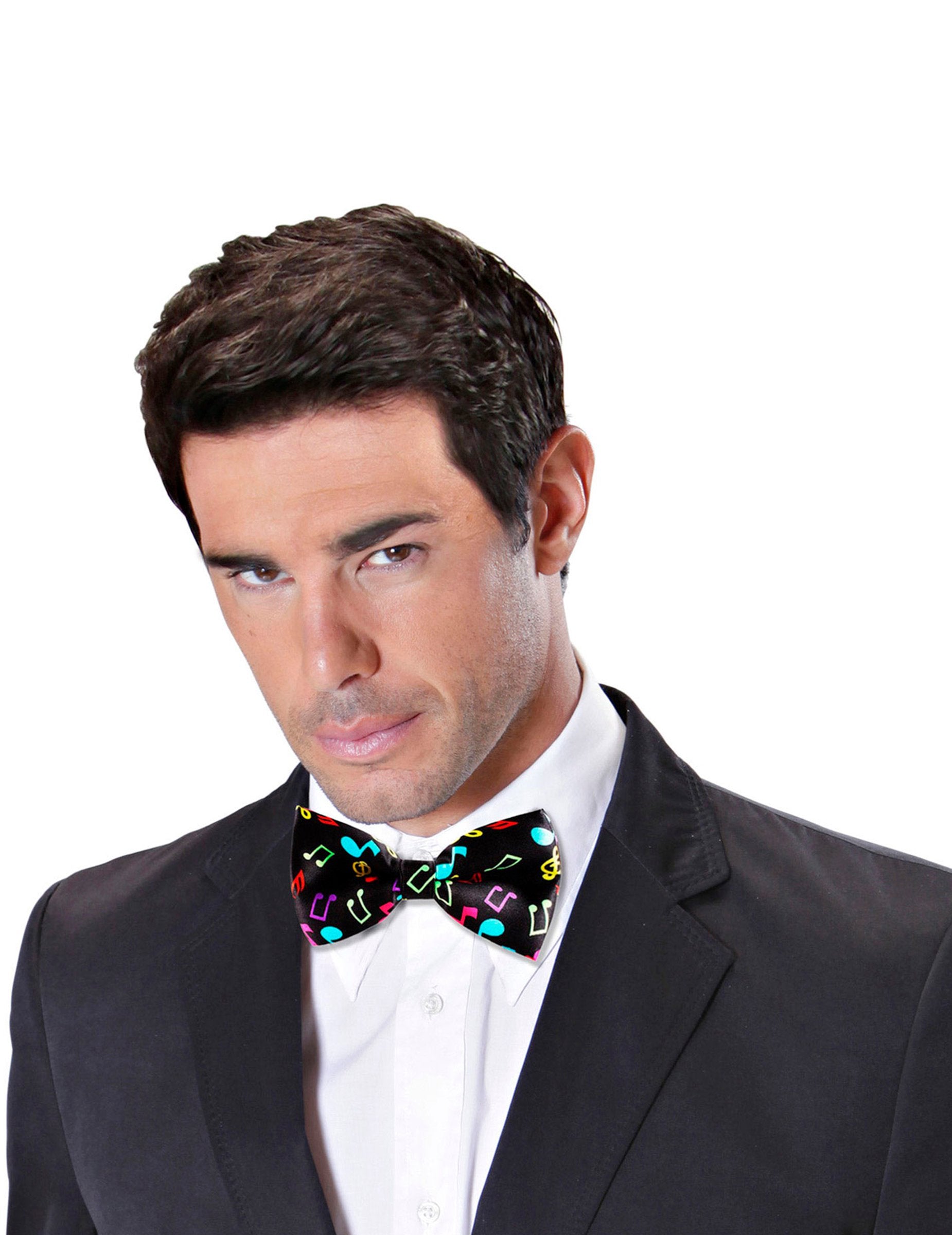 Тази преди гола папийонка е за възрастни. Той е черен на цвят и е отпечатан с различни музикални бележки. Той е с размери приблизително 14 x 7,5 cm. Този възел на пеперудите е в полиестер и той лесно ще се поддържа около врата ви благодарение на регулируемата му еластична. Този аксесоар ще бъде идеален за завършване на вашето облекло, по повод вечер по темата за музиката. Copyright Widmann Srl