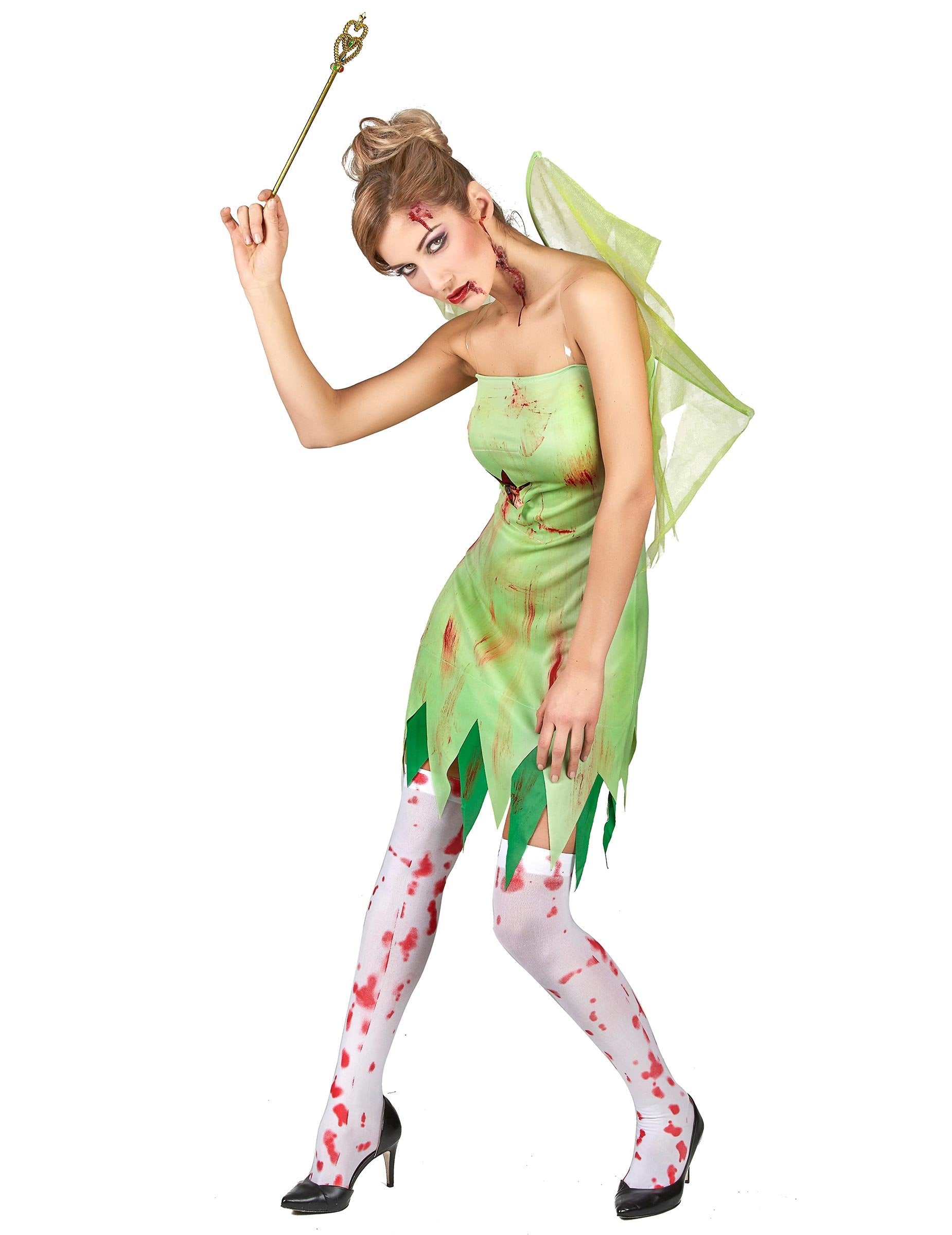 Тази жена приказка включва рокля и чифт крила (багет, чорапи и обувки не са включени). Кратката рокля с регулируеми прозрачни каишки е прозрачна зелена и облицована с тъмно зелено. Дъното е отрязано, за да предизвика разкъсан ефект. Навикът се оцветява с фалшива кръв и се представя на нивото на гръдния кош, отпечатък от кървави ребра. Крилата измерват приблизително 50 x 40 cm. Метални подсилвания, те са направени от светлозелен тюл и се държат отзад от еластика. Този изключителен комплект ще бъде идеален за отстояване на прикрита вечер с приятели като Хелоуин.