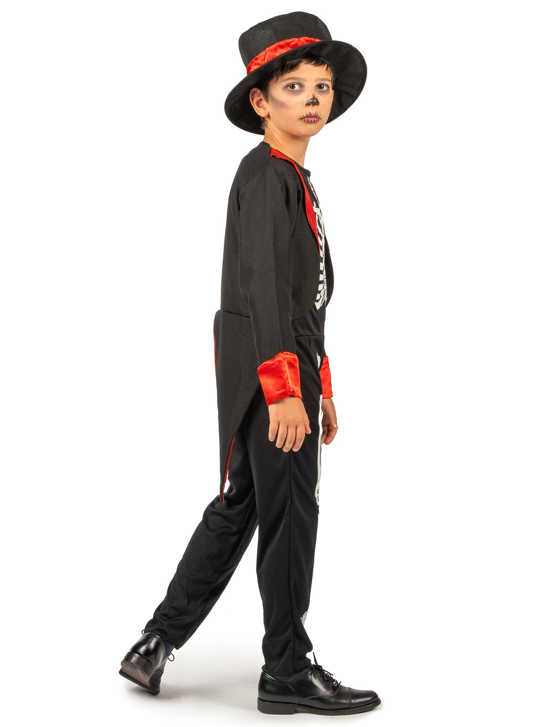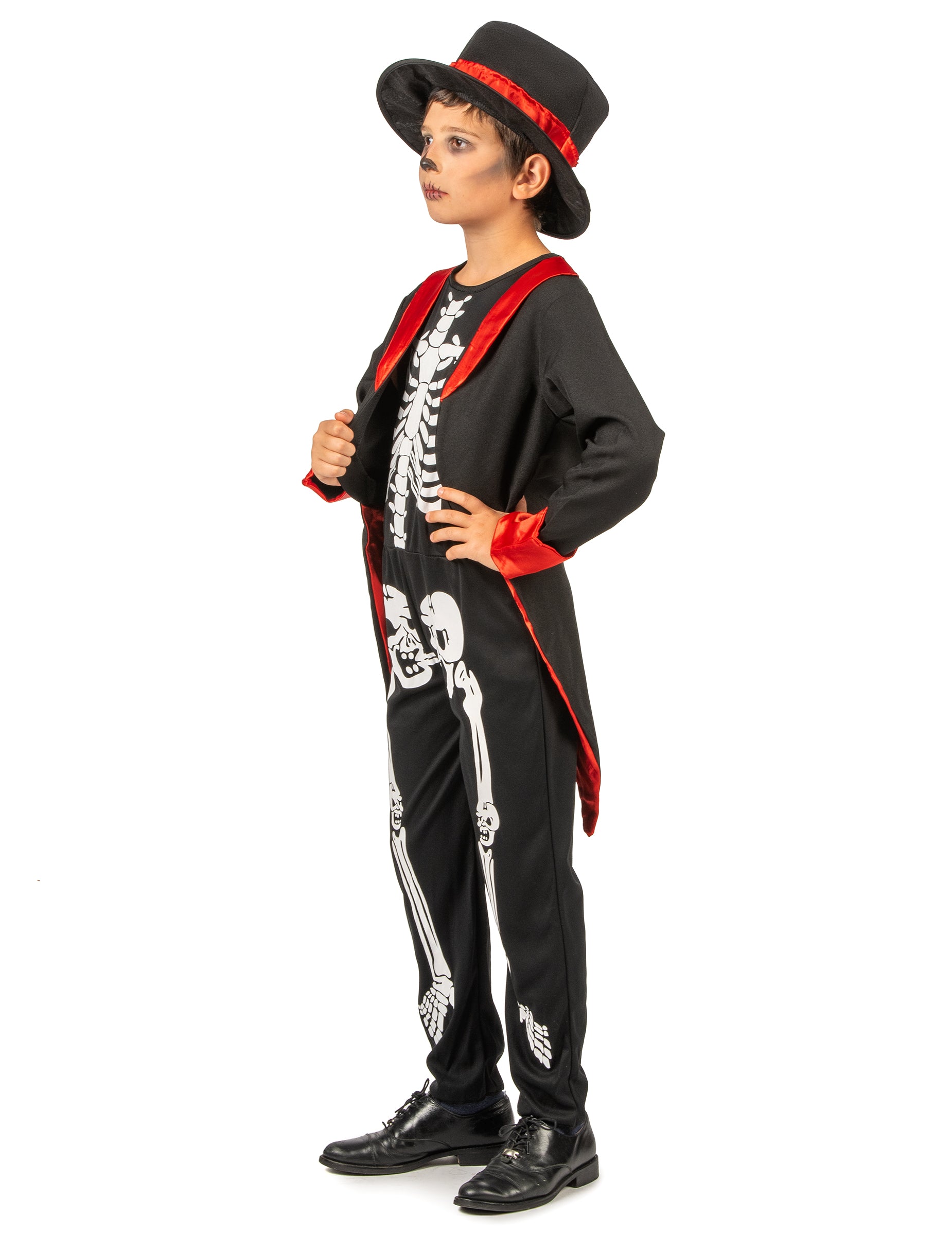 Този шик костюм на скелет е за момче. Състои се от комбинация, яке на опашката на пай и шапка. Комбинацията без ръкави е черна със скелет, отпечатан отпред. Черно яке за пай с черен цвят със сатенени червени облицовки. Шапката е направена от черно филц със сатенено червена лента около шапката. Този шикозен костюм за момче шик скелет ще бъде перфектен, за да бъде красив за Хелоуин.