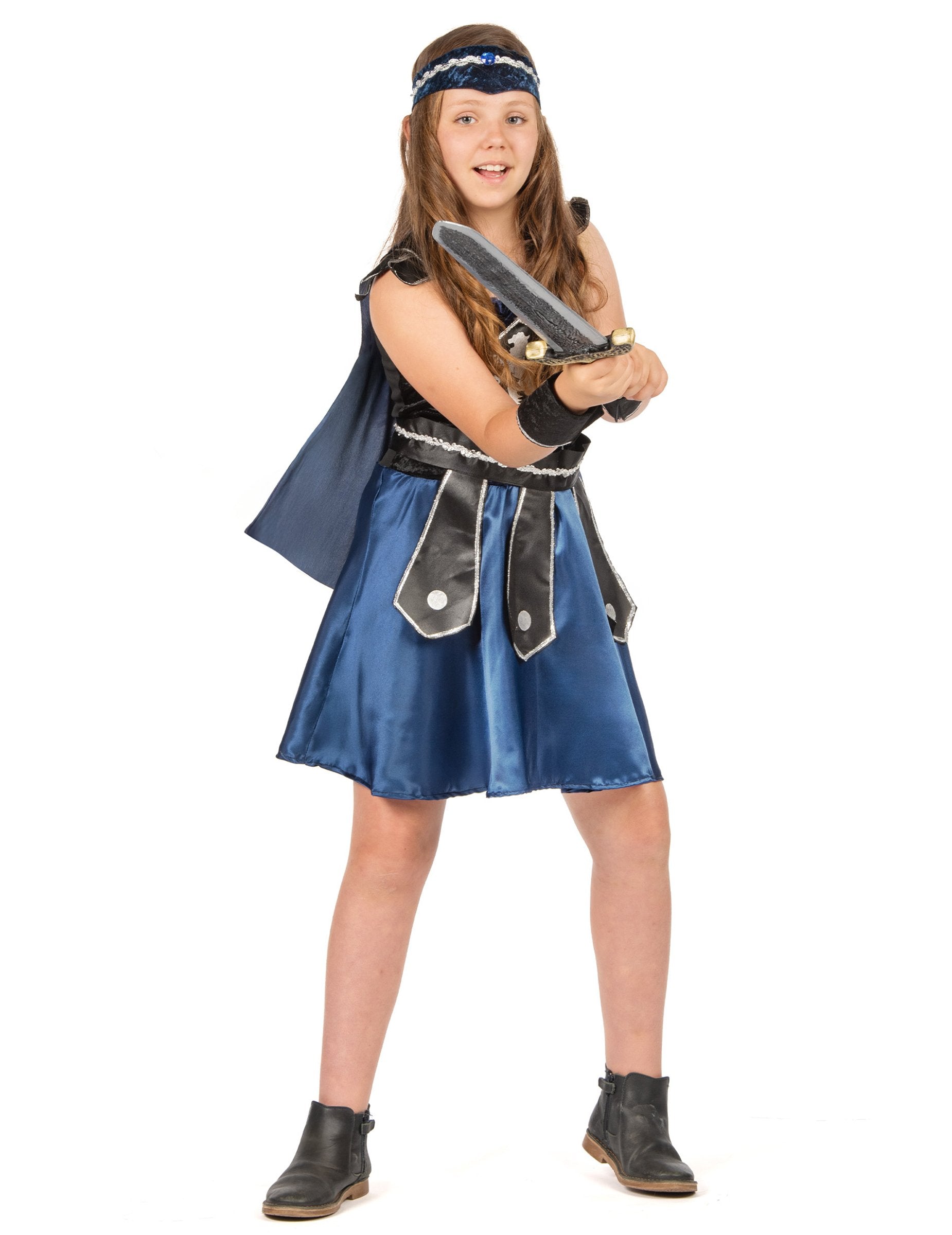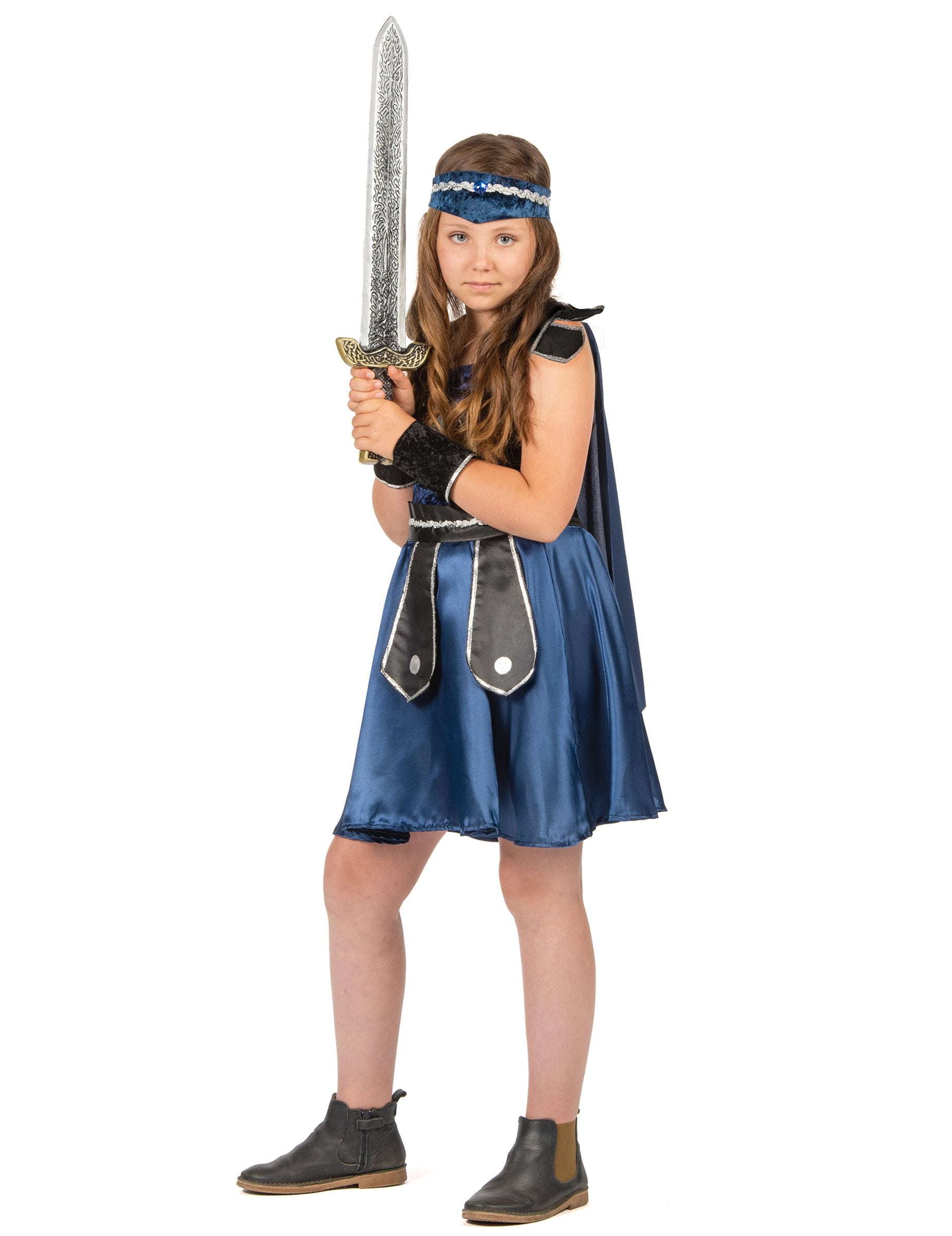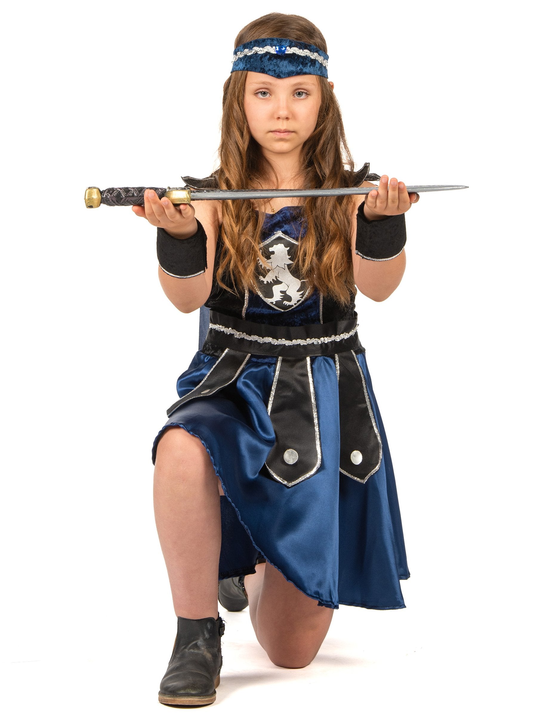 Този рицарски маскировка за момиче се състои от рокля, нос, чифт маншети, колан и банер (обувките не са включени). Синята и черната рокля е в плат от кадифе от върха и сатен на дъното. Значка се пришива отпред. Тъмносиният нос идва да се надраска на гърба на роклята. Коланът е черен и сребърен, със съвети отпред. Тя се затваря с помощта на голяма драскотина. Ефектът на кадифените маншети също се затваря, като се използва драскотини. Еластичният банер е среднощно синьо и сребро. Този рицарски костюм ще бъде идеален за карнавал.