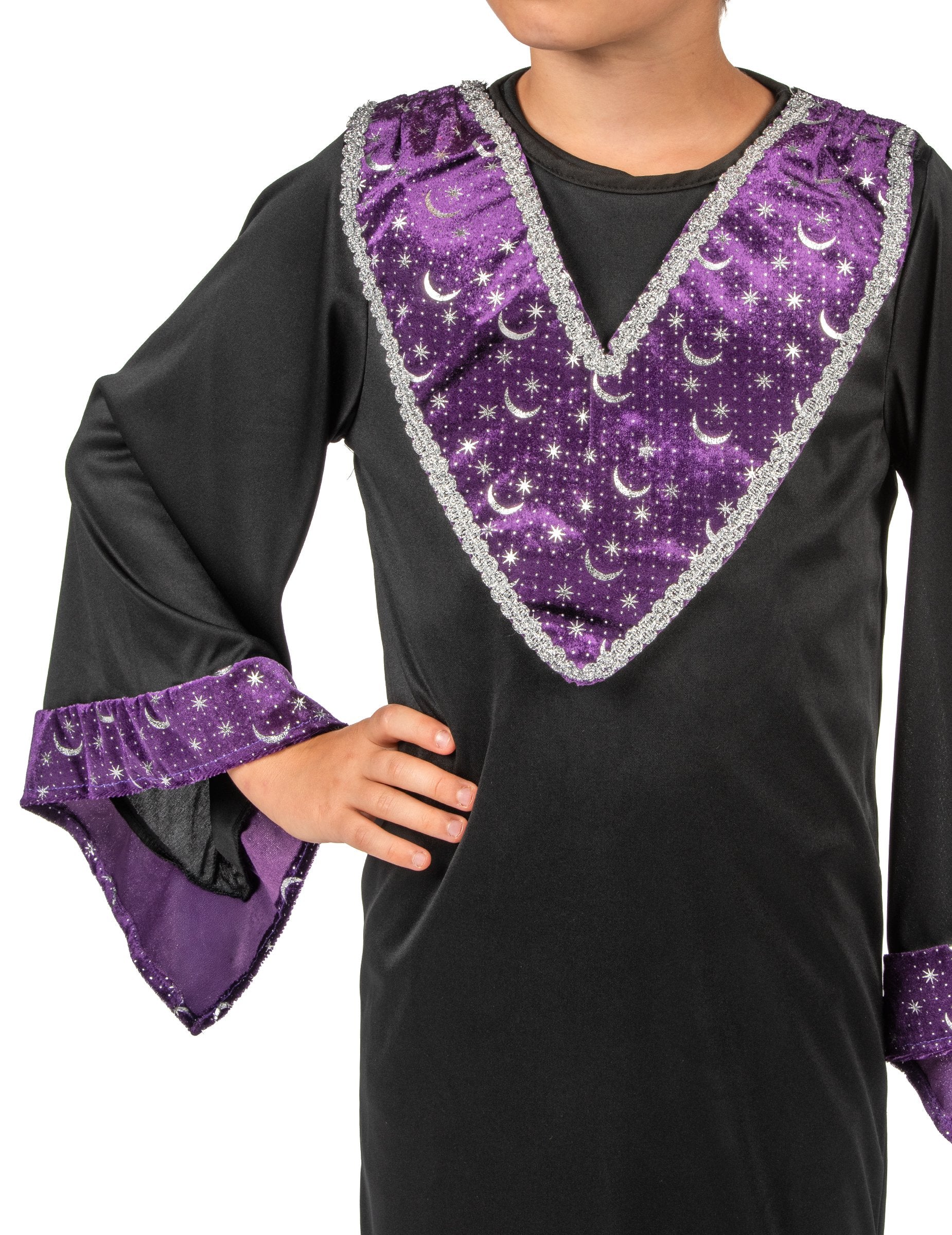 Този костюм на магьосника е за деца. Състои се от дълга рокля и заострена шапка. Роклята е изцяло черна. Лилава яка със сребърни звезди се надраска по раменете. Краищата на ръкавите съвпадат с яката. Шапката е активирана с роклята. Този красив магьосник костюм ще бъде идеален за Хелоуин, Карнавал или да предложи на рожден ден.