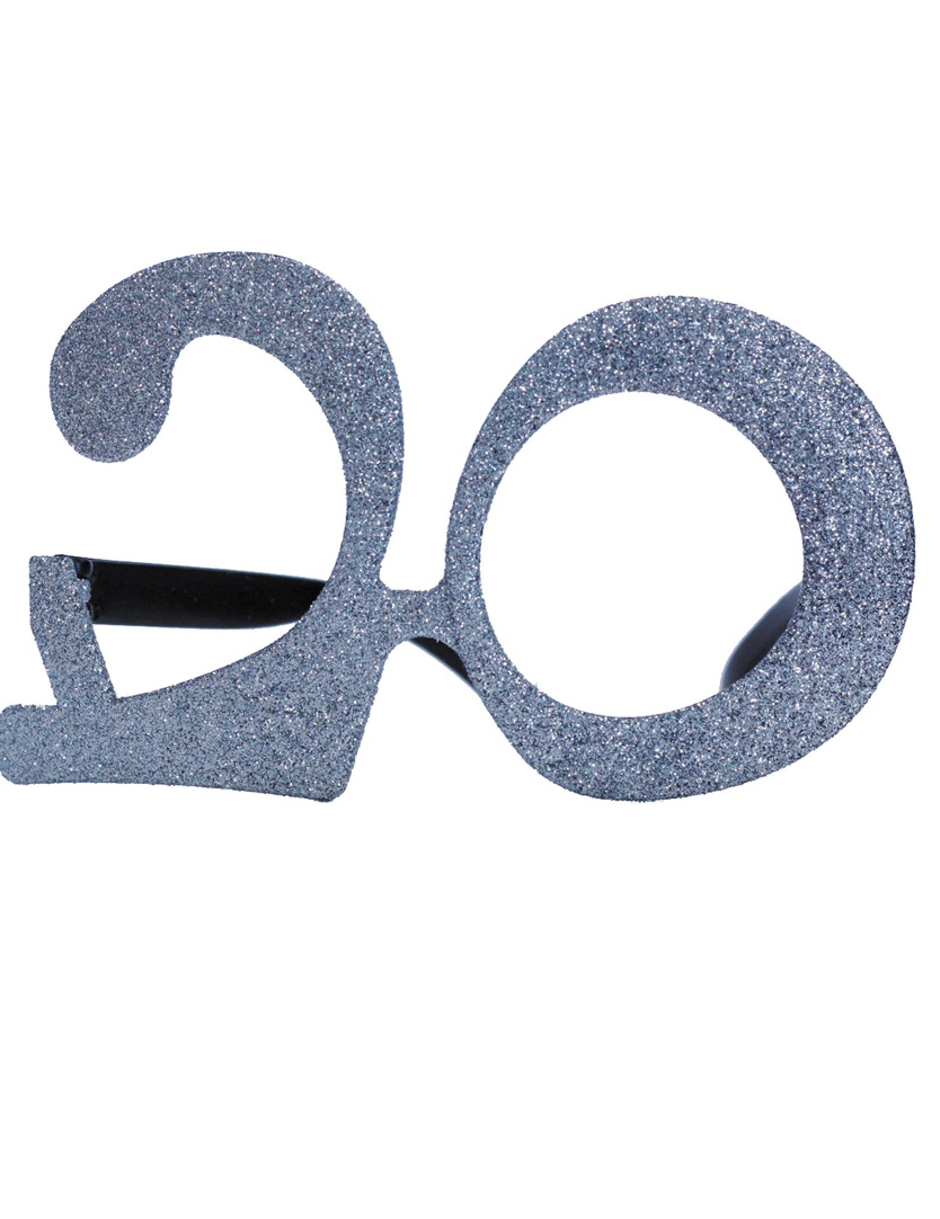 Тази двойка пластмасови очила представлява фигура 20, в алюзия на възраст 20 години. Рамката е покрита със сребърни пайети. Очилата са около 14 см широки. Те нямат очила. Клоните са черни и са с дължина приблизително 13,5 см. Този аксесоар ще бъде от съществено значение за вашето парти за рожден ден за вашите 20 години!