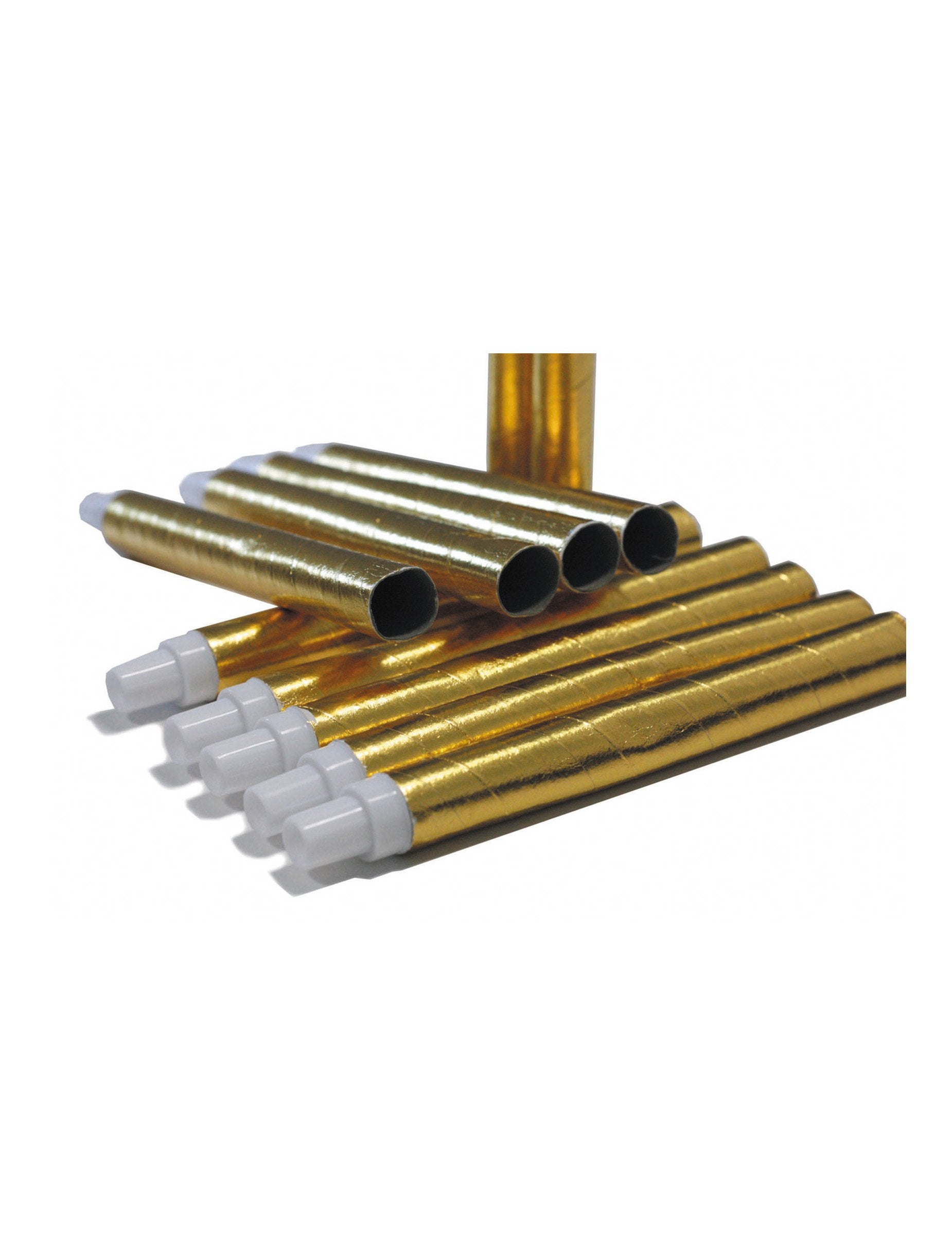 Тази партида съдържа 6 златни картонени сарбакани. Всеки сарбакан с размери приблизително 18 см дължина и с диаметър 1,8 см и има бял пластмасов връх. Предложете тези сарбакани на вашите гости и се забавлявайте с прикритите си вечери!