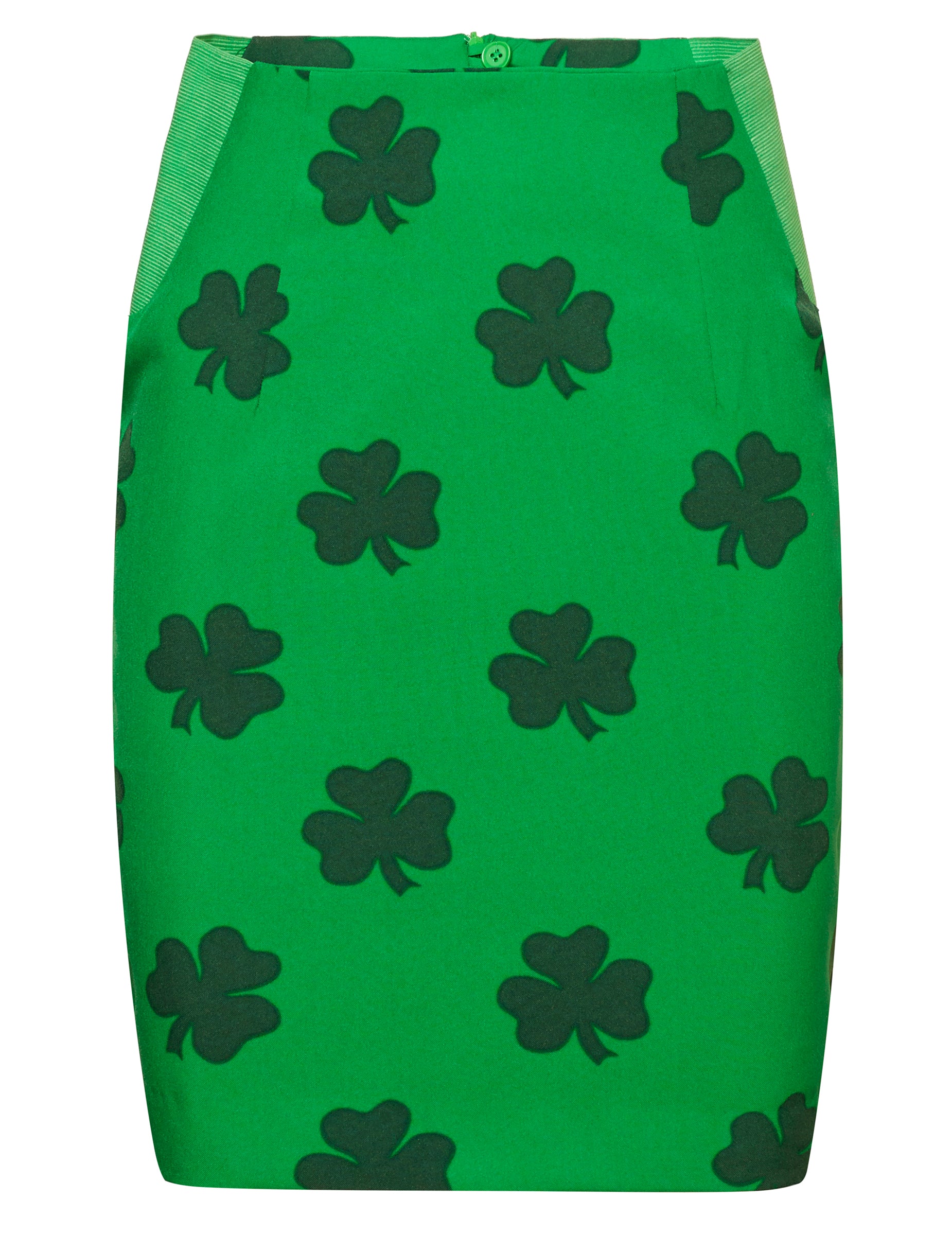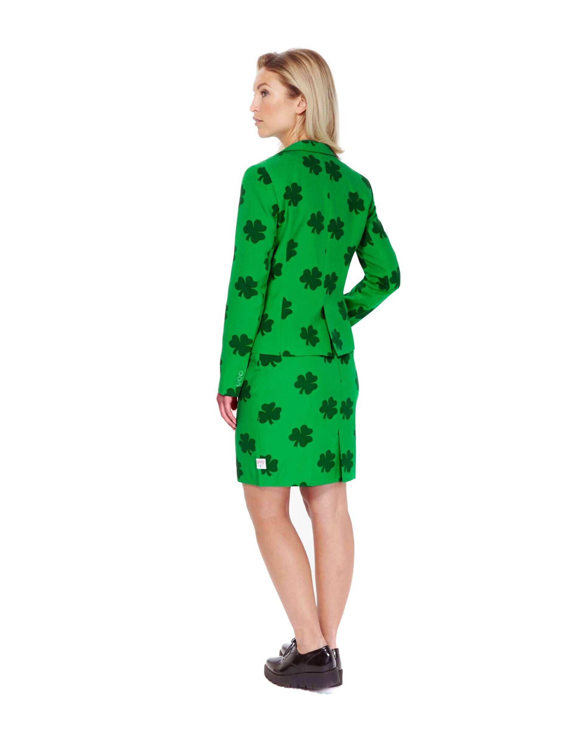 Този костюм противоположности на жените се състои от яке и пола (високо и обувки не са включени). Цялото е направено в зелено качество на плат с много модели на детелина. Якето има 2 фалшиви джоба и се затваря с бутон. Поспата има 2 големи еластични ленти в кръста и се затваря с невидим цип. Тази детелина противоположности ще бъде идеална за оставане на шик и оригинален в деня на Сейнт Патрик.
