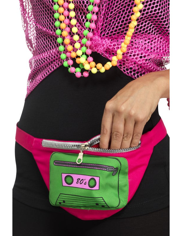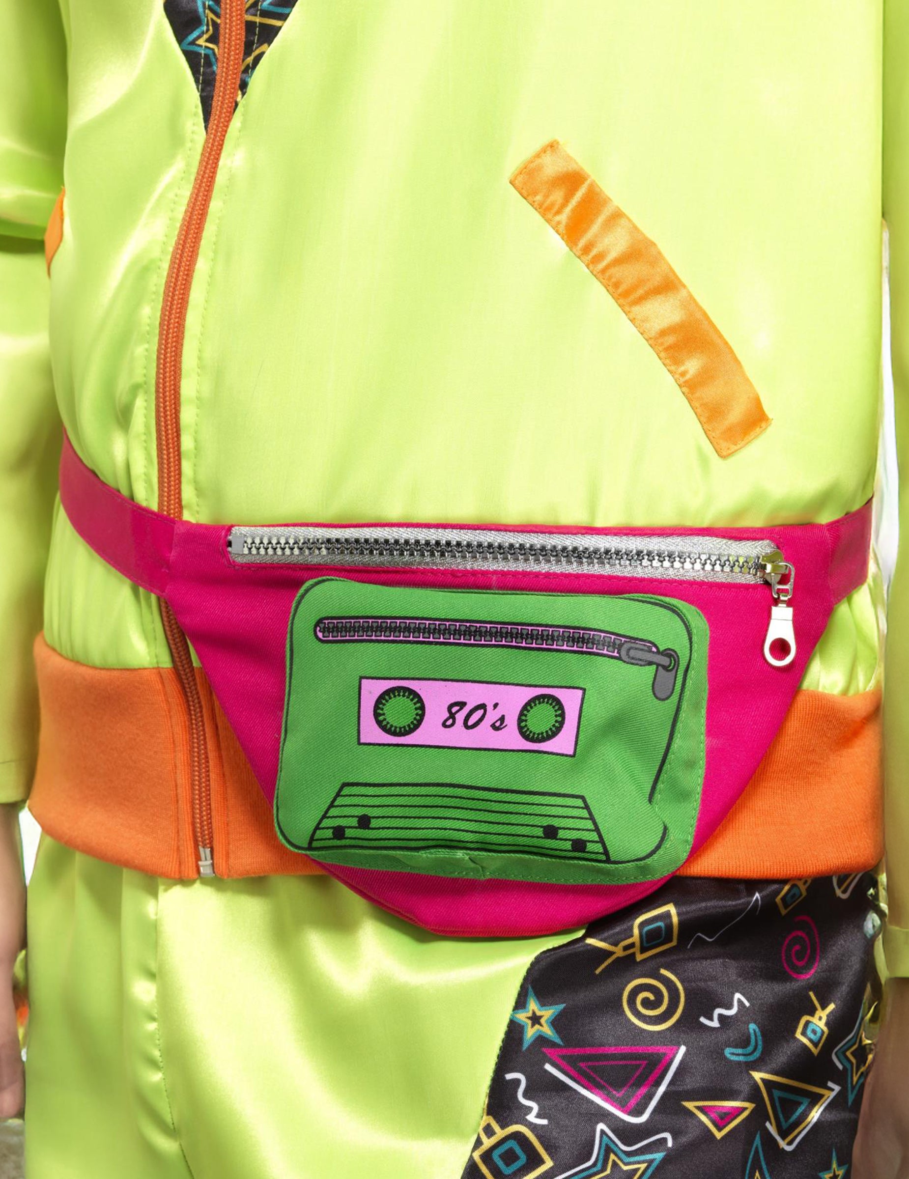Тази бананова чанта е многоцветна. Тя е розова и има доста отпечатана зелена касета. Надписът "80 -те" също присъства отпред. Леко затваряне ви позволява да затворите банана. Ще го носите лесно около кръста. Той в идеалния случай ще завърши облекло в стил 80 -те по време на прикрита вечер!