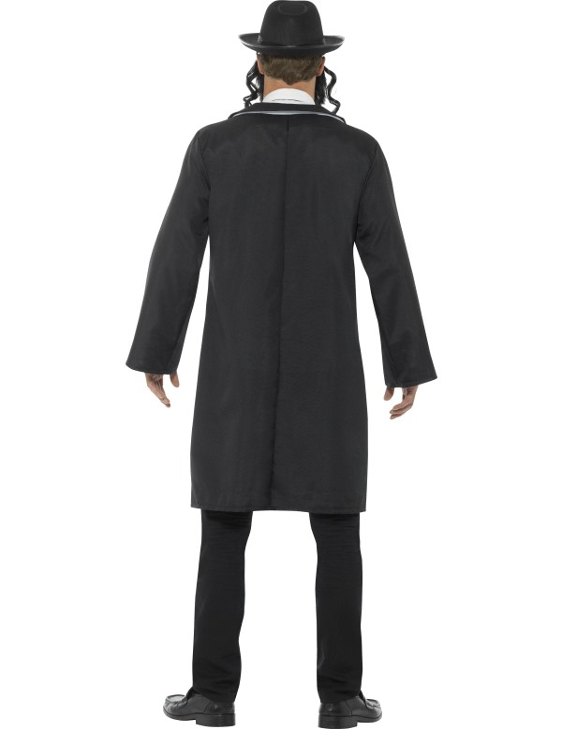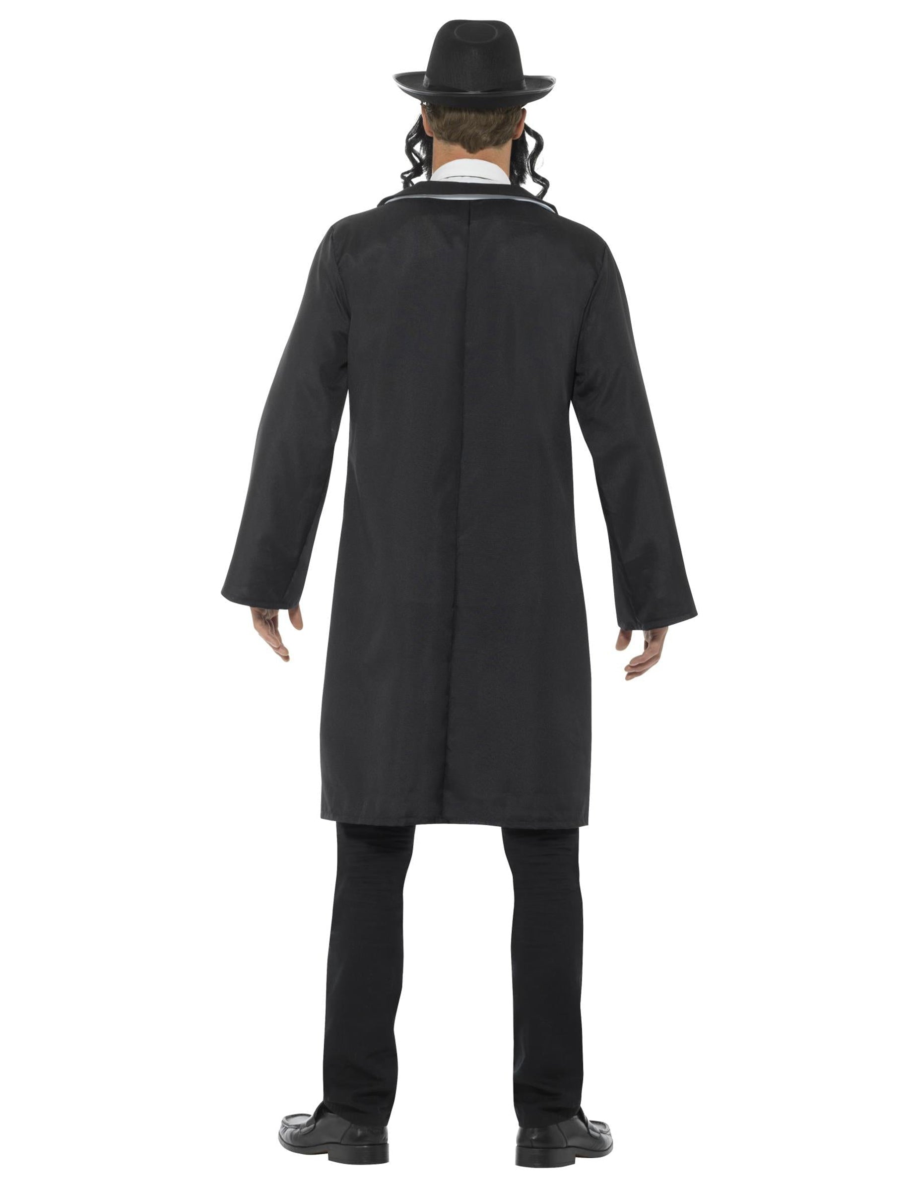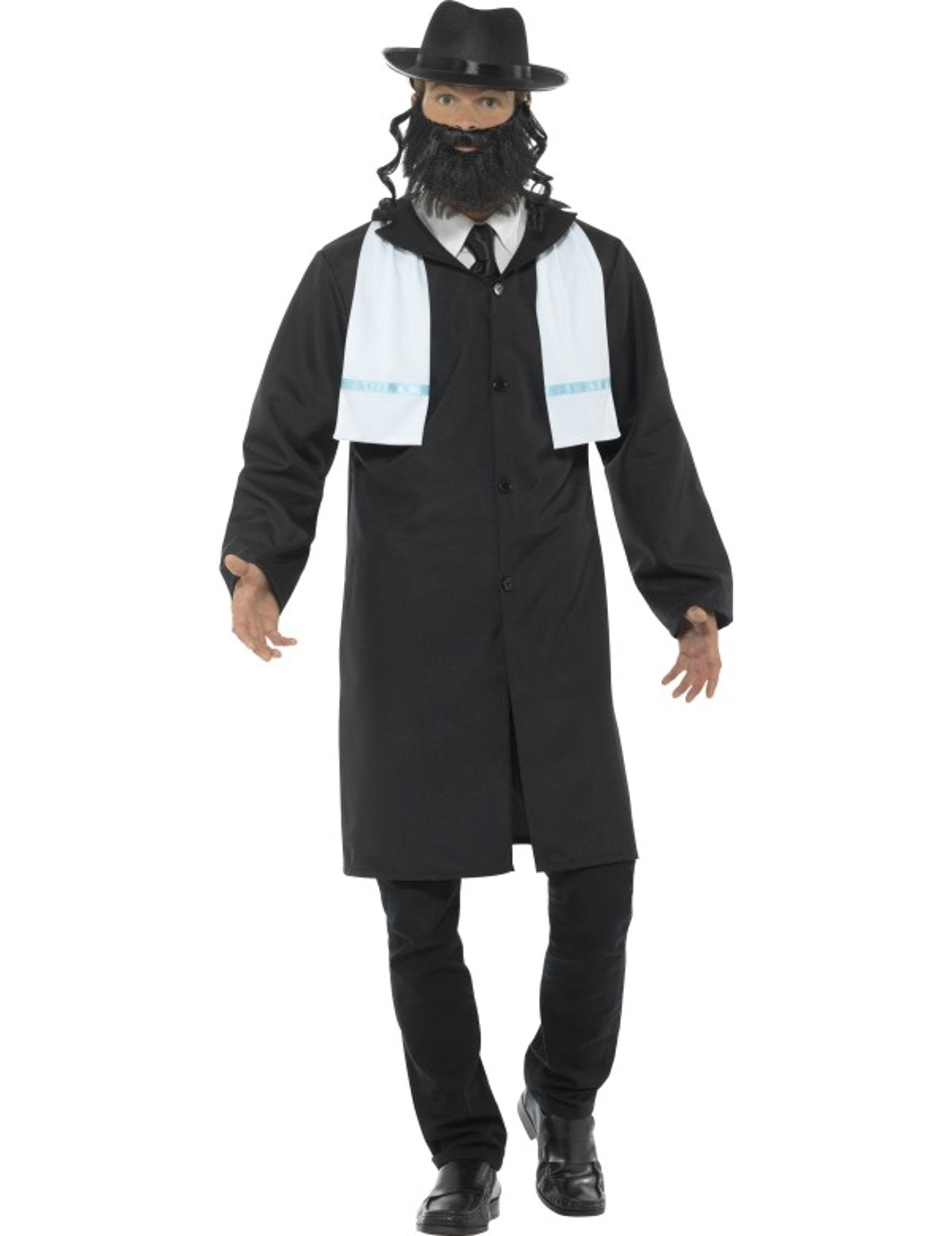Тази маскировка за равин за възрастни съдържа яке, шапка, шал и брада (риза и вратовръзка не са включени). Черното яке е дълго. Шапката е черна и твърда. Той е заобиколен от панделка и две фитили от черна коса, образуващи къдрици, са окачени. Белият шал е много мек и се приземява на раменете. На всеки край присъства малка светлосиня панделка. Брадата покрива цялото долно лице, а също така прави мустаци. Той се носи благодарение на еластична зад главата. За оригинален карнавал, ето костюм на равин, който ще ви подхожда перфектно!