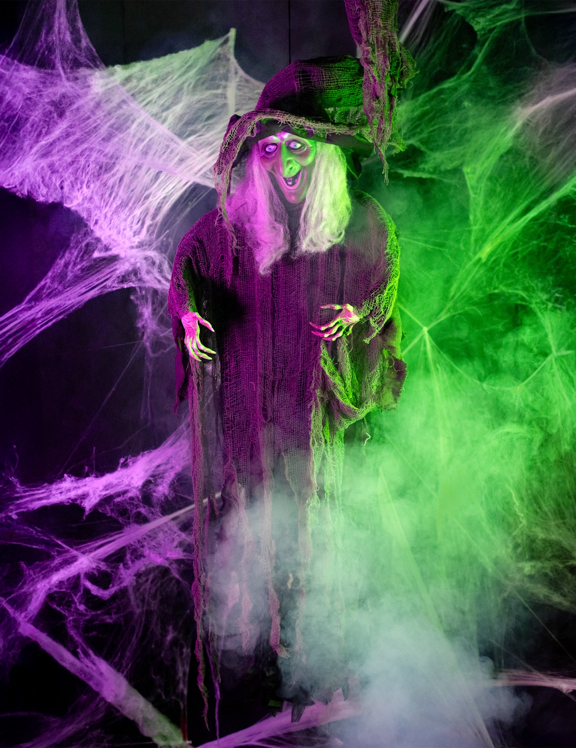 Тази декорация има височина 190 cm. Тя представлява вещица, облечена в черна рокля и шапка. Струн ви позволява да го закачите, където и да искате. Ще бъде идеално да плашите гостите си по време на Хелоуин вечер!