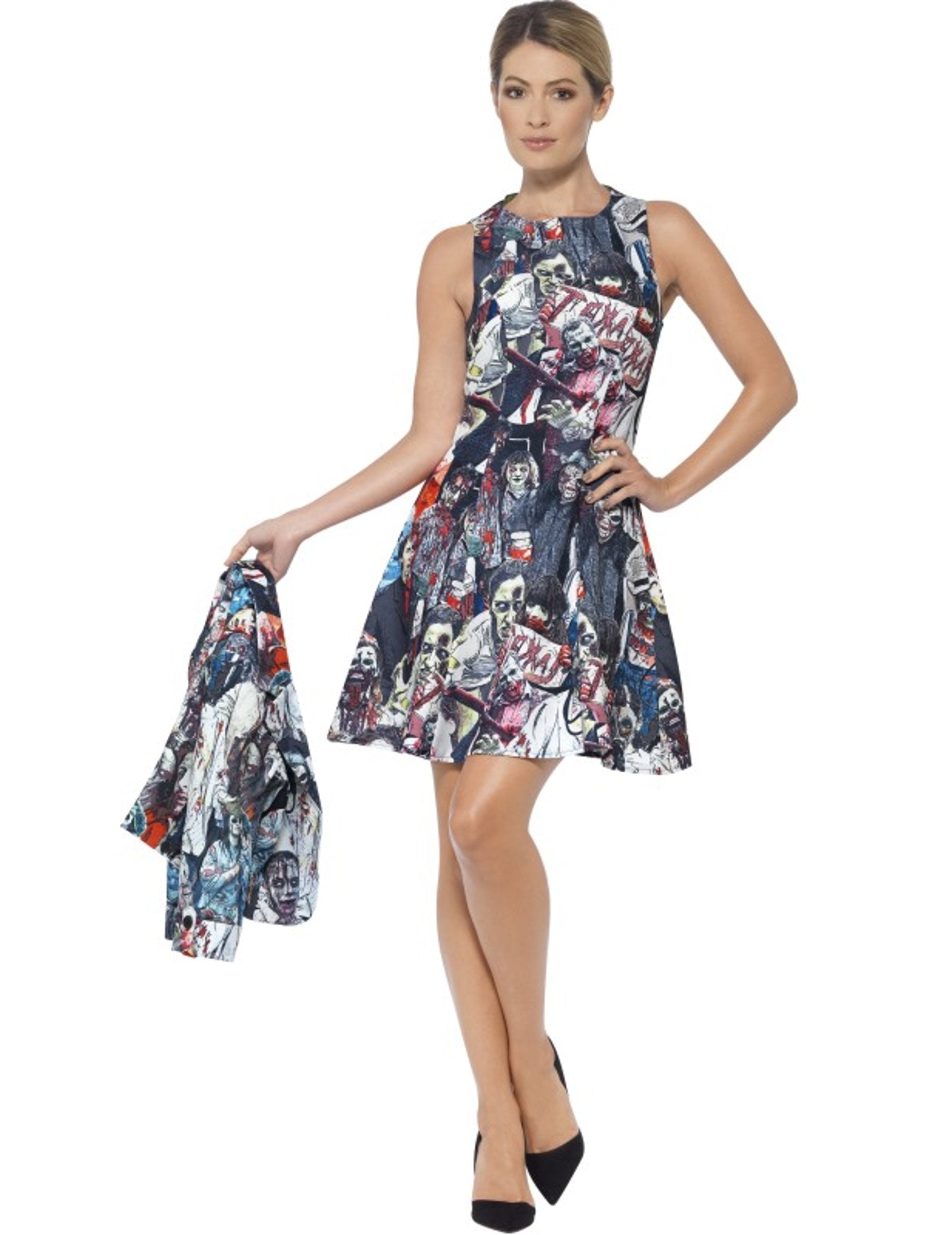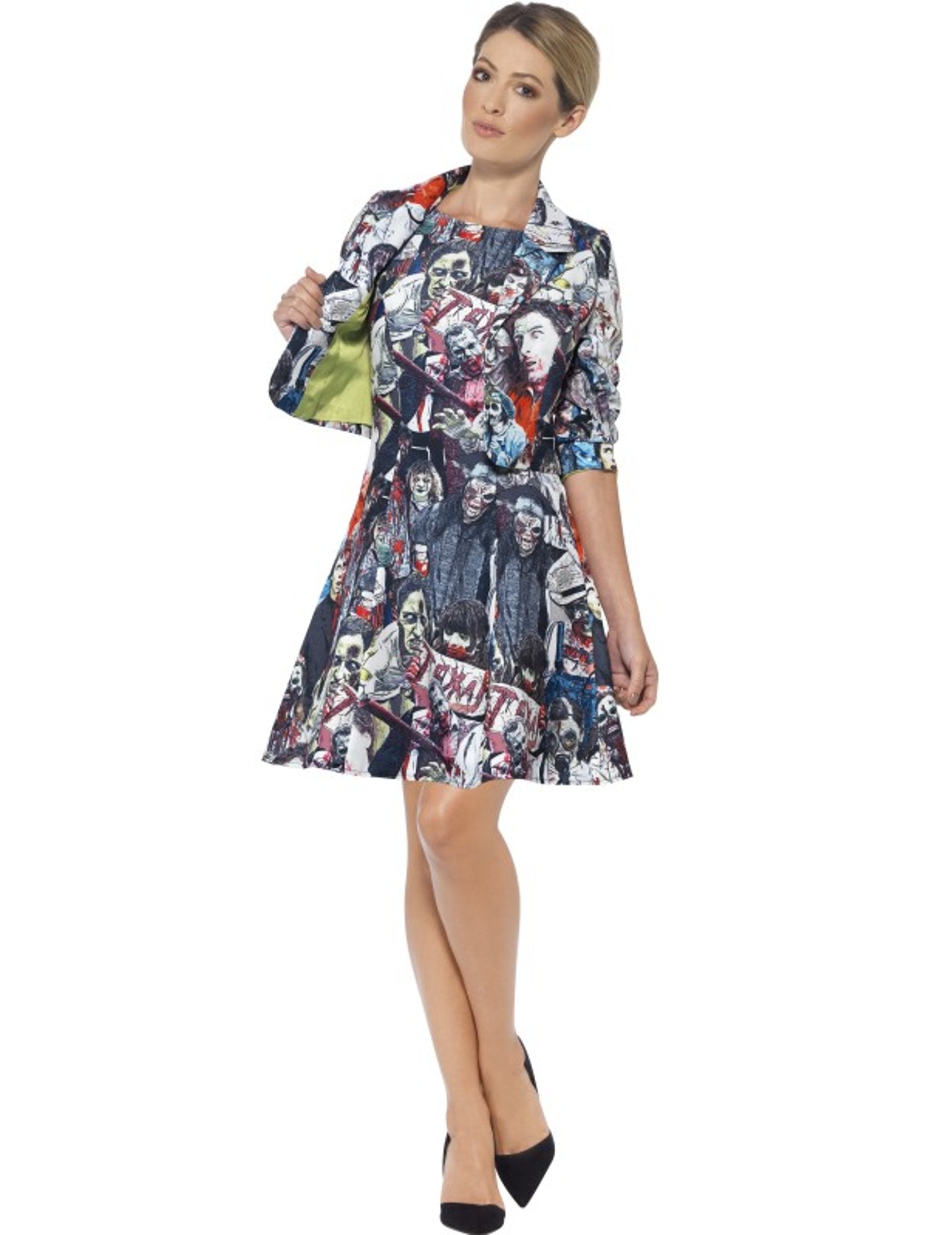 Този костюм г -жа Зомби за жени се състои от рокля и яке (чанта и обувки не са включени). Цялото е отпечатано с зомбита. Роклята е къса и пламна на дъното. Има широки окачватели. Якето е късо и има половин дълги ръкави. Преместете костюма си за Хелоуин от този елегантен костюм и изненадайте приятелите си!