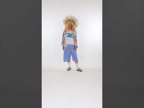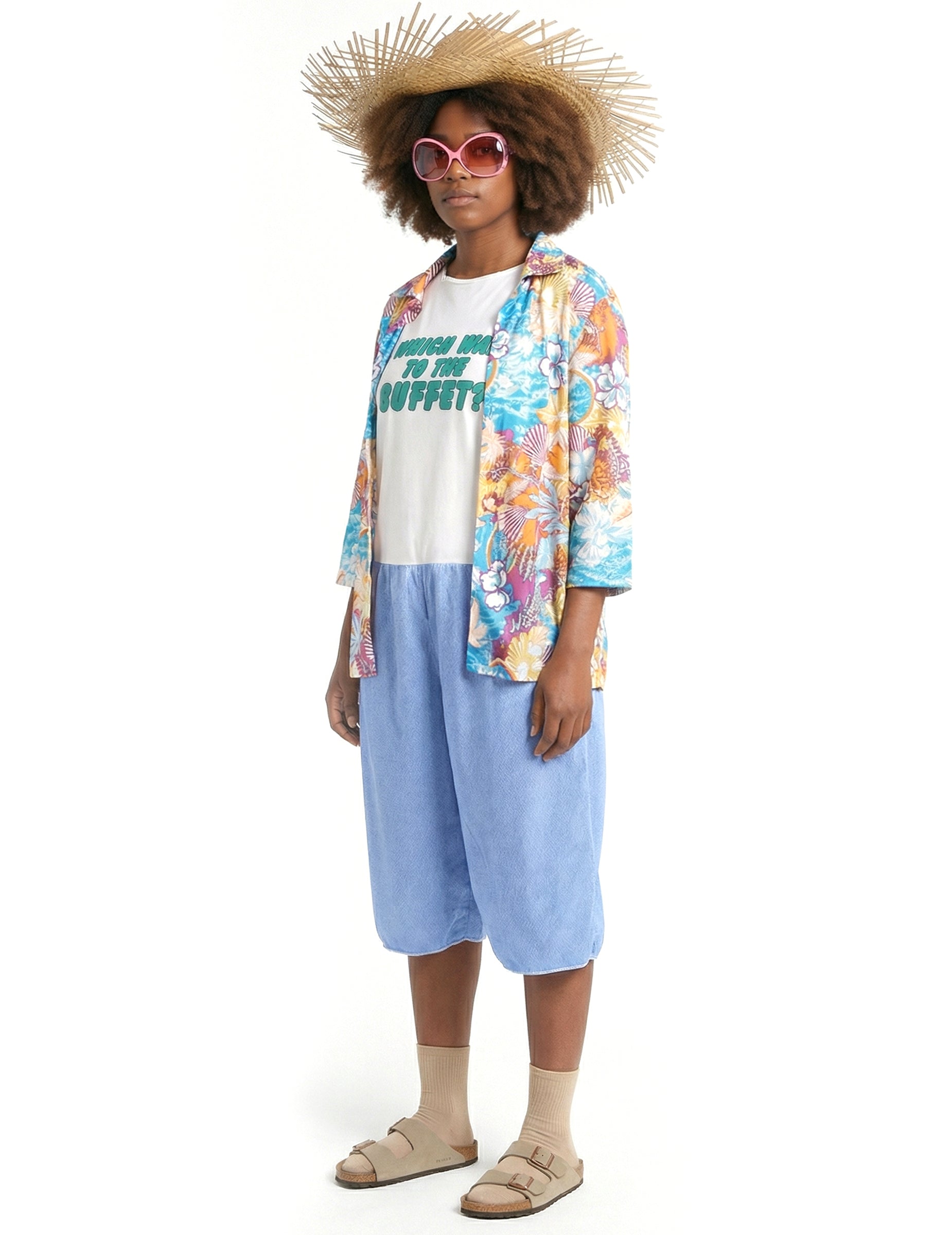 Тази туристическа маскировка за възрастни се състои от комбинация и риза. Комбинацията има обръч в кръста, за да придаде обемист и по -дебел ефект на вашия Silouhette. Върхът на комбинацията представлява бяла тениска. По -горе можем ли да прочетем "Кой път към бюфета?" (На английски език къде е бюфетът?). Дъното представлява сини къси панталони. Хавайска риза завършва този костюм. Той е отпечатан с многоцветни цветни шарки. Този костюм ще бъде идеален за игра на перфектните туристи по време на вечер, прикрита, пълна с хумор.