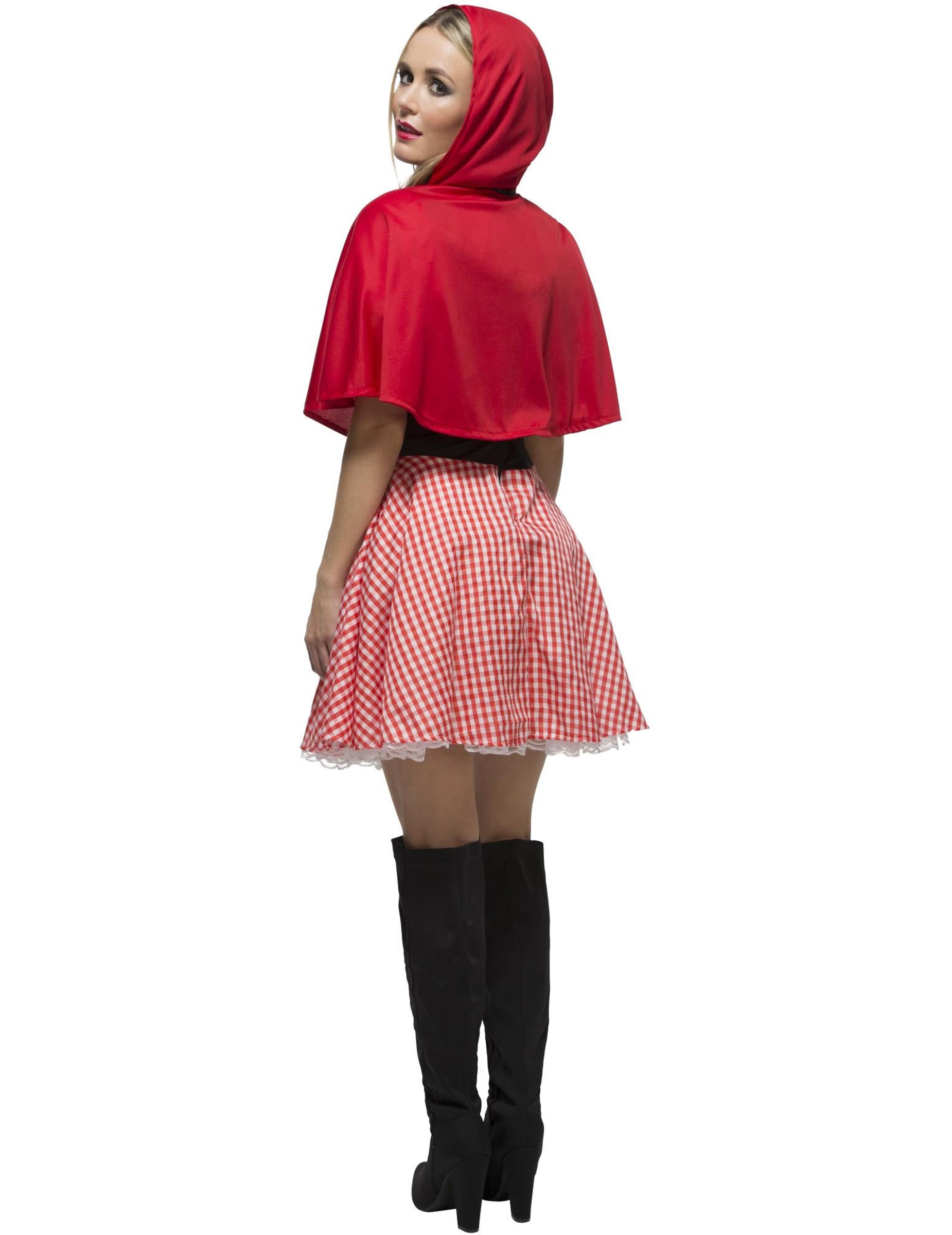 Този малък костюм на червен шаперон за жени се състои от рокля и нос (фуста, дъното и обувките не са включени). Роклята имитира бял бутер блокер, подчертан от фалшив черен корсет, за да се извие и секси ефект, който ще подчертае. Червената и бяла пола с плочки създава красив контраст с черния корсет и бялата блуза. Кратък нос с червена капачка за тъкани с червена сатетина завършва тоалета. Тази маскировка на малък червен шаперон е идеална за вечер по темата за приказките!