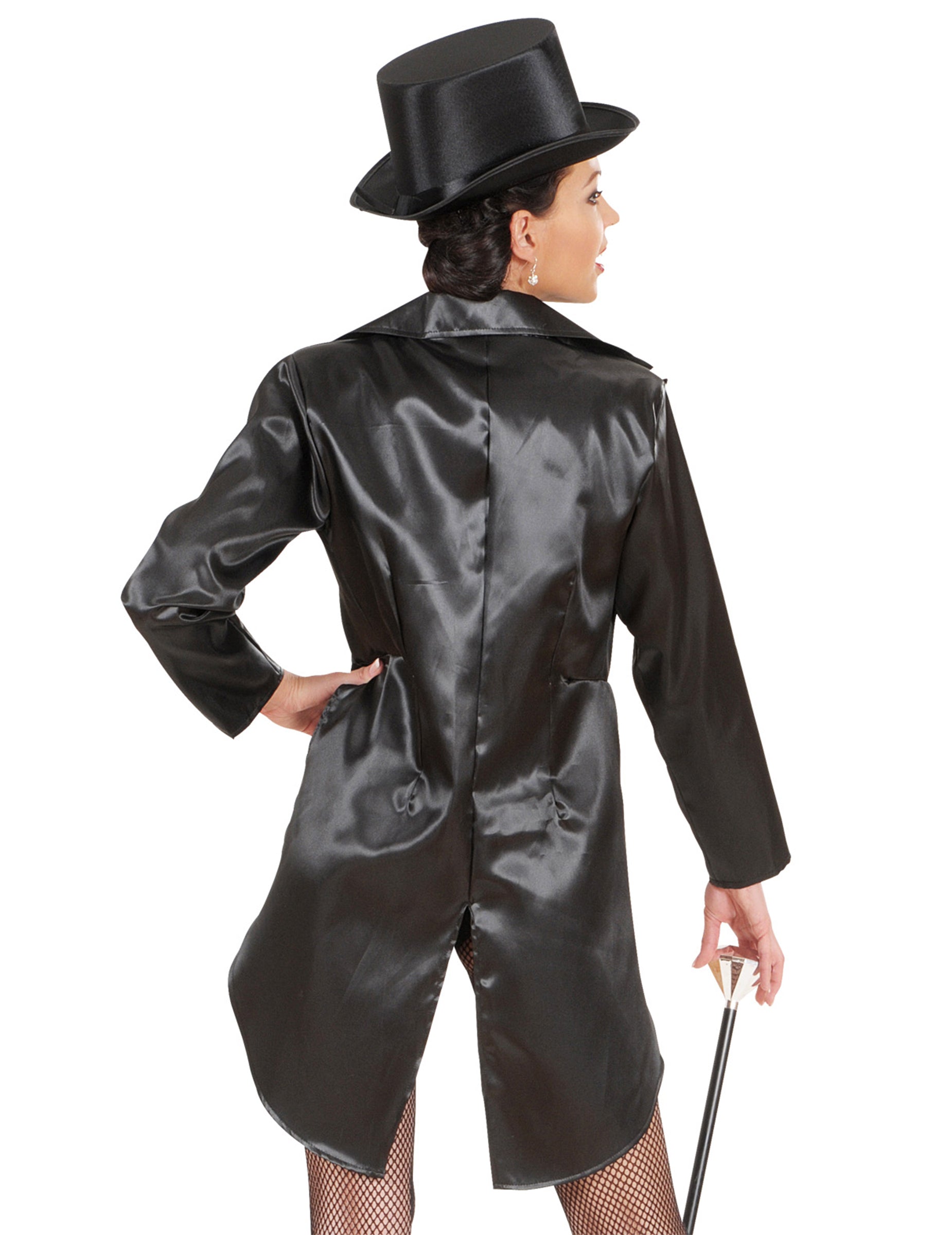 Този превъзходен фрак за опашка за жени е черен цвят (комбинация, шапка, бастун, чорап и папийонка не са включени). Той е специално направен за сценичната танцьорка и е проектиран, докато блестящ сатен. Този фрак може да се носи по време на шоу (например магия) или по време на карнавалното парти. Copyright Widmann Srl