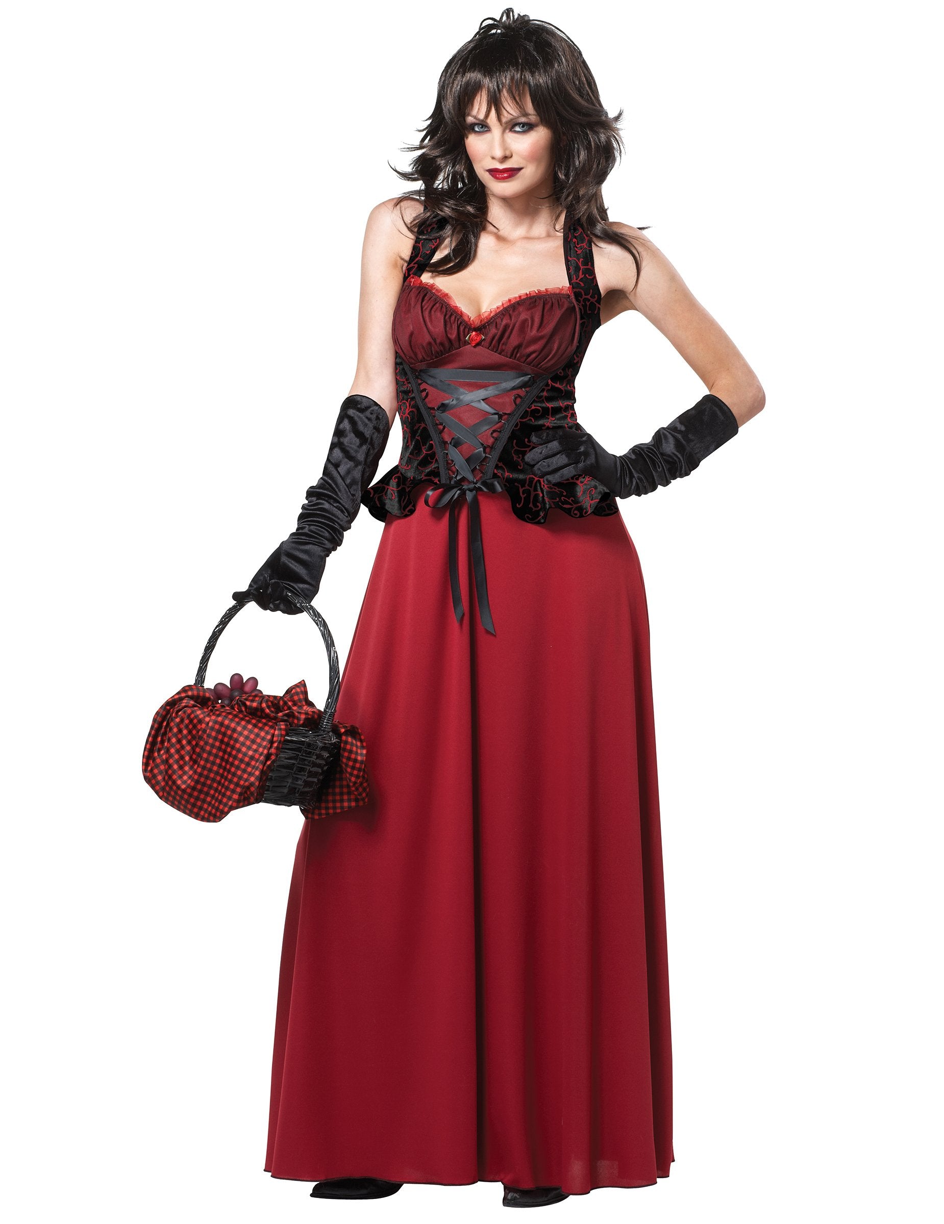 Това прикриване на малка зъл качулка за червено езда за жени се състои от рокля, нос с качулка и носна кърпа (кошницата и ботушите не са включени). Дългата рокля е червена и черна. Тя има черно облицоване на бюста за секси корсет ефект. Тази рокля е придружена от дълъг червен нос с качулка и карирана носна кърпа тази гадна маскала малка качулка с червена езда е идеална за Хелоуин или за вечер на темата за ужаса!