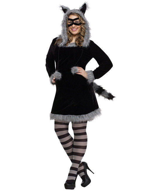 Тази маскировка на миеща мечка включва опашка, качулка за уши, чорапогащи и маска. Роклята е в черно кадифе и сива козина. Раирана опашка и чорапогащи, маскирани очи и изправени уши, ще се объркате с прикрити фестивали.