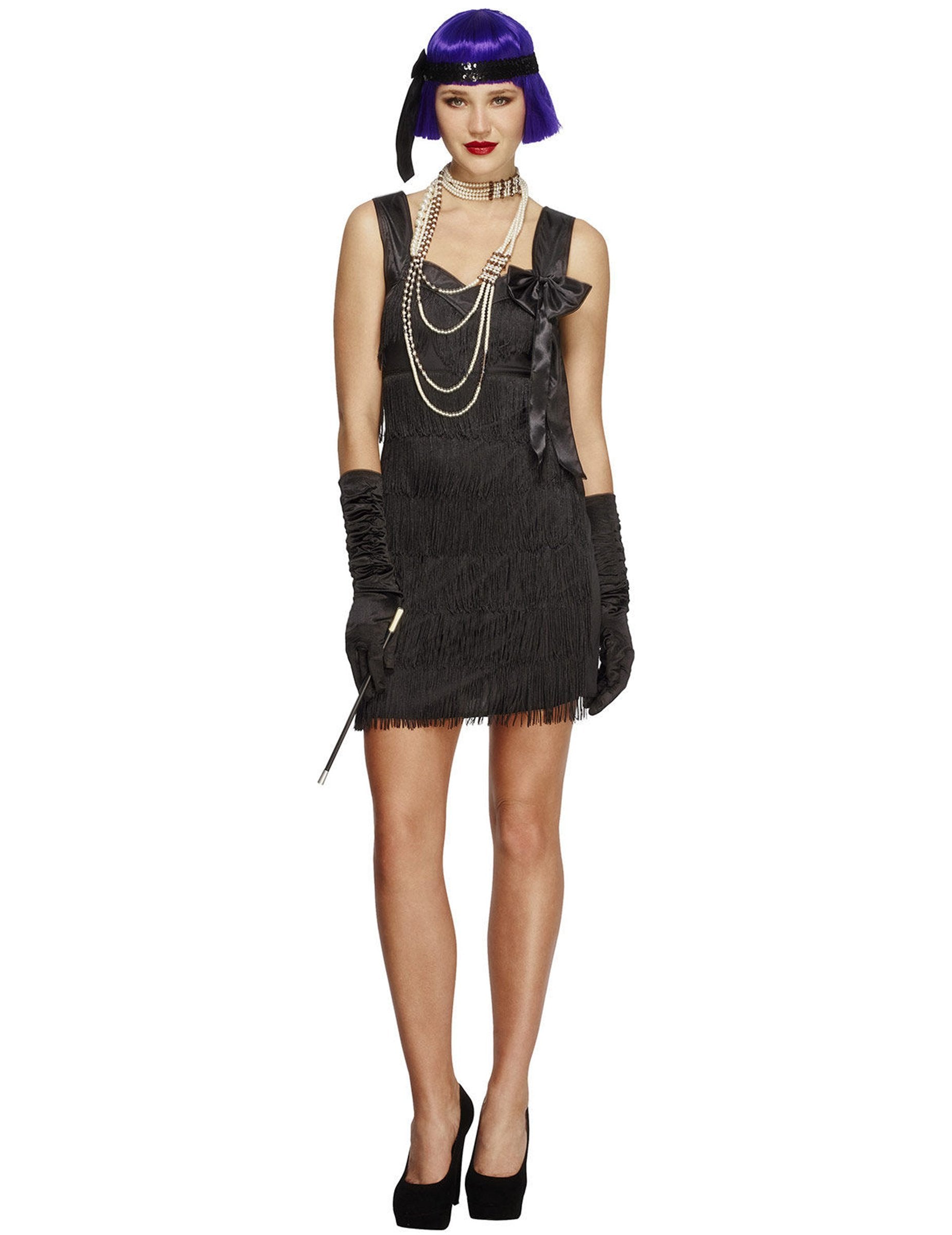 Този костюм на Чарлстън за жени се състои от рокля, лента за глава и ръкавици. Черната рокля е оградена със сатенени оферти, образуващи възел отпред. Голям вертикален волан облича гърба на роклята. Черните ръкавици са дълги и събрани. Черният банер с пайети също има малък възел. Тази маскировка с 20 години е подходяща за вечери в тематичните 20 -те години или за всяко прикрито събитие.