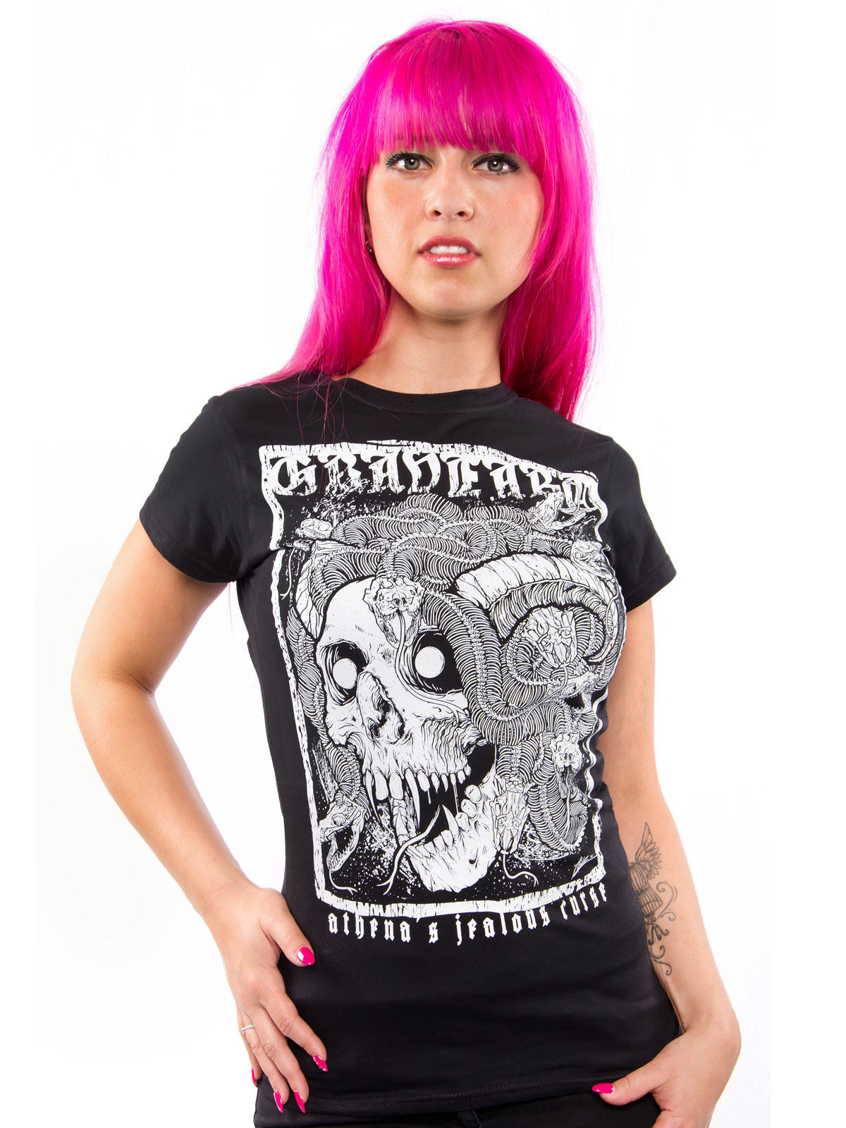 Този черен топ с черепи за жени е идеален за бунтарска и мистериозна визия. Украсен с голям бял мотив на череп, включващ рога и змии, той добавя рок и тъмен щрих към вашето облекло. Черно-белият контраст е привличащ вниманието и перфектно подчертава вашия стил. Удобен и лесен за съчетаване с тъмни панталони или къса пола, този топ бързо ще се превърне в ключова дреха от вашия гардероб. Перфектен за Хелоуин парти!