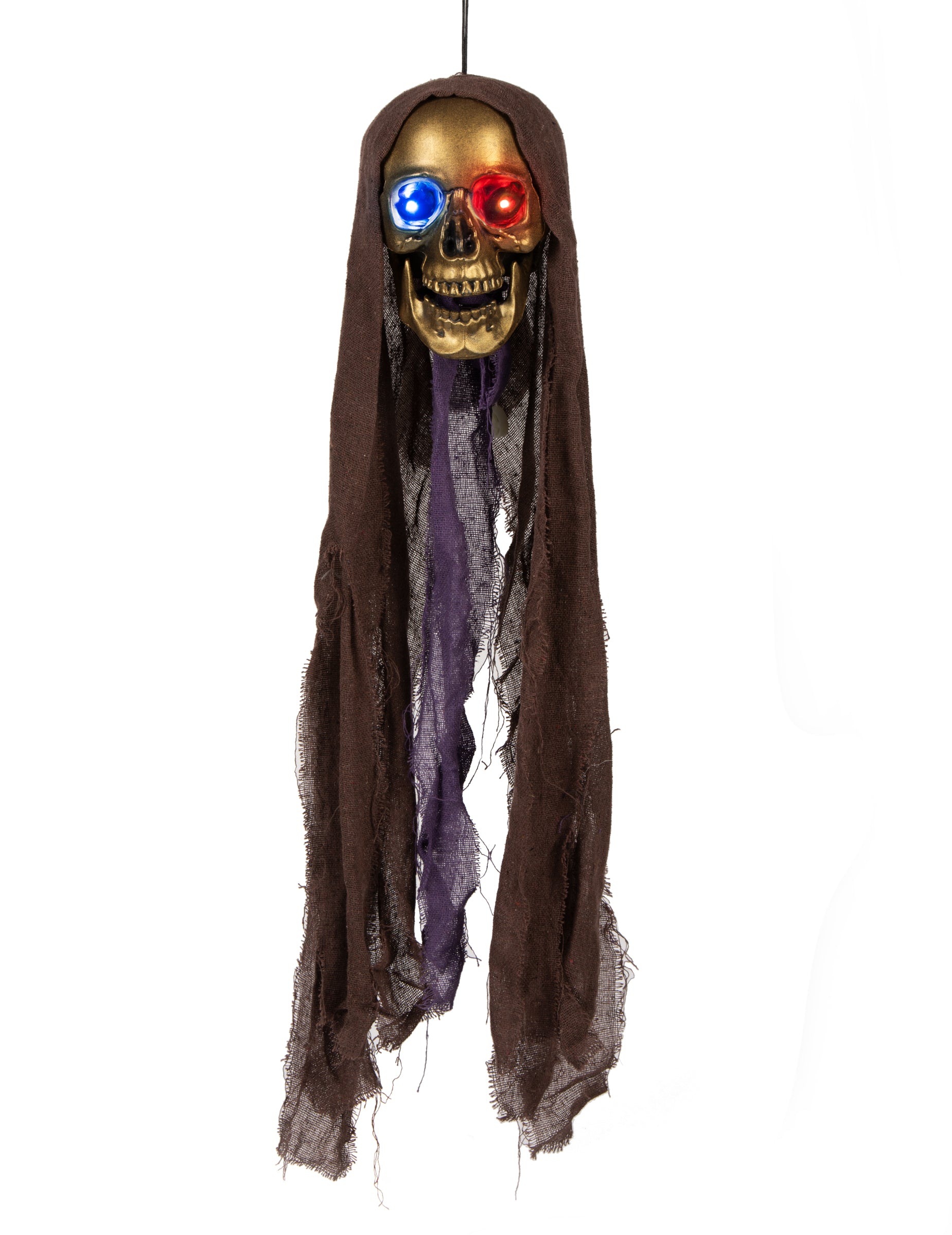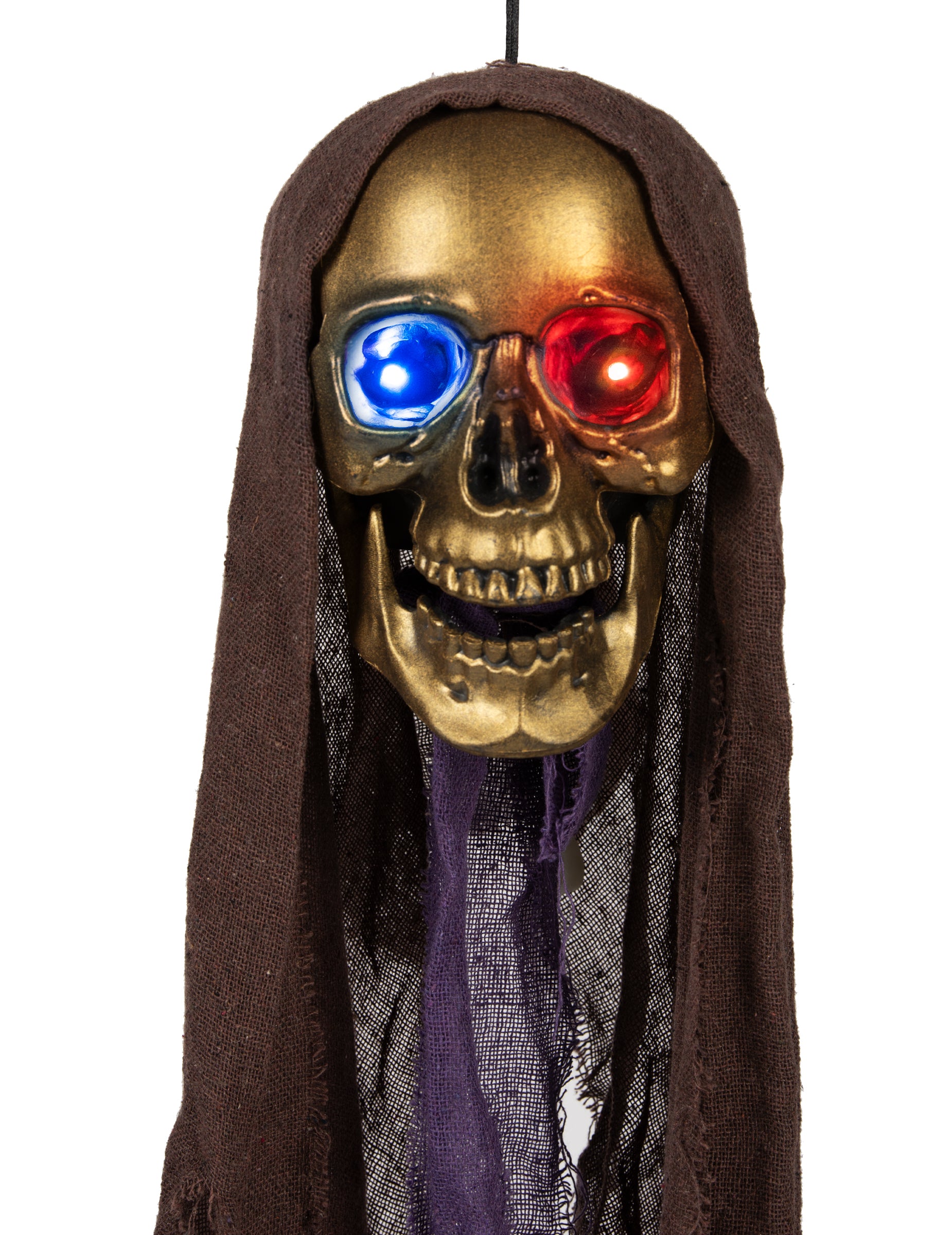 Ето една превъзходна скелетна глава с патина, напомняща износена мед. Със своите разкъсани воали и широко отворени челюсти, тя със сигурност ще изплаши мнозина. Най-добрата ѝ характеристика? С 3 включени батерии тип „копче“ LR44, декорацията ще ви хвърли поглед във всички цветове. Гледка, която би могла да изплаши дори най-проницателното око, ако декорацията е в градината през нощта. В нощта на Хелоуин, оставете въображението си да се развихри, за да създадете ужасяваща декорация, която ще накара приятелите ви да побият тръпки!