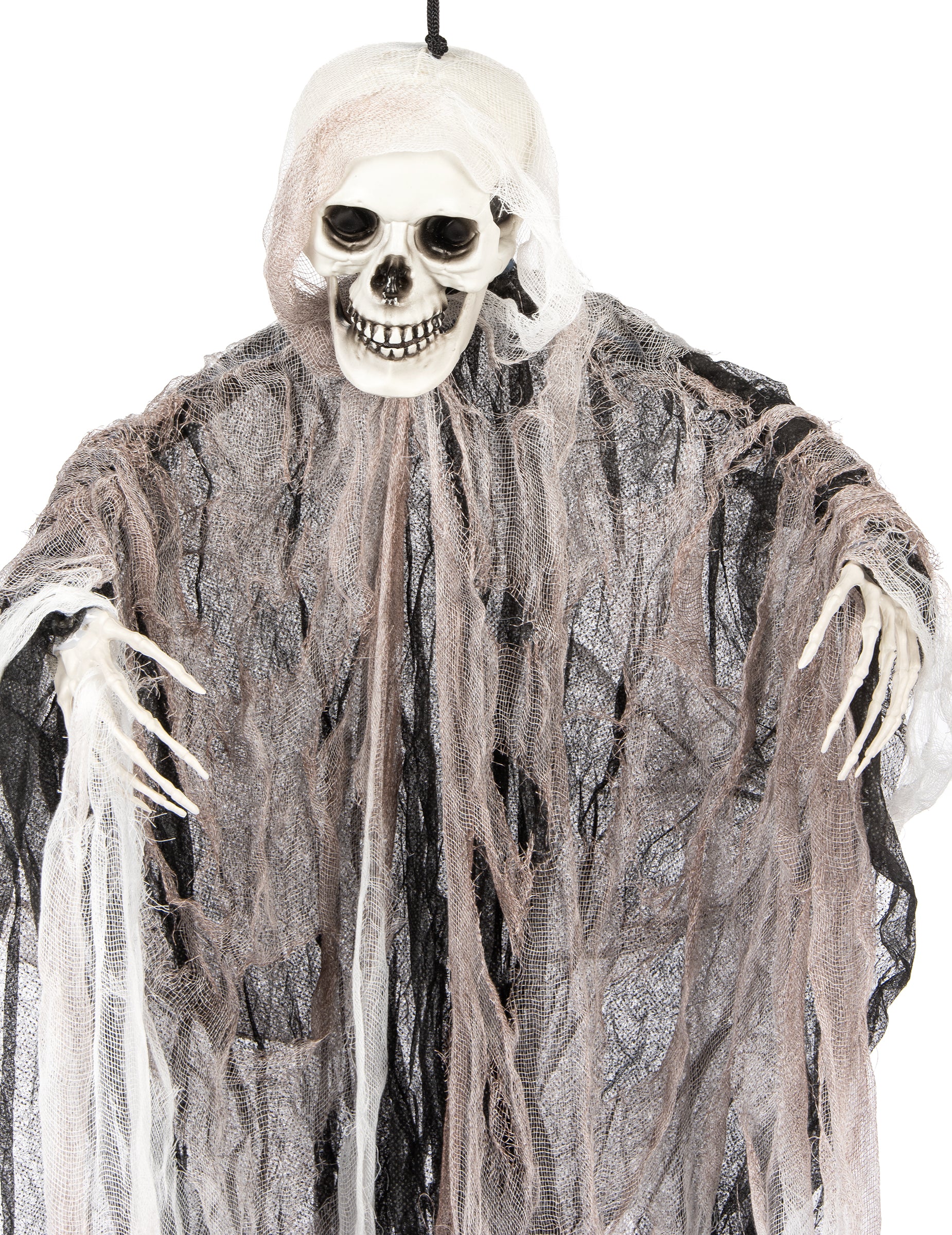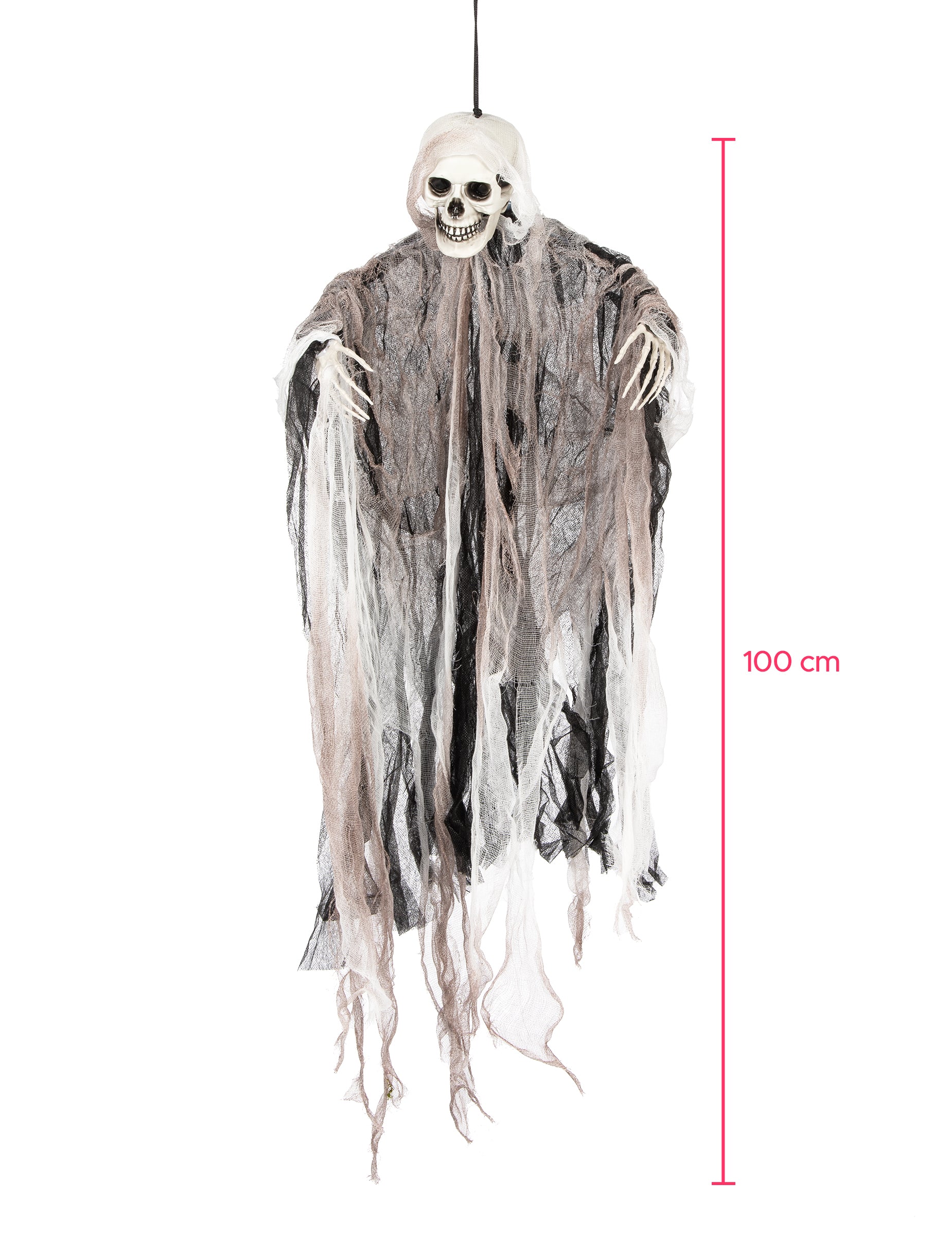Този скелет на Reaper с 1 метър е идеален за създаване на страшна сцена по време на вашите празници на Хелоуин. Неговият грим -череп, скелетните му рамена и многократното му разкъсани завеси образуват силует, който сякаш идва направо от кошмар. Изтритите тъкани в тъмни нюанси усилват спектралния ефект. Лек и прост за окачване, този декор ще бъде идеален за посрещане на вашите гости в мрачна атмосфера.