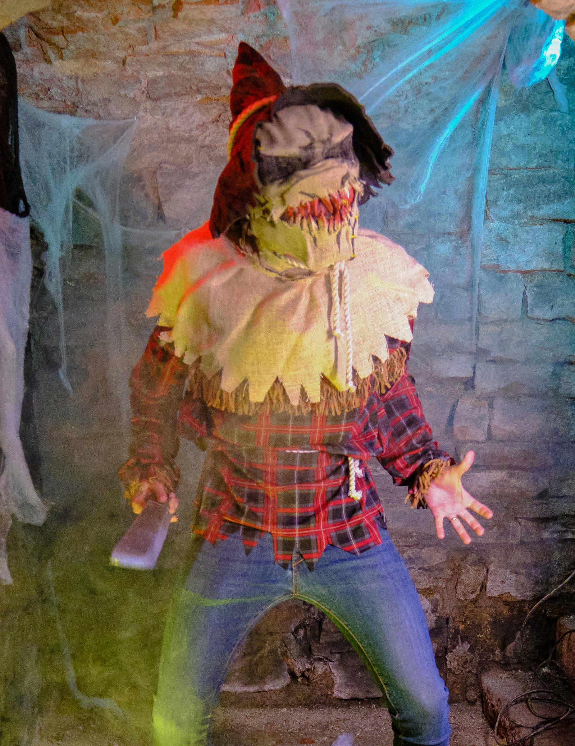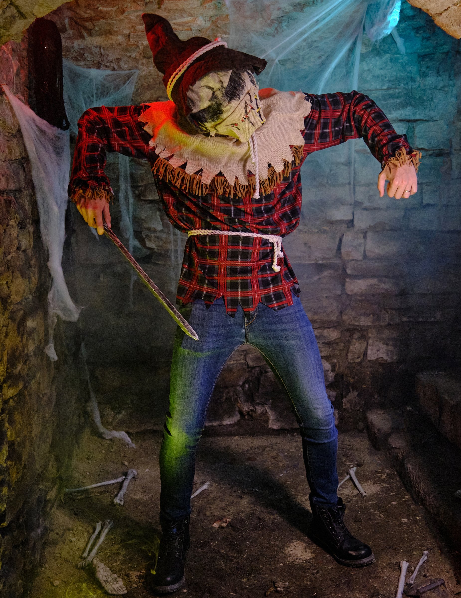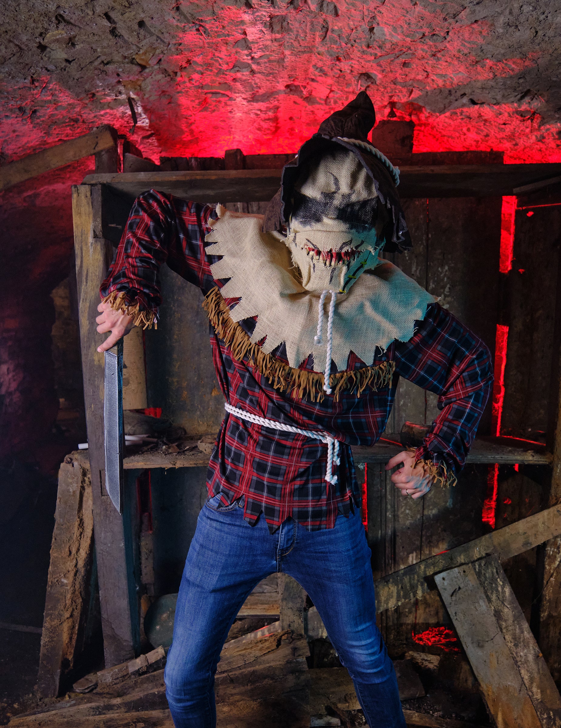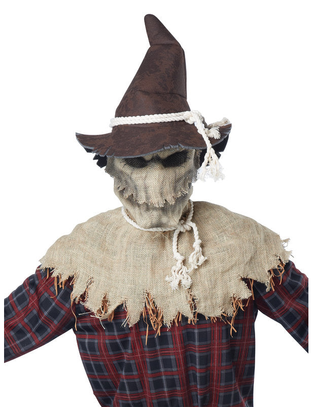 Този костюм за плашило по полиестер за мъже се състои от туника, маска и шапка. Червената и синята проверена туника има дълги ръкави. Колан в стил въжета се връзва в кръста. Яката е изработена от имитация на Burlap за реалистичен ефект. Кафява заострена шапка с декорация на въже и маската завършва тоалета. Маската, Ani-Motion представлява страшна глава на плашилото. Когато отворите челюстта, маската също ще се движи, разкривайки кървави остри зъби. С този костюм за плашило за мъже ще изглеждате така, сякаш сте излезли направо от филм на ужасите! Той е идеален за Хелоуин или тематично парти.