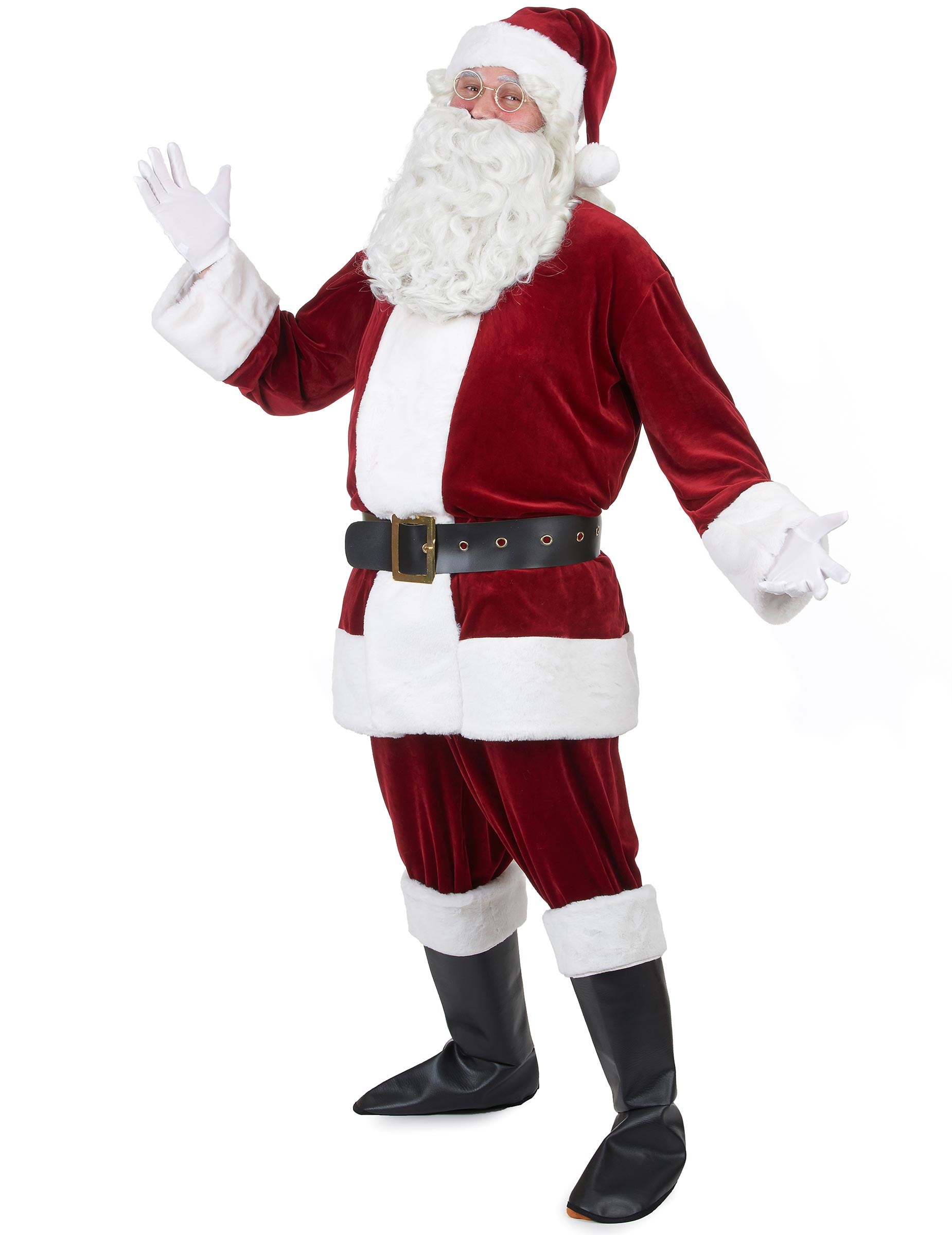 Този костюм на Дядо Коледа с кадифен ефект е за възрастни. Той включва шапка, яке, къси панталони, калъфи за обувки, колан и брада. Целият костюм е изработен от дебела, много мека материя с кадифен ефект, която ще се окаже много удобна. Якето се закопчава отпред с копчета тип „тик-так“, а късите панталони имат ластик на талията. Шапката е с обиколка на главата 62 см. cm Коланът, с металната си катарама и дебел, подобен на кожа материал, ще украси талията ви, придавайки ви характерния за Дядо Коледа едър вид. Брадата, изработена от красиви бели синтетични къдрици, ще бъде закрепена на място от ластици. И накрая, калъфите за обувки, с белите си маншети от изкуствена кожа и тяхната дебелина, ще създадат перфектна илюзия по време на коледните празници. Независимо дали се появявате на пазар или на семейно събиране, със сигурност ще създадете усещане за чудо около себе си с този кадифен костюм на Дядо Коледа!