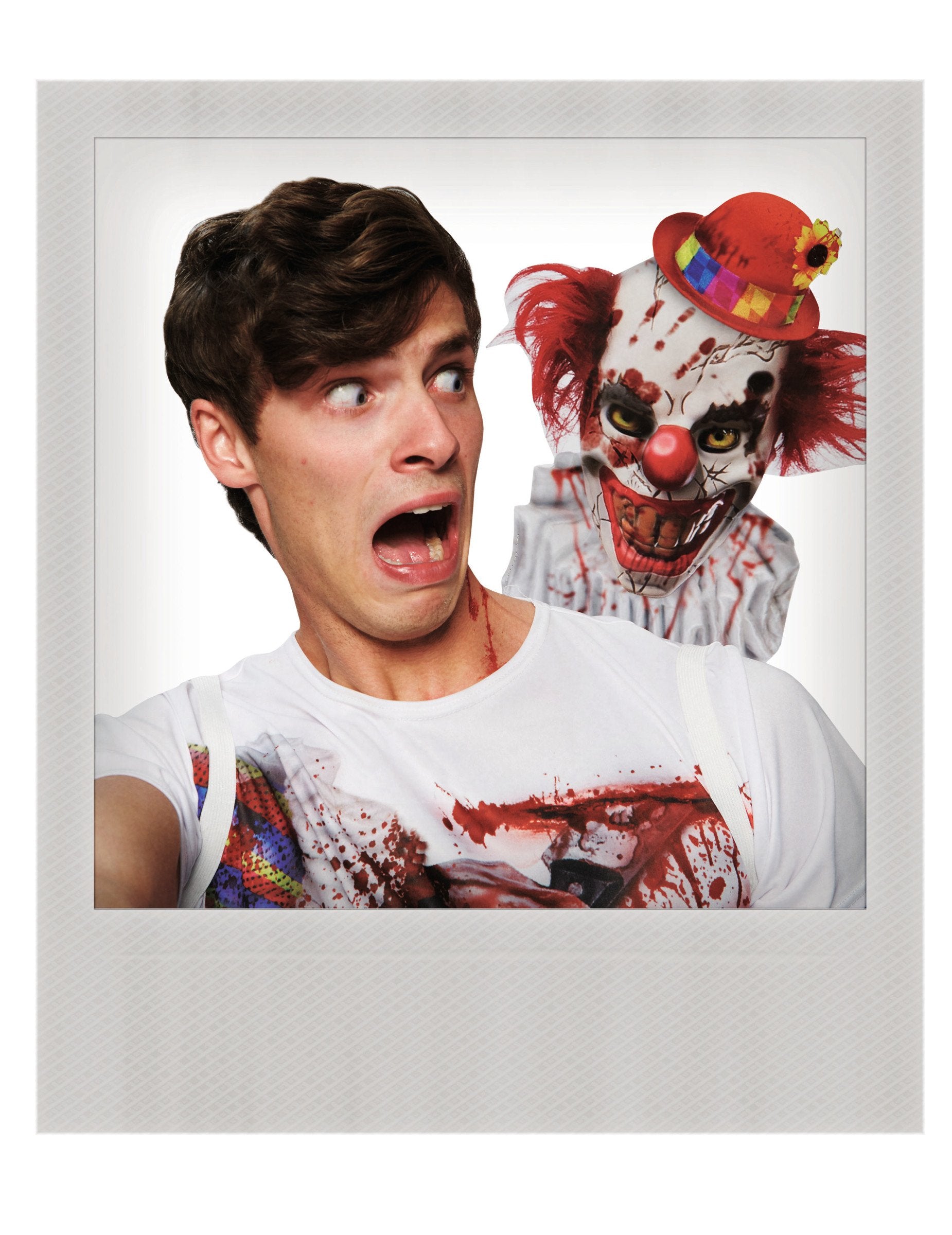 Тази селфи тениска е за възрастни. Той е бял и с къси ръкави. Той има отпечатък от две ръце на клоун, заобикалящи гърдите, както и фалшиви следи от кръв отпред. В задната част на тениската има страшна картонена глава на клоун, за да ви позволи да направите снимка с нея! Тази тениска ще бъде идеална за по-страшен селфи по време на Хелоуин!