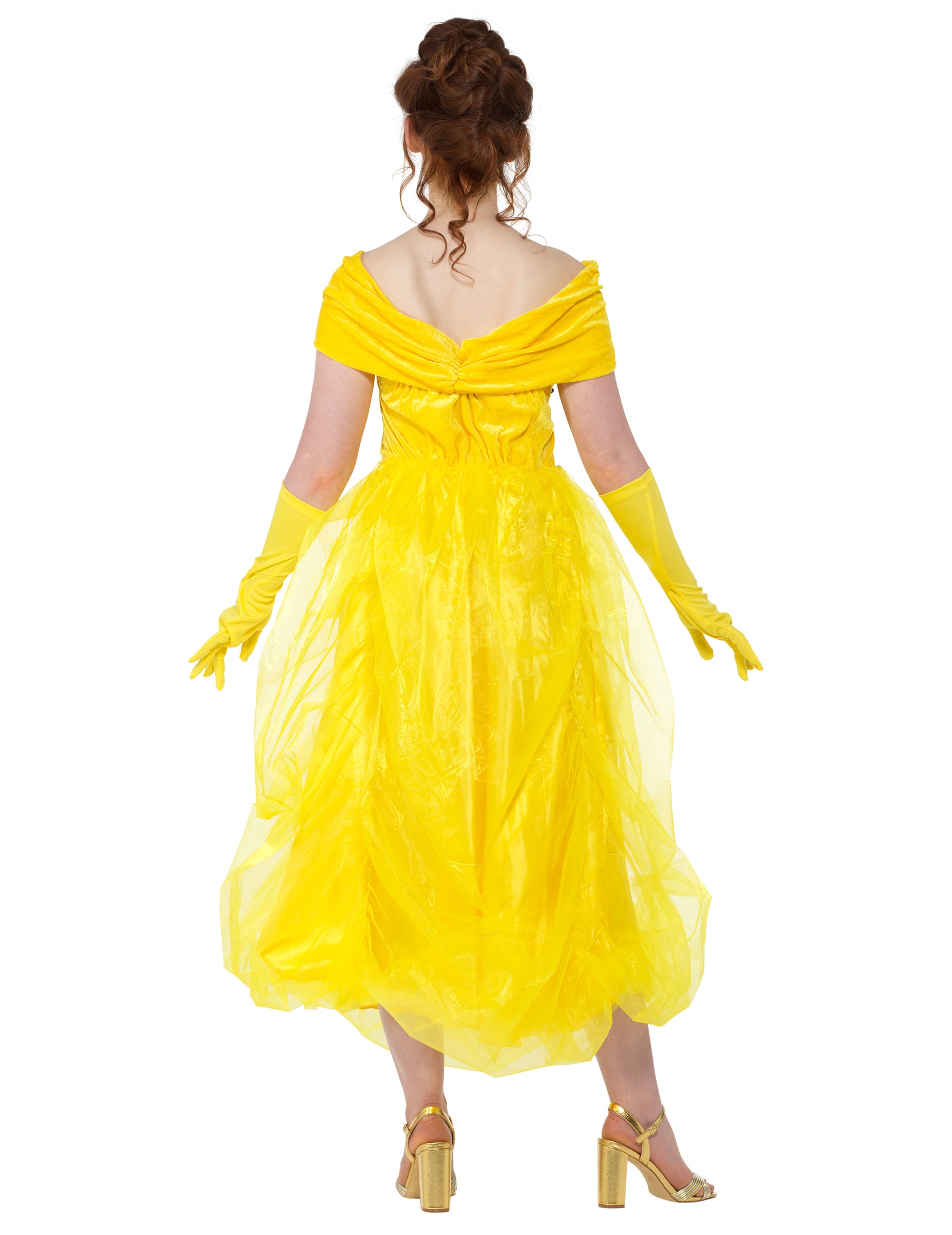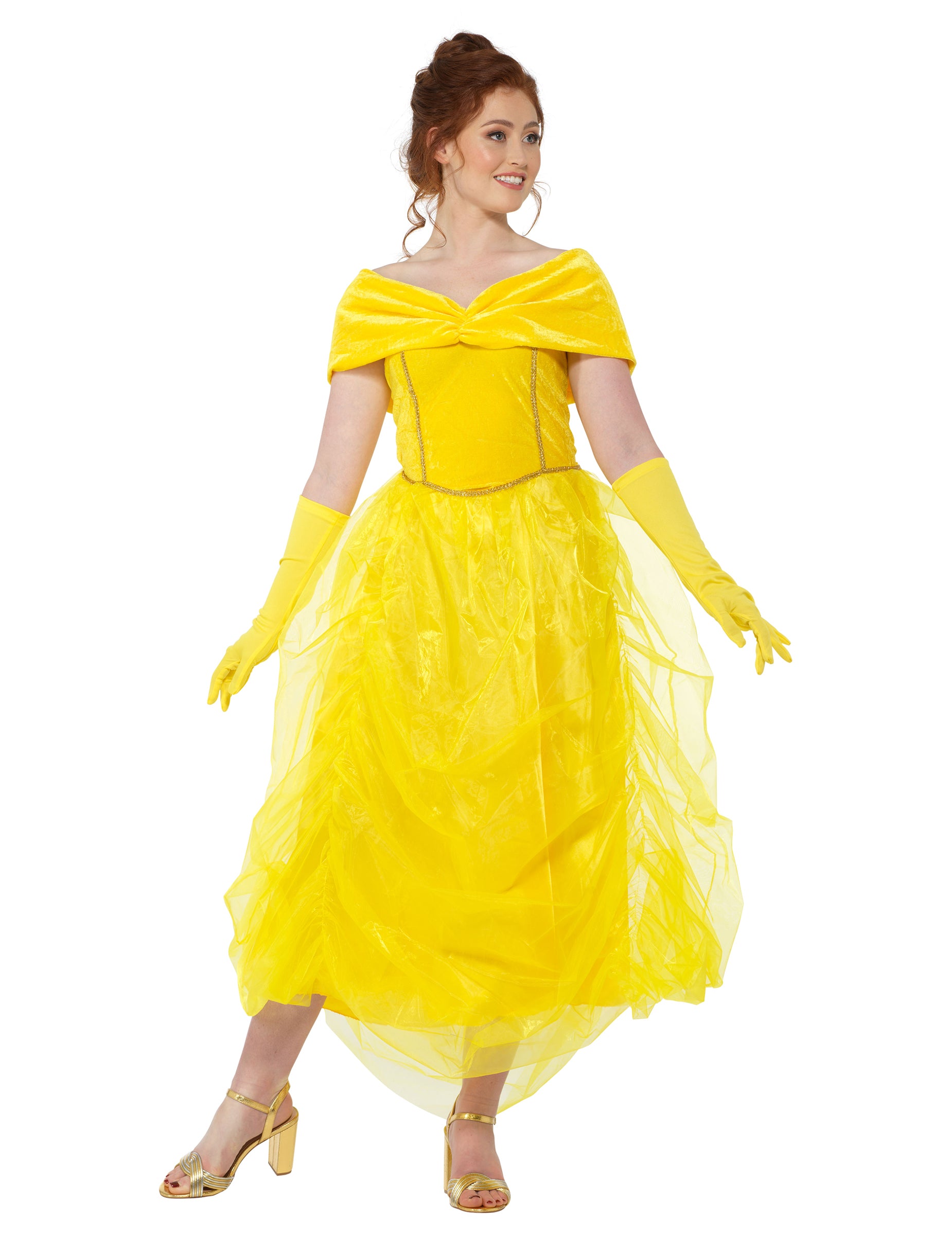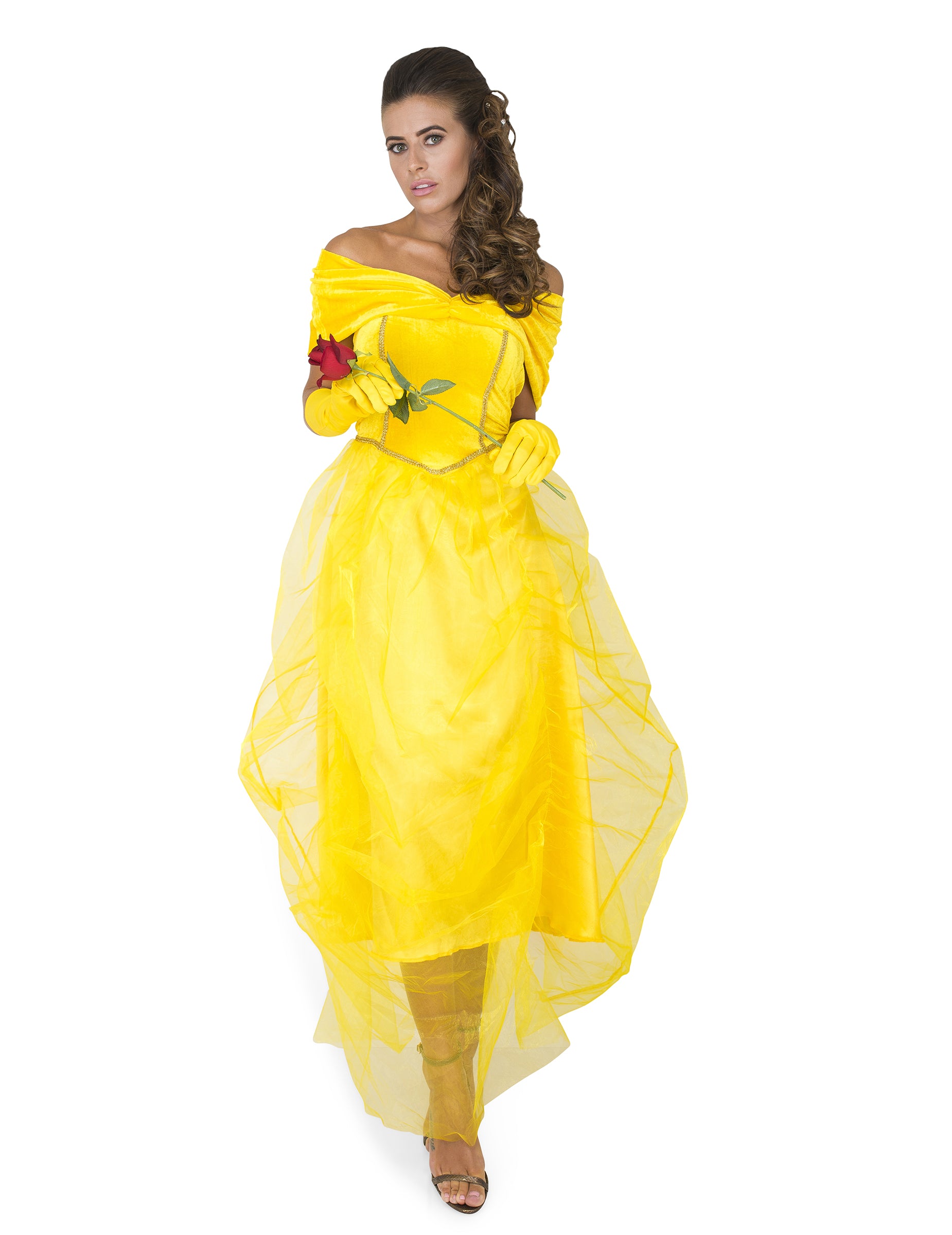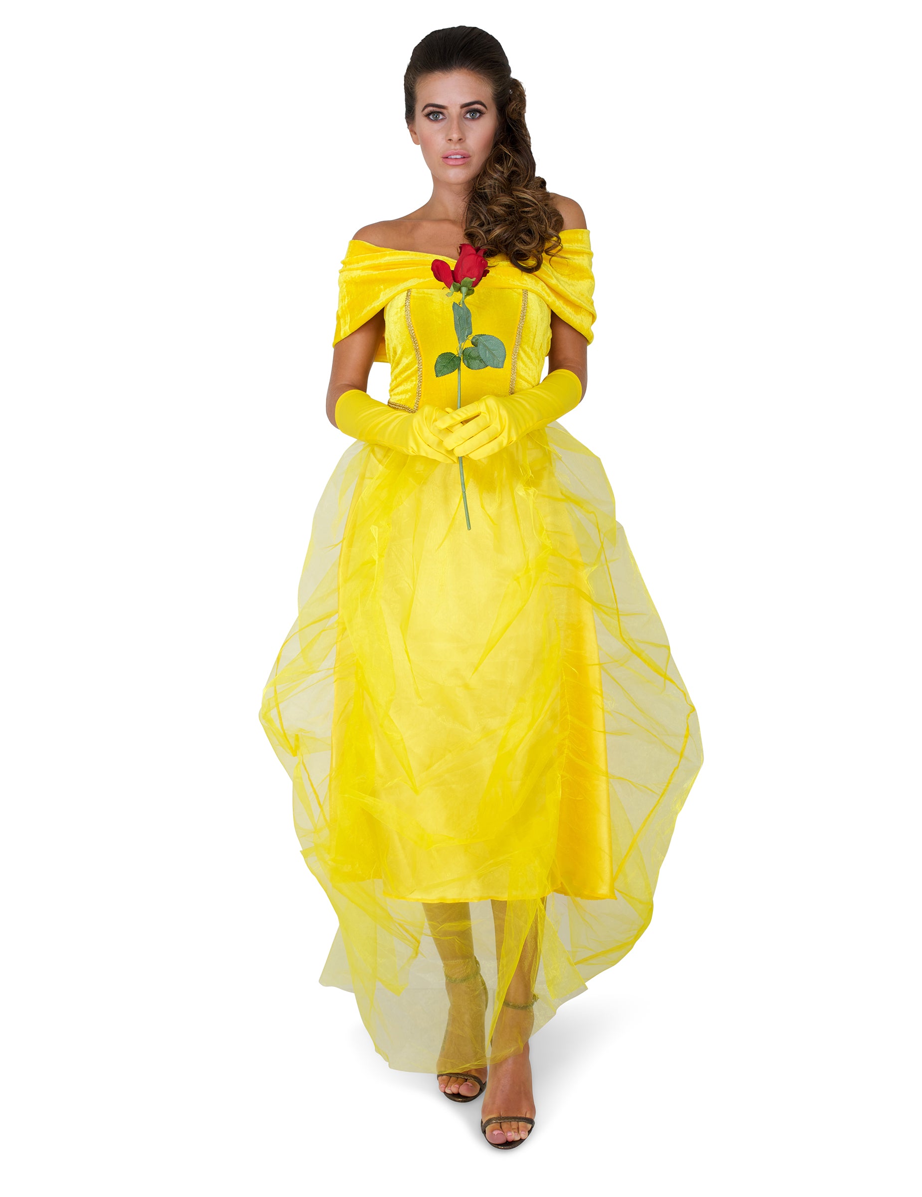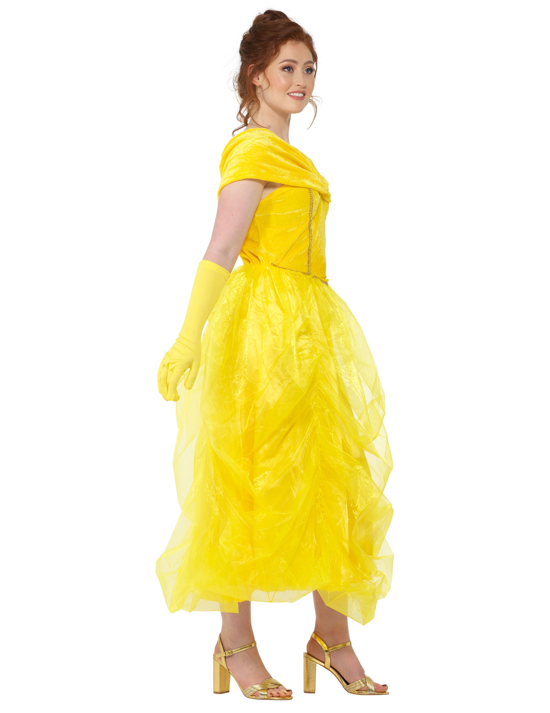 Този красив костюм на принцеса за жени се състои от рокля и чифт ръкавици. В жълт цвят роклята е дълга с банел ръкав за разголени рамене. Долната част на роклята е с красив воал от жълт тюл. Ръкавиците са дълги и жълти в тон с роклята. Тази рокля ще бъде идеална, за да бъдете най-красивите на костюмирано парти с приятели!