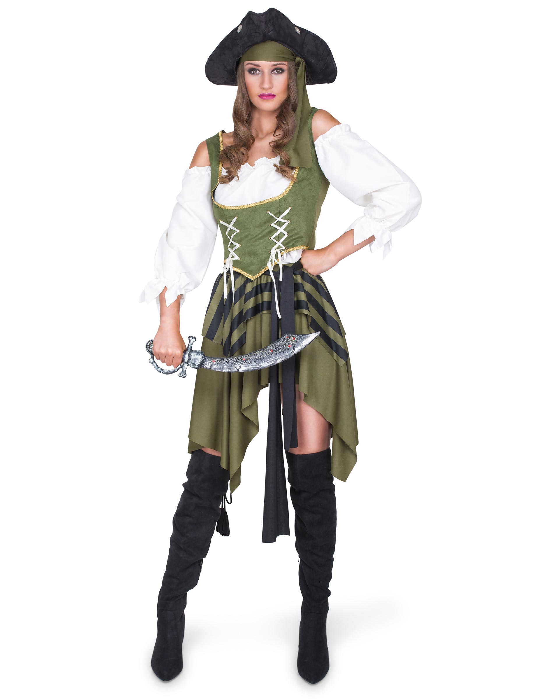 Тази пиратска маскировка се състои от блуза, корсет, пола, банер и връзка за размер. Бялата блуза има ивици ръкави. Полата е хаки на цвят и включва асиметрични разрез и черни ленти. Що се отнася до корсета на каки, той има бяло връзване. Черна връзка трябва да бъде вързана на кръста и да се носи лента за глава на каки в косата, за да завърши тоалета. Този комплект за жени ще бъде перфектен, за да ви превърне в fibblestière по време на вечер с приятели!
