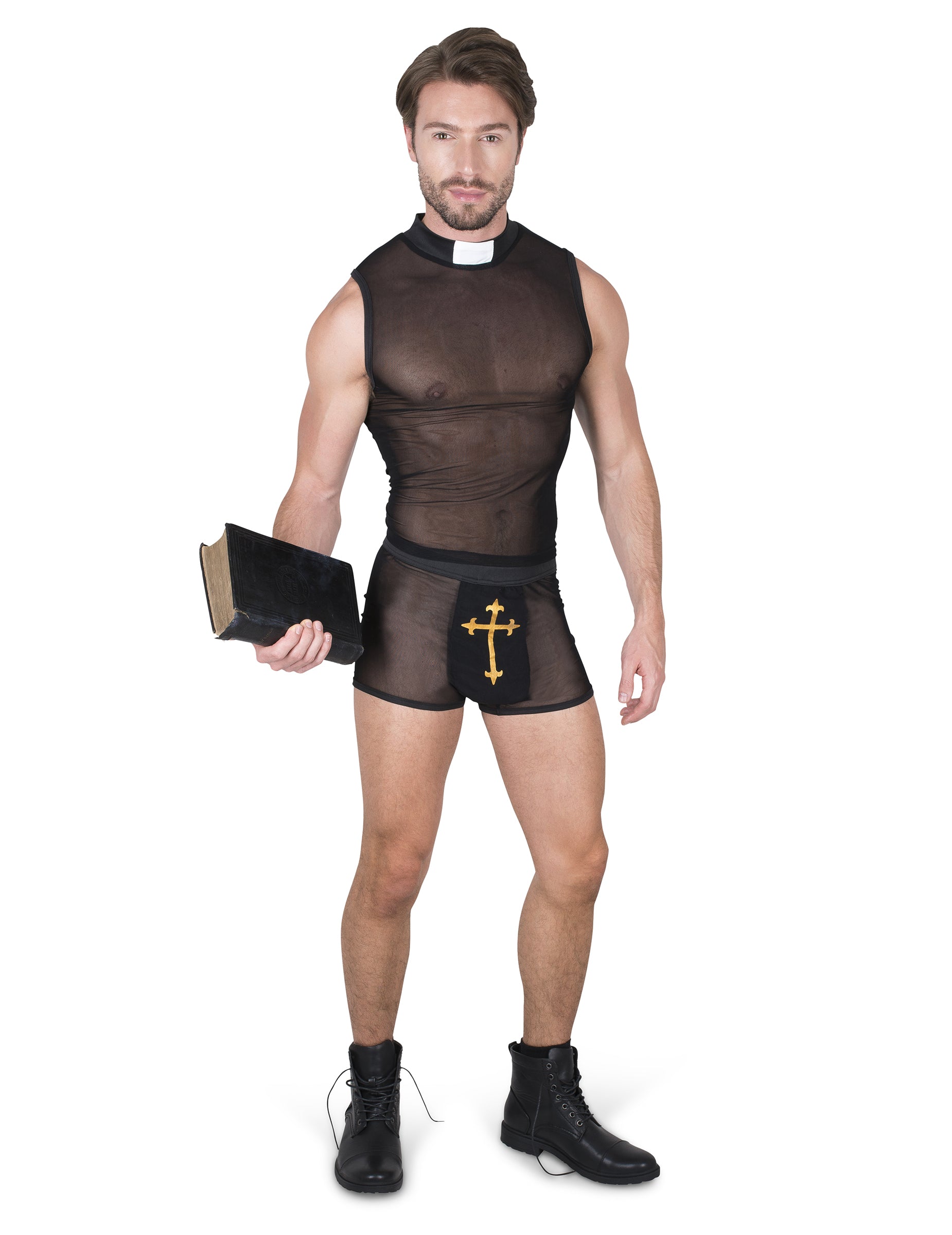 Тази маскировка на свещеника се състои от топ и къси панталони (обувките и Библията не са включени). Горната част е черна прозрачна и без ръкави. Що се отнася до късите панталони, той също е прозрачен черен със златен цветен кръст отпред. Този комплект ще ви направи човекът на вечерта, прикрит като свещеник, проповядвайки добрата дума по време на прикрито или тематично парти!